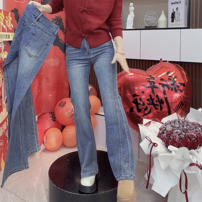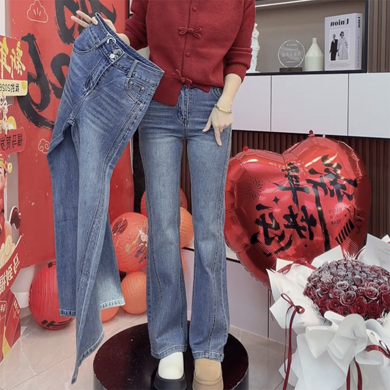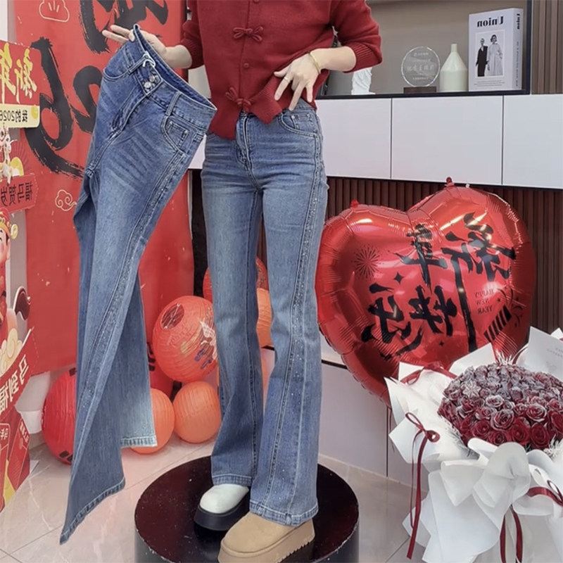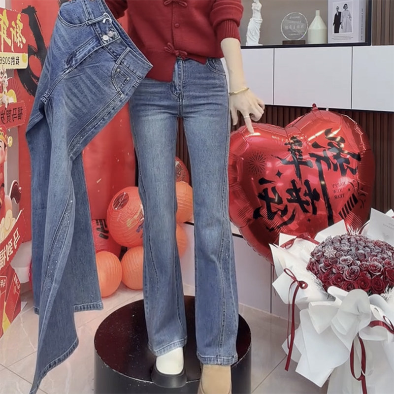 春季新款微喇烫钻弹力牛仔裤女2026大码显瘦遮肉时尚减龄喇叭裤子