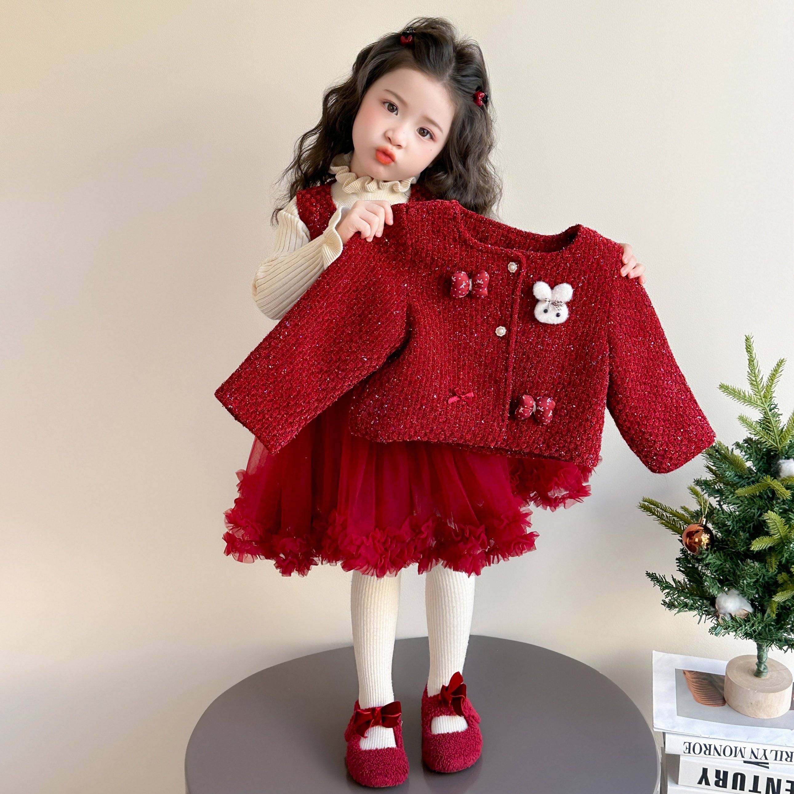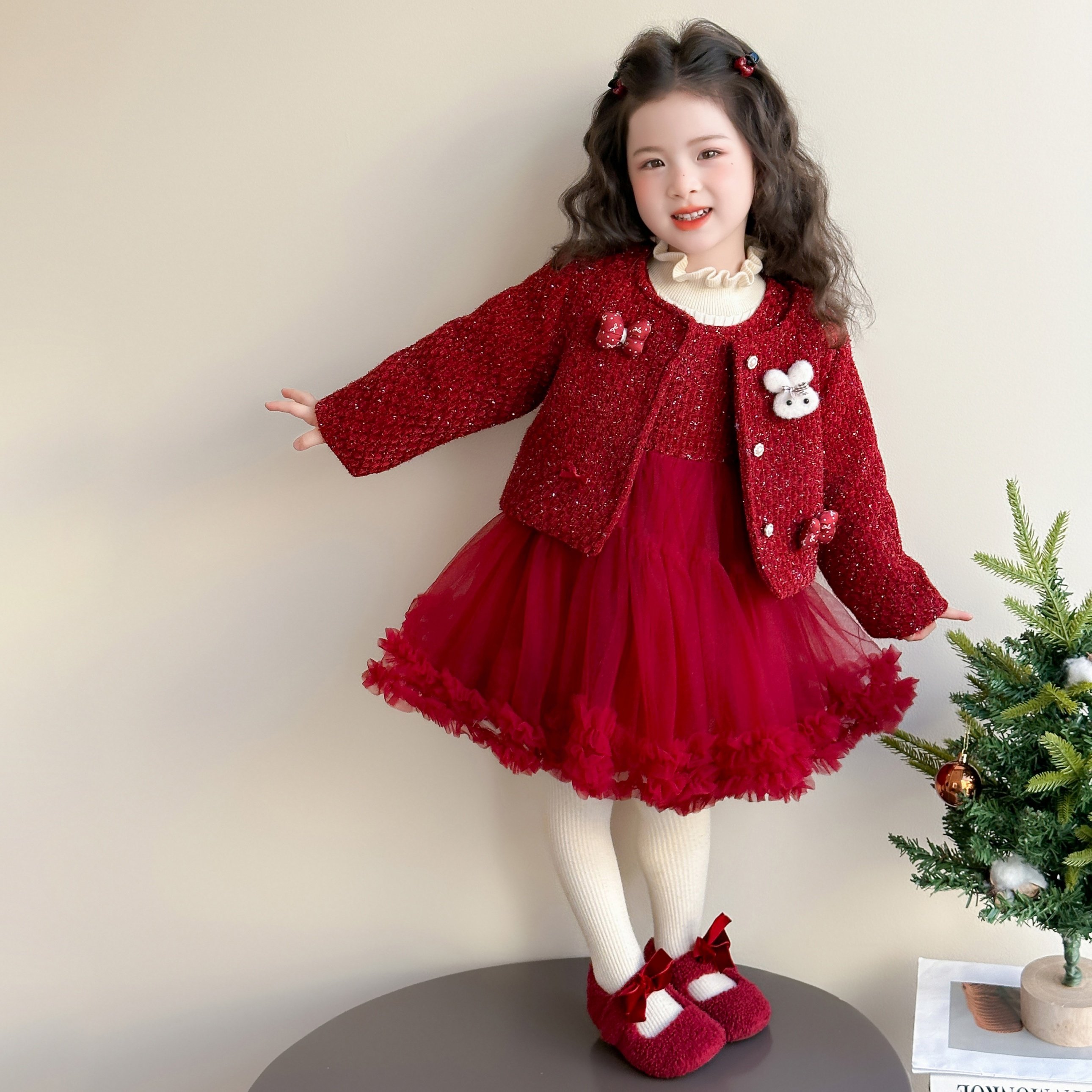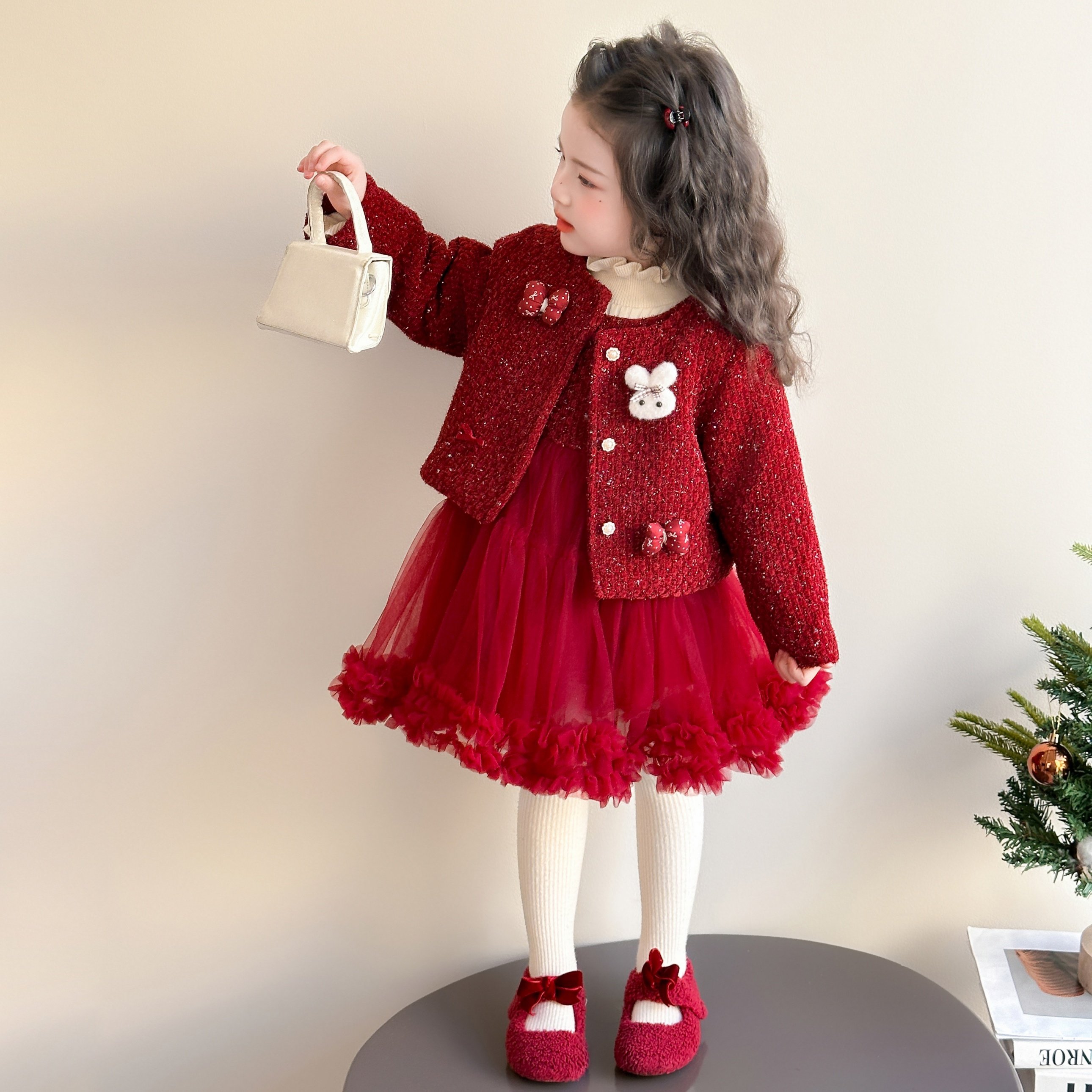 女童冬装红色套装小香风连衣裙儿童新年拜年服女宝宝圣诞公主裙子