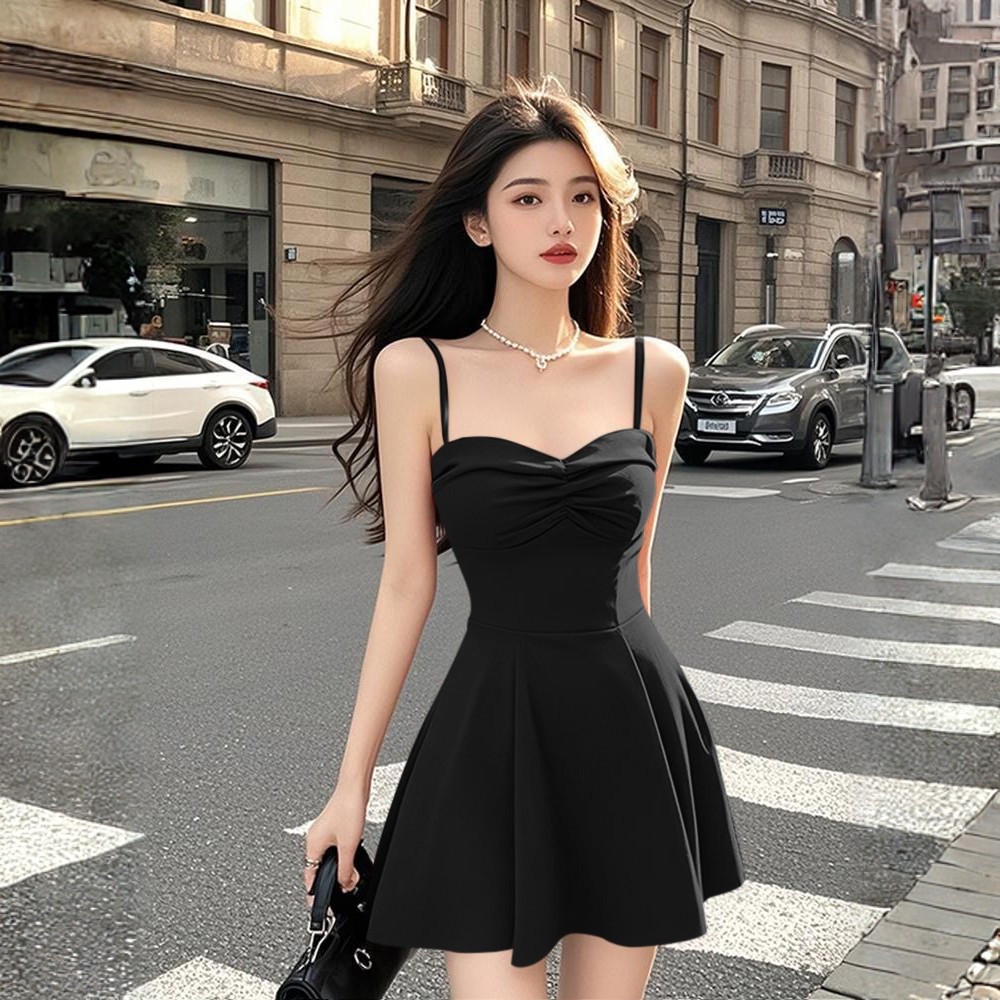 法式轻奢高级感连衣裙女夏新款修身显瘦小个子独特褶皱气质吊带裙