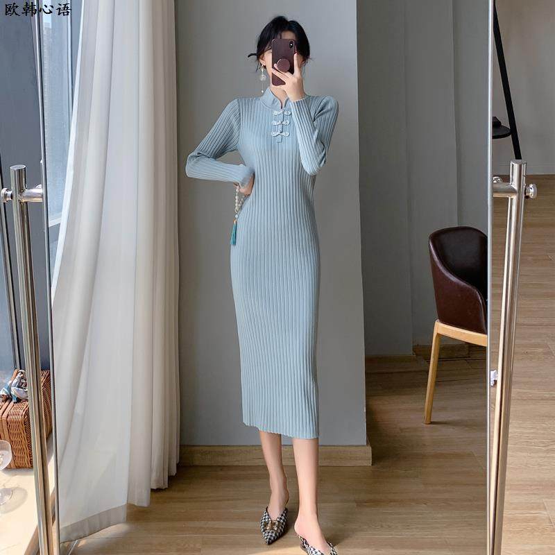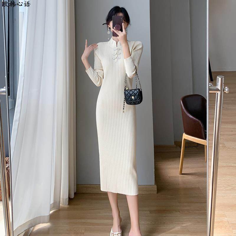 新中式改良白色旗袍针织毛衣连衣裙女秋冬修身配大衣内搭打底长裙
