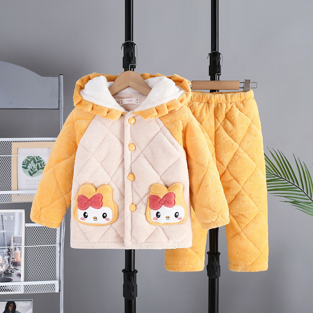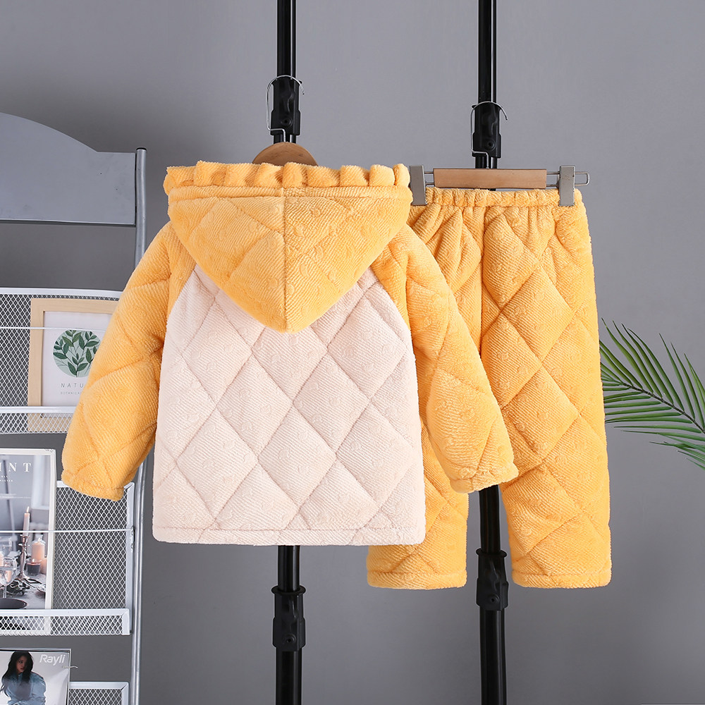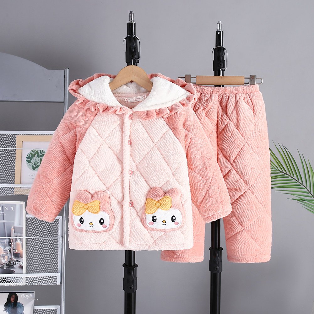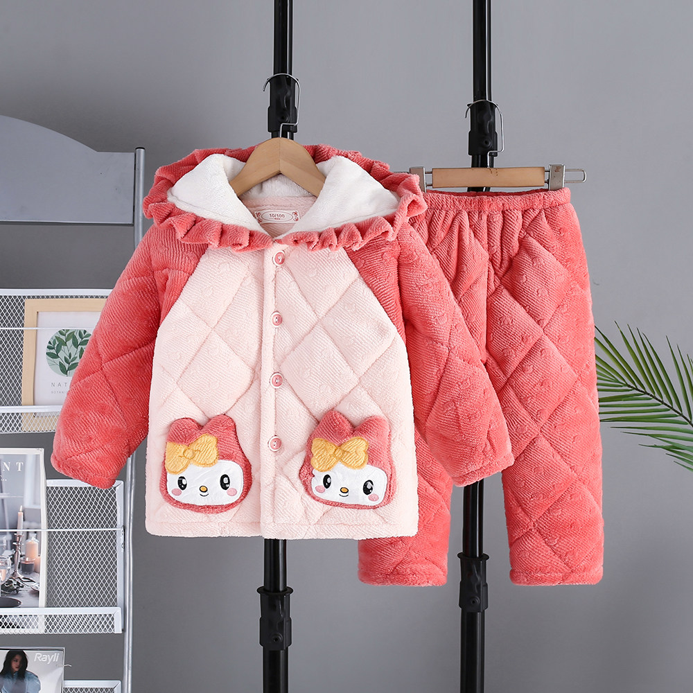 冬季三层夹棉女孩厚睡衣卡通连帽睡衣女童加绒加厚家居服套装