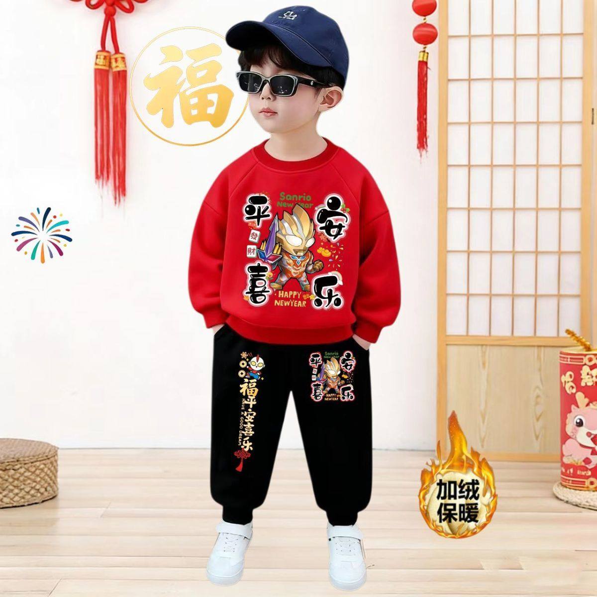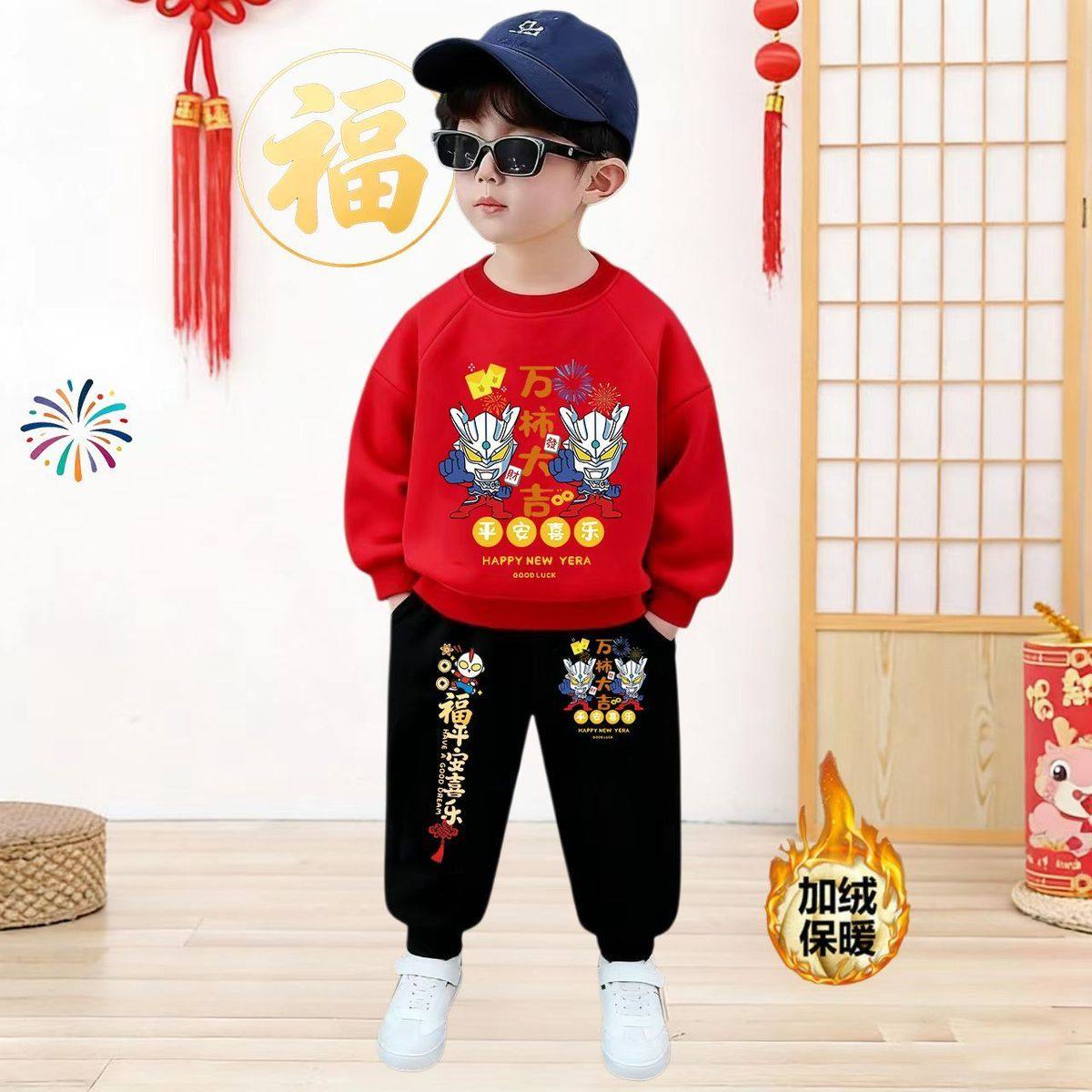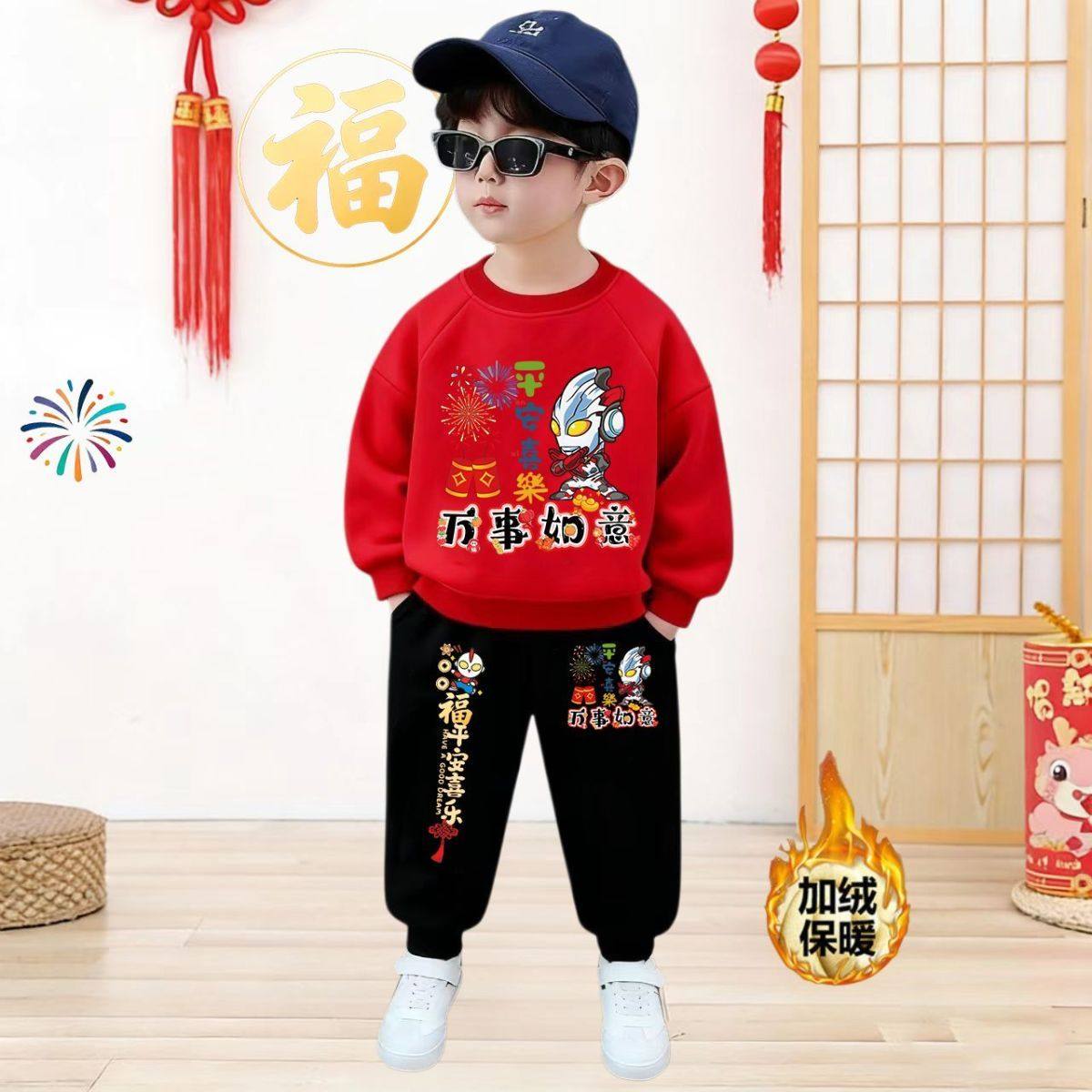 男童新年卫衣套装秋冬加绒款潮酷奥特曼儿童红色拜年服中国风冬装
