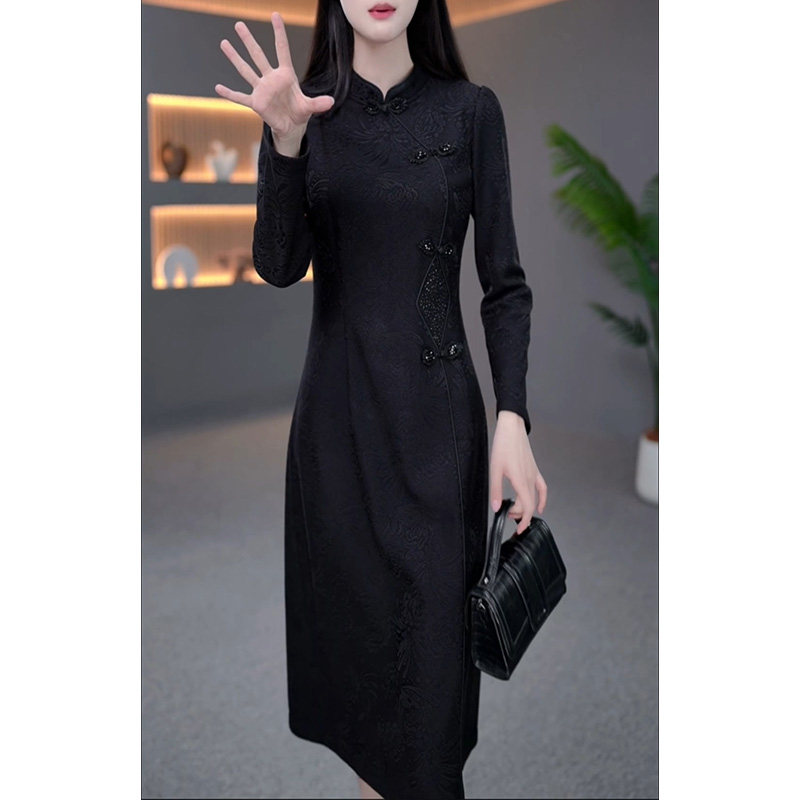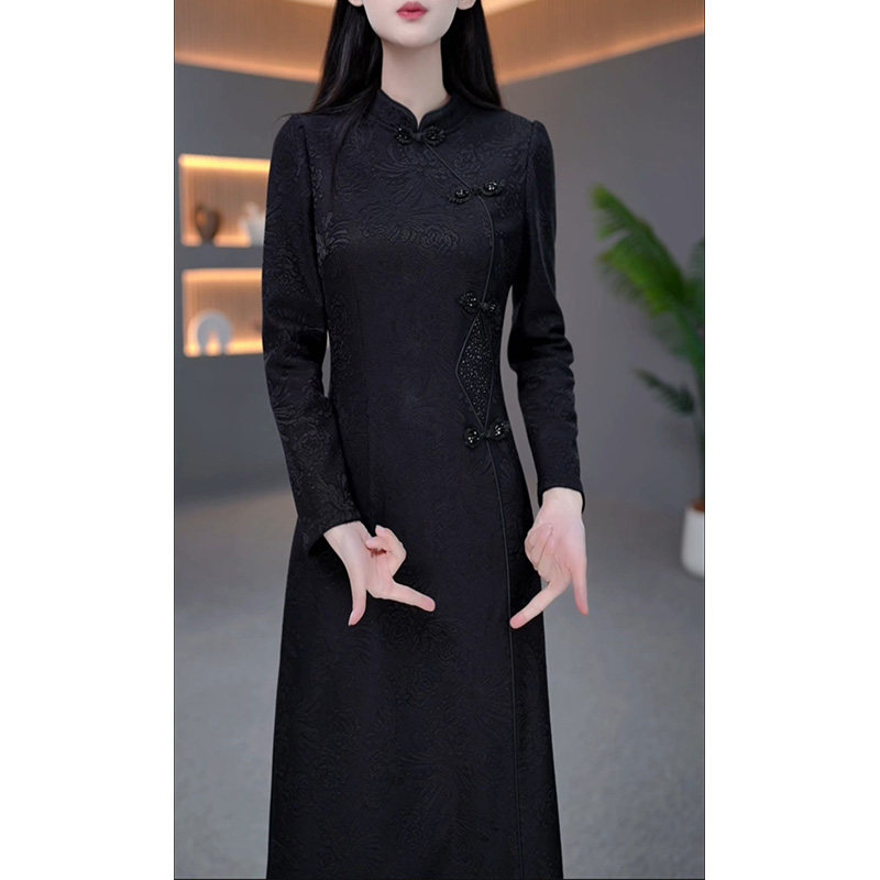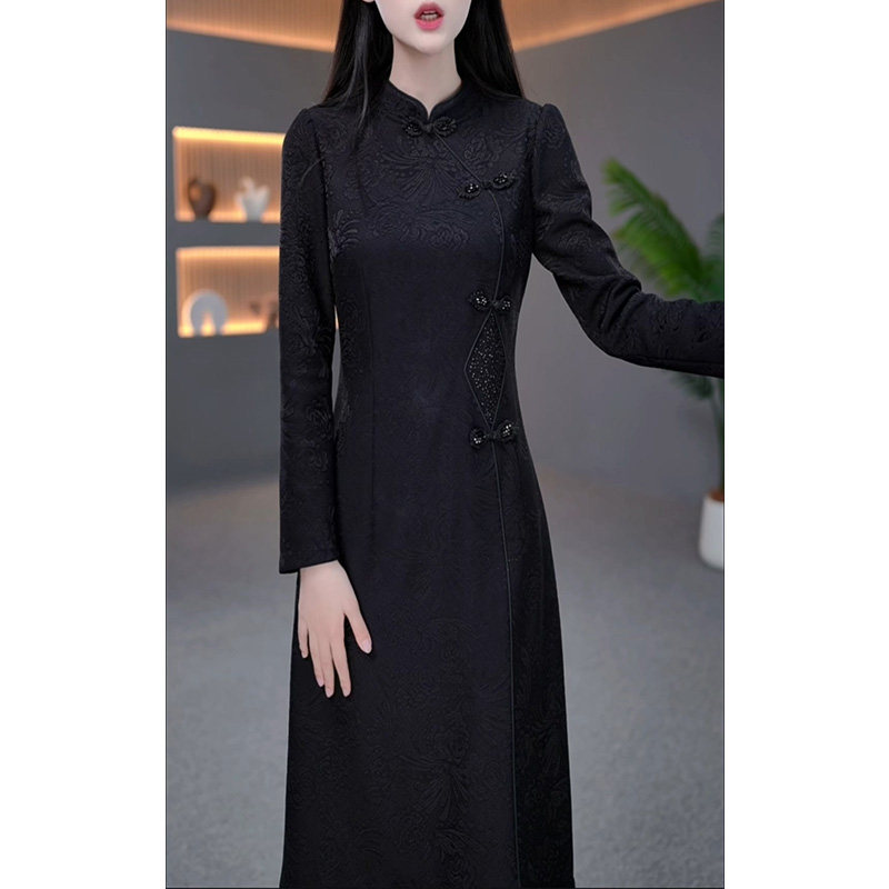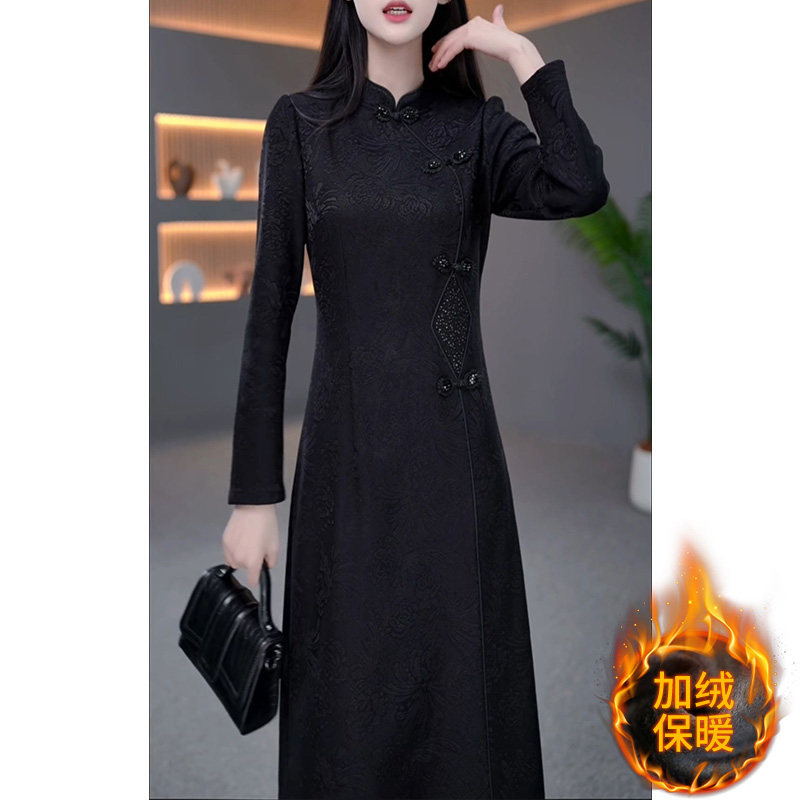 国风改良旗袍长袖连衣裙女2025秋冬新款配大衣妈妈加绒加厚裙子