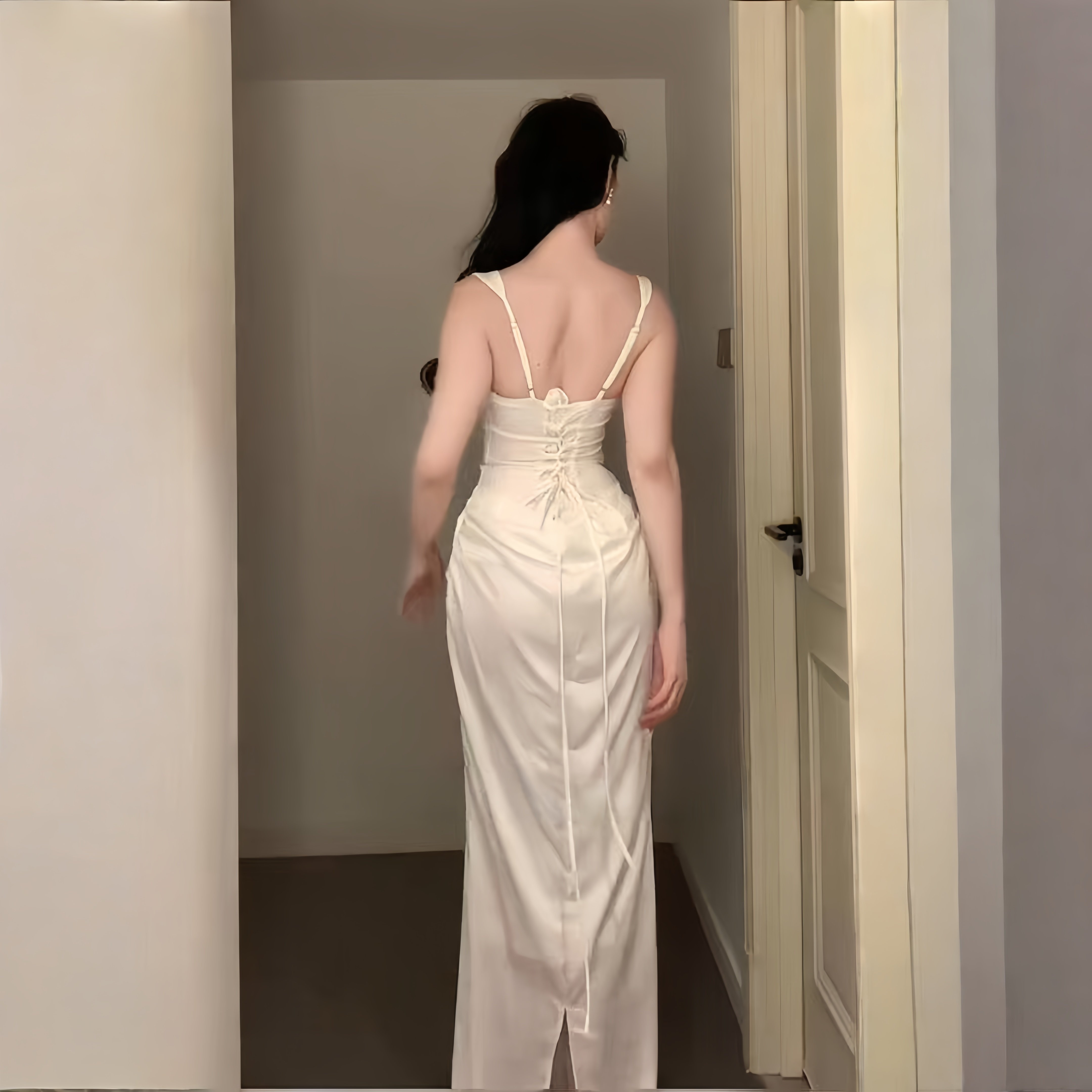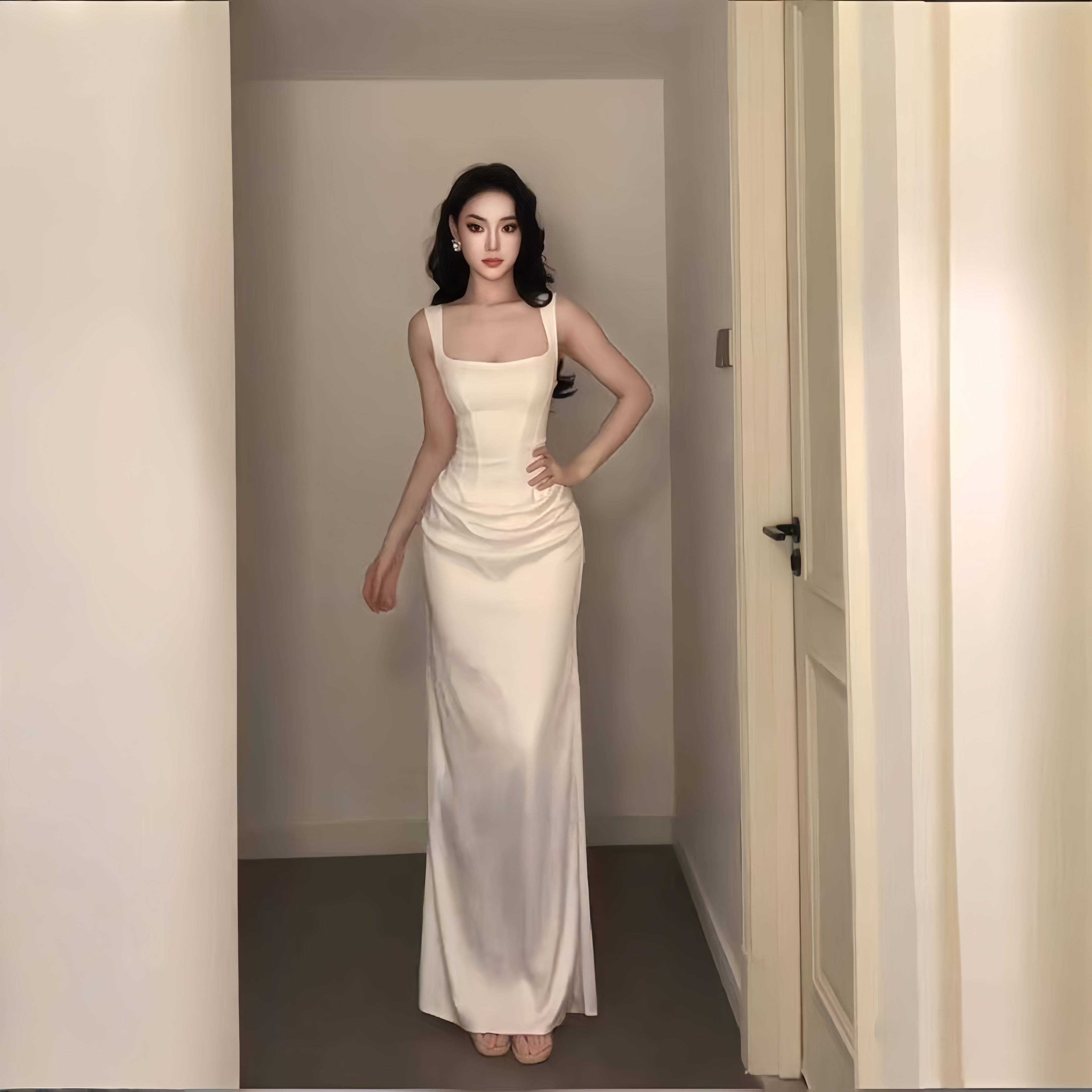 小可wiwi法式轻奢优雅白色方领吊带连衣裙女收腰显瘦修身长裙礼服