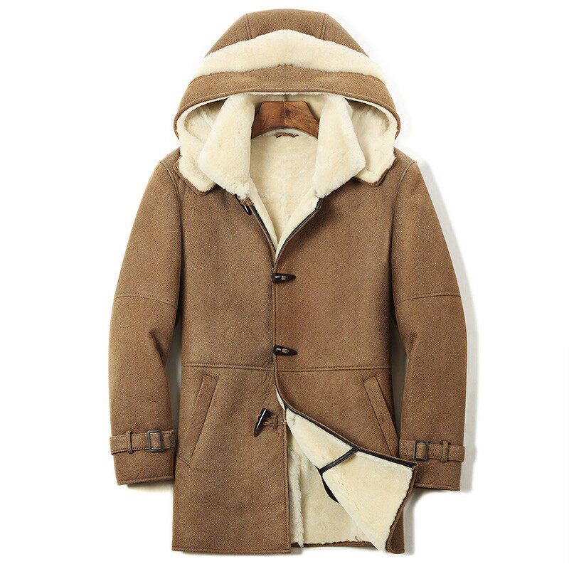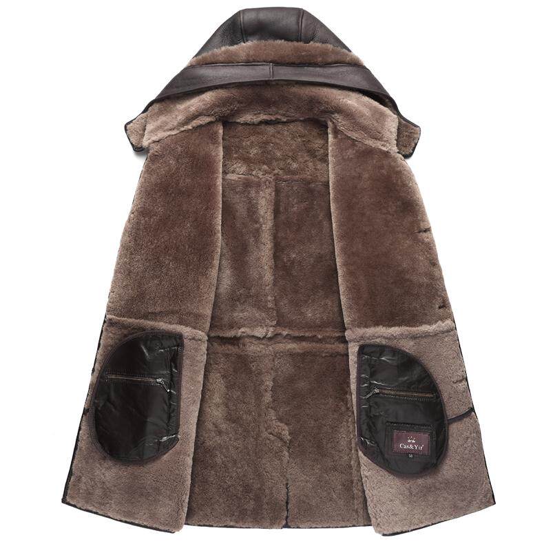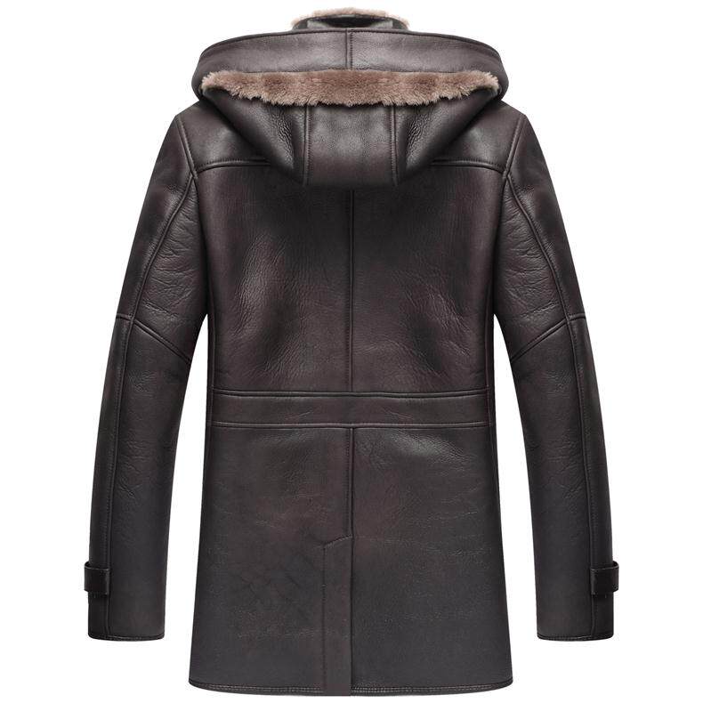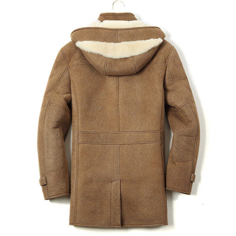 原生态皮毛一体连帽冬季外套男装中长款大衣真皮衣男士加厚款绵羊