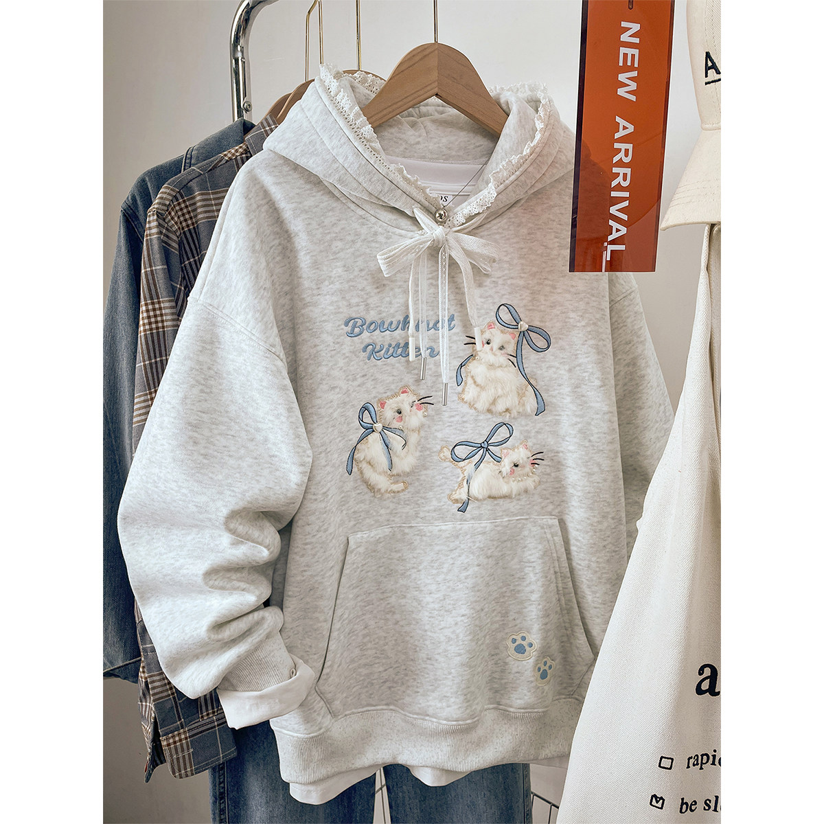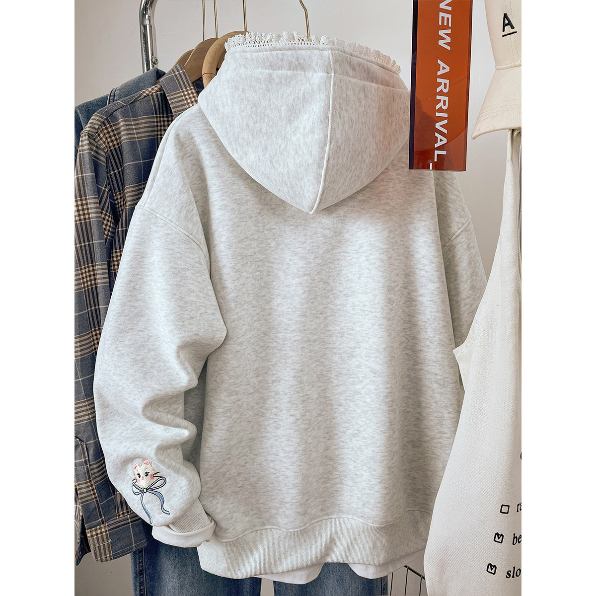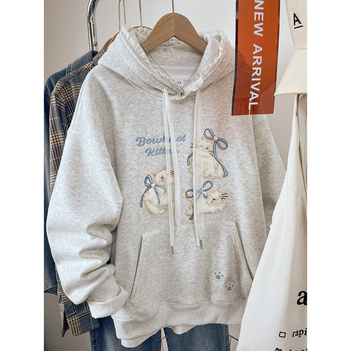 2026新款蕾丝连帽卫衣女款秋冬季宽松显瘦加绒加厚刺绣上衣服外套