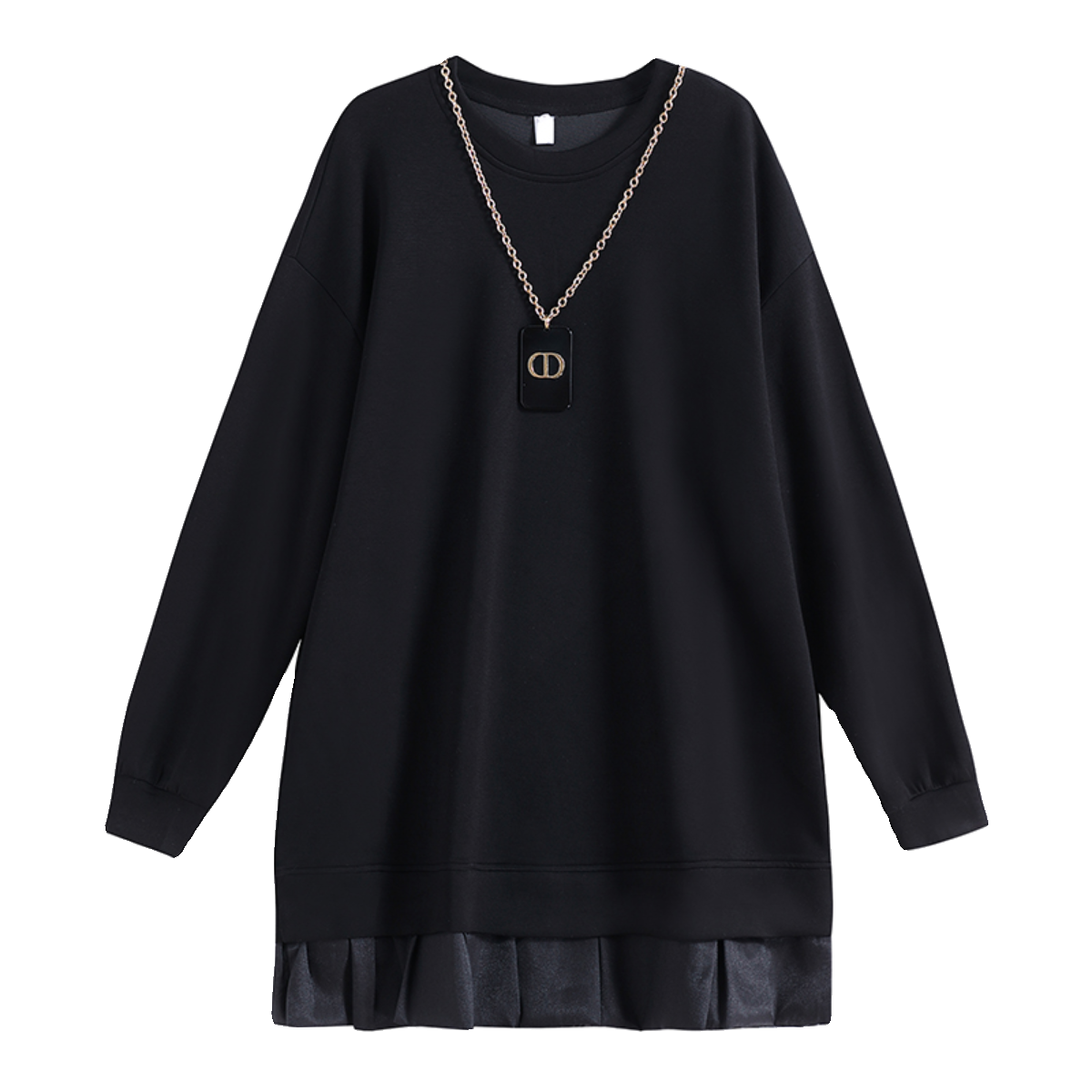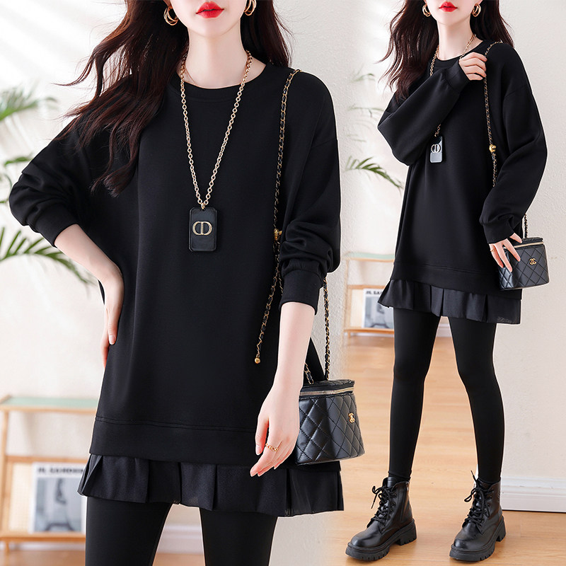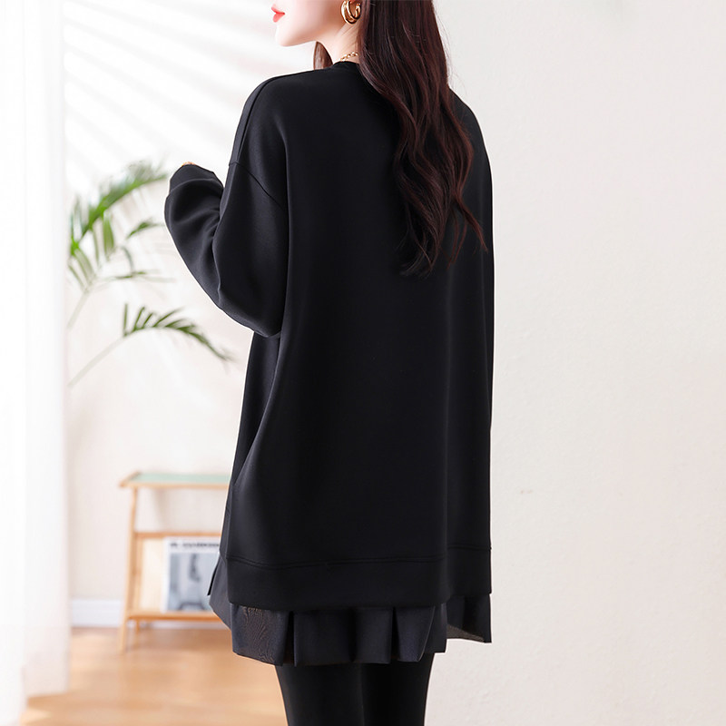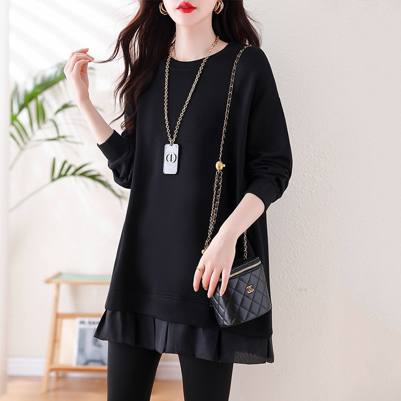 休闲圆领长袖卫衣女秋冬装新款荷叶边拼接中长款内搭外穿打底上衣