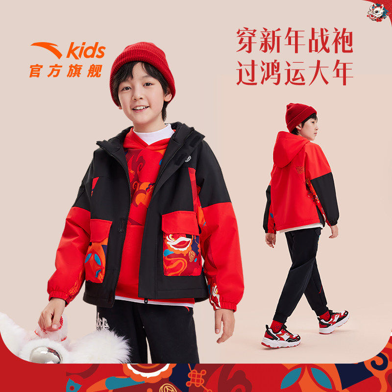 安踏儿童外套春季加绒保暖潮酷上衣新年红色喜庆衣服男童印花外套