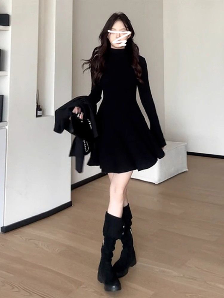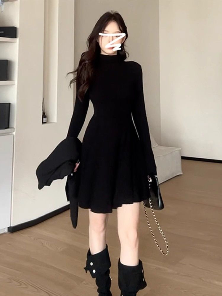 法式半高领配大衣内搭黑色连衣裙女秋冬季赫本高级感气质打底短裙