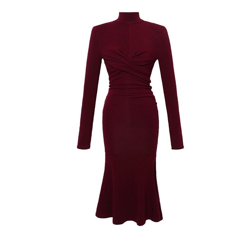 酒红色长袖高领毛衣连衣裙秋季打底包臀气质长款修身针织鱼尾裙子