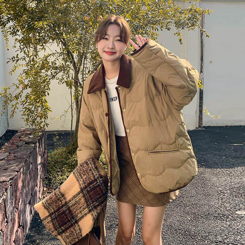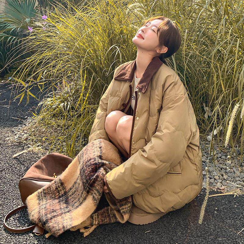 卡其色短款羽绒棉服女2024年冬季新款韩版慵懒风休闲翻领夹棉外套