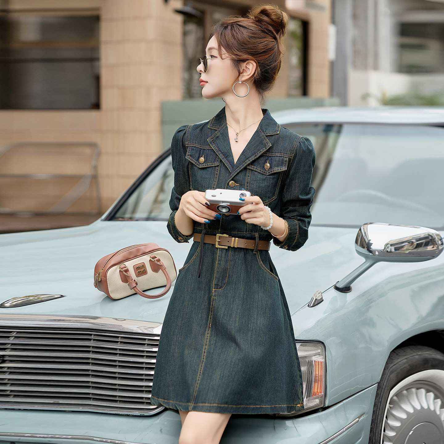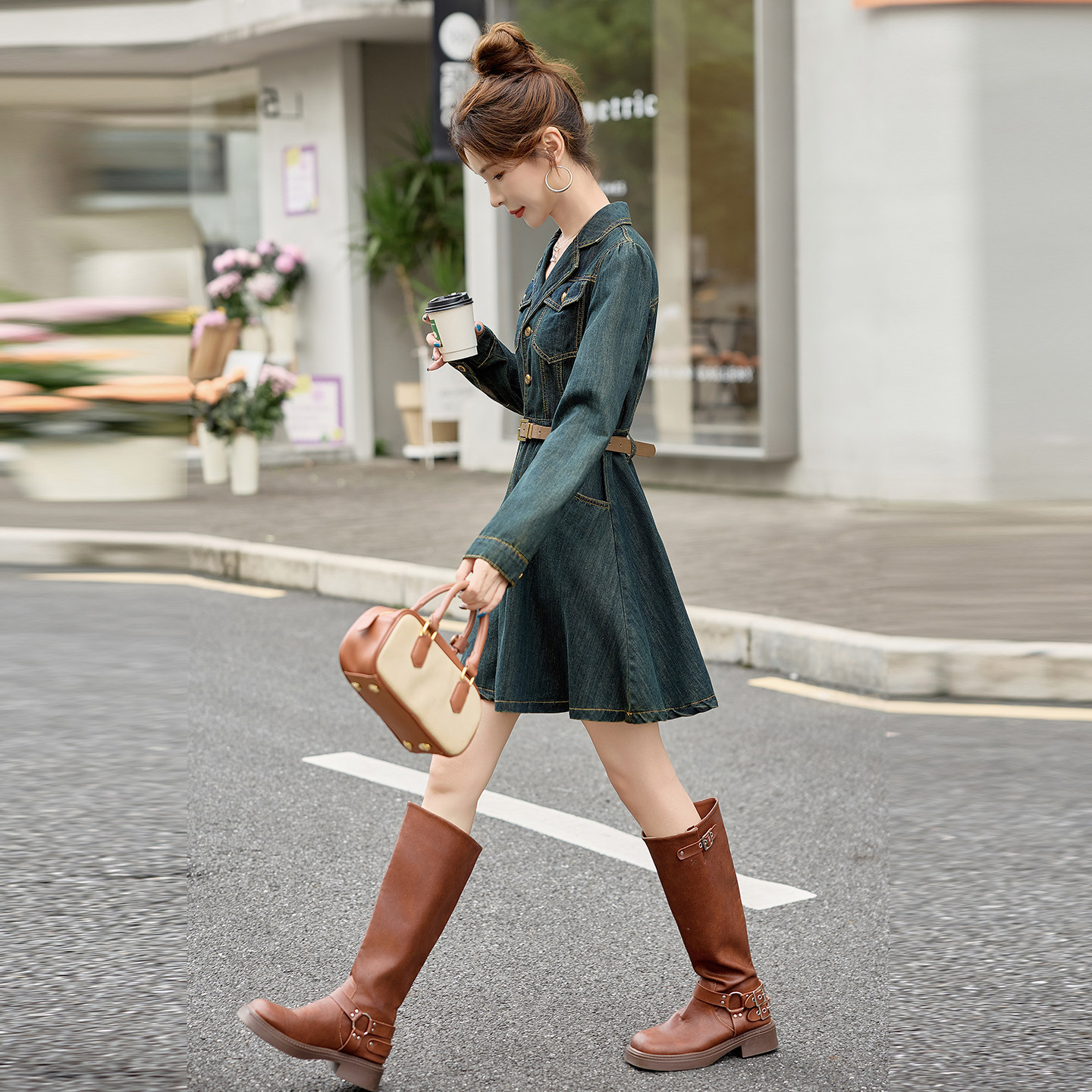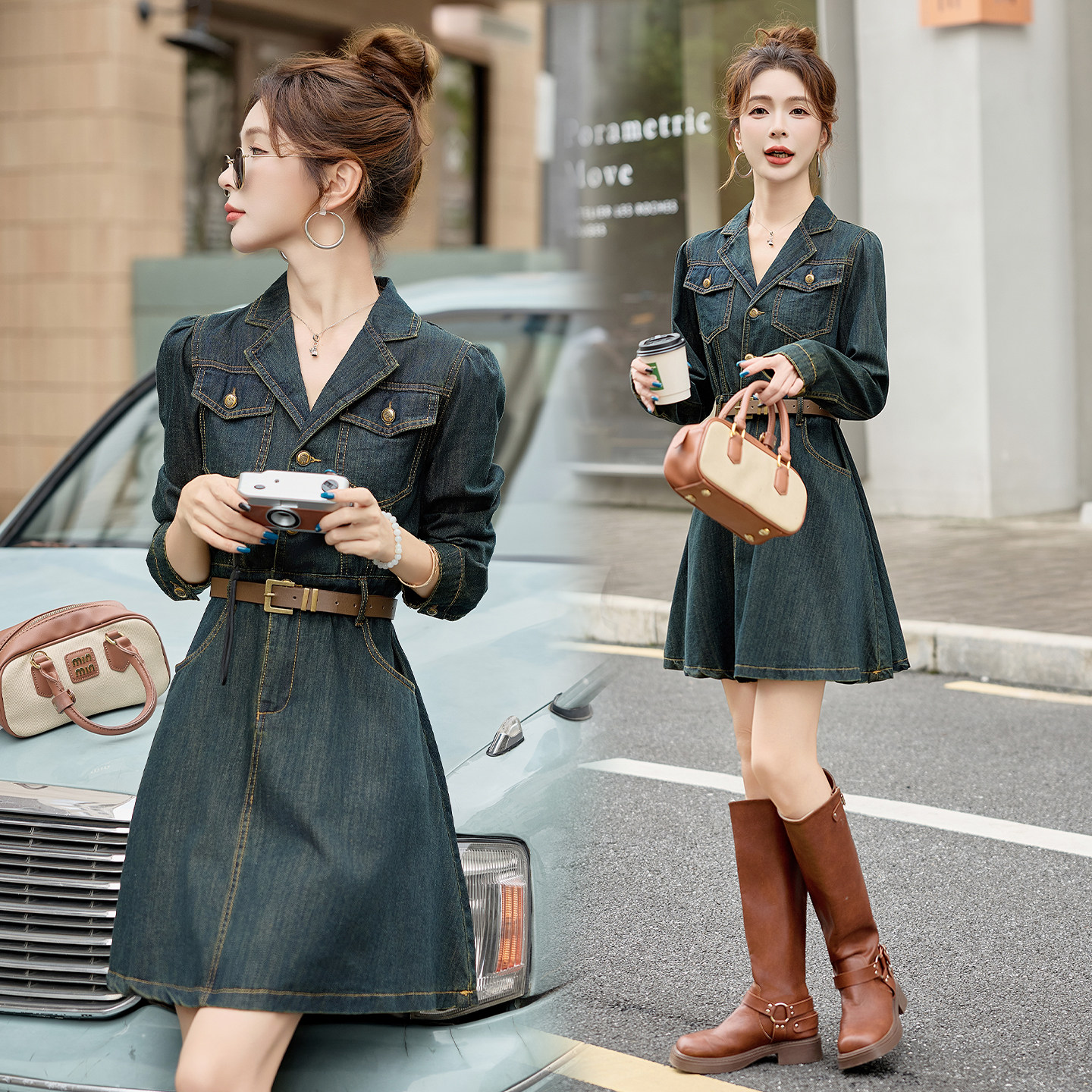 2025早春秋新款轻奢高级感长袖牛仔连衣裙显瘦小个子高腰A字裙子