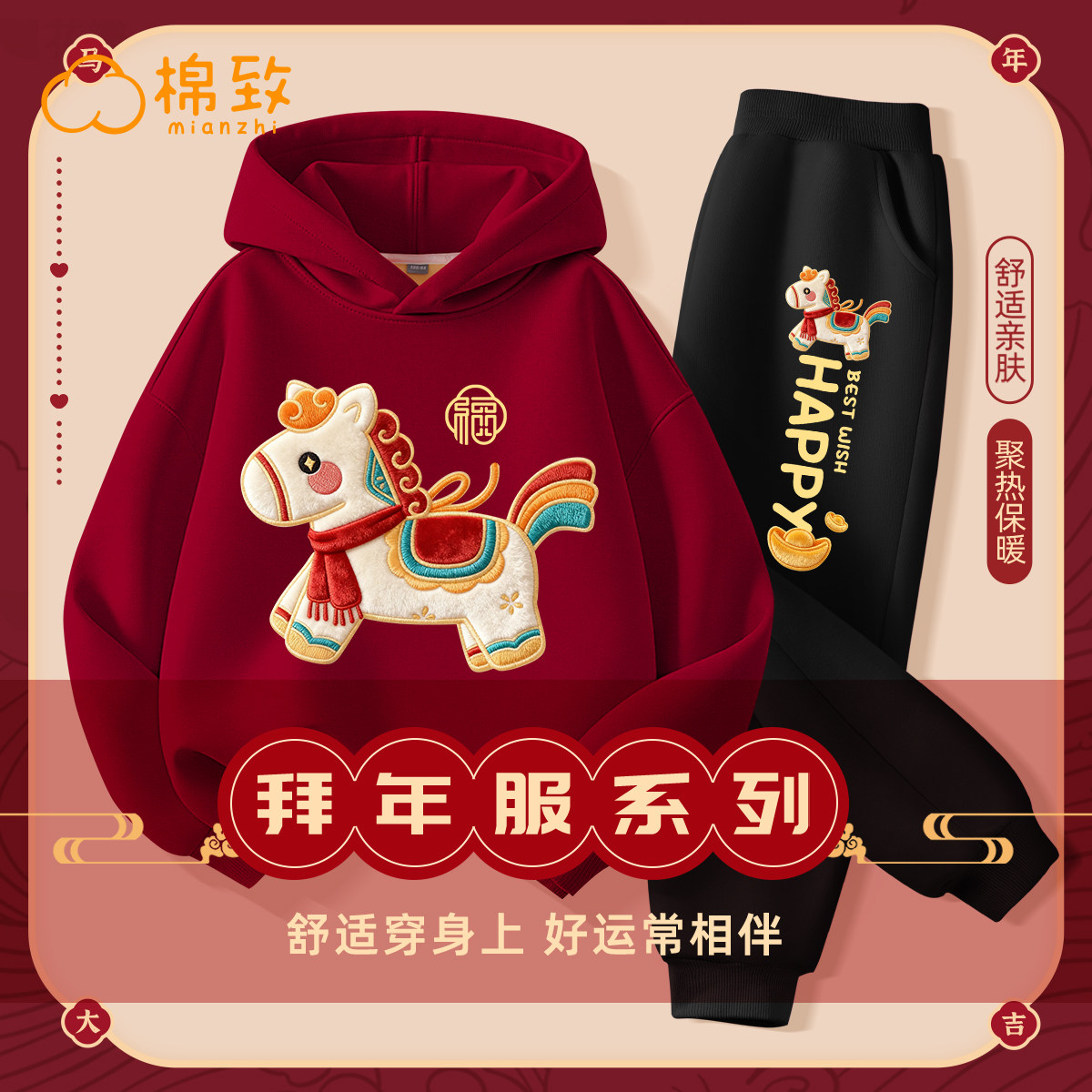 棉致儿童拜年服男童过年衣服2026马年新年本命年红色喜庆男孩套装