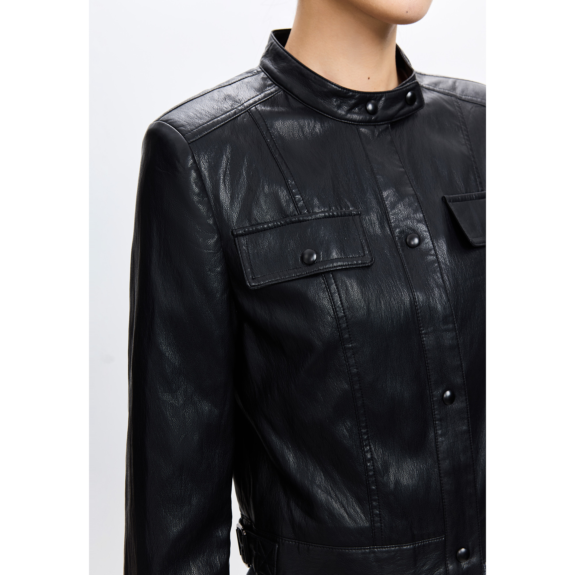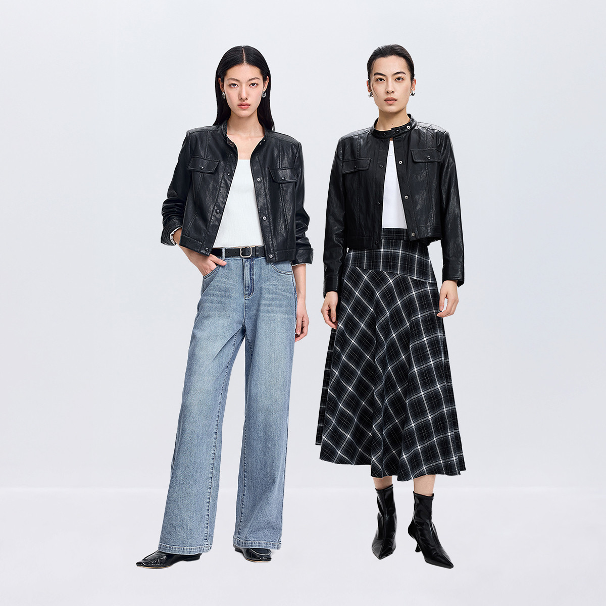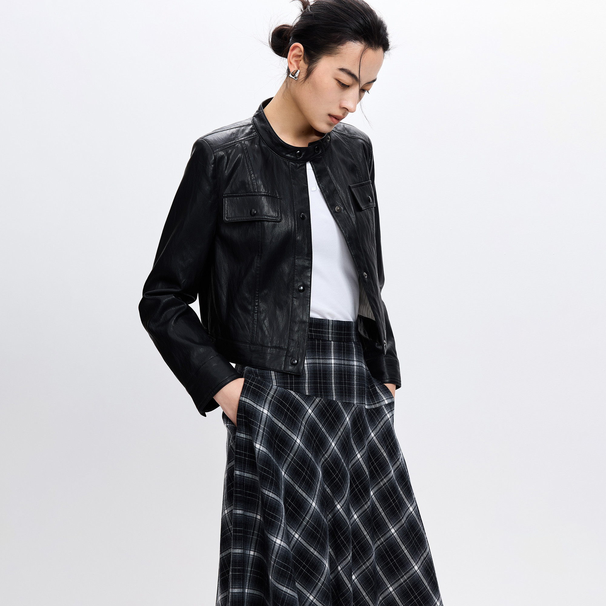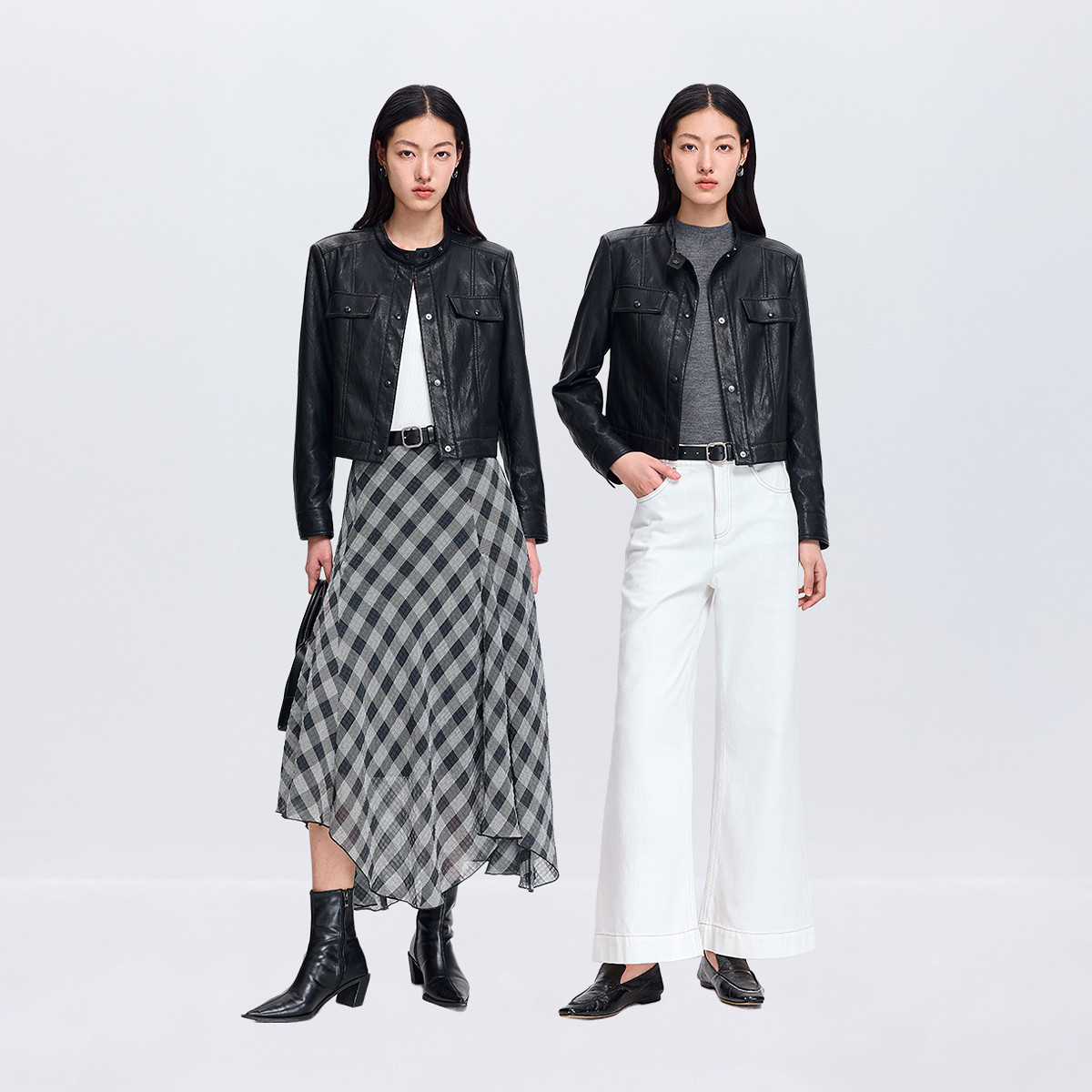 LILY2026春新款女装小立领正肩休闲气质通勤机车夹克上衣皮衣外套