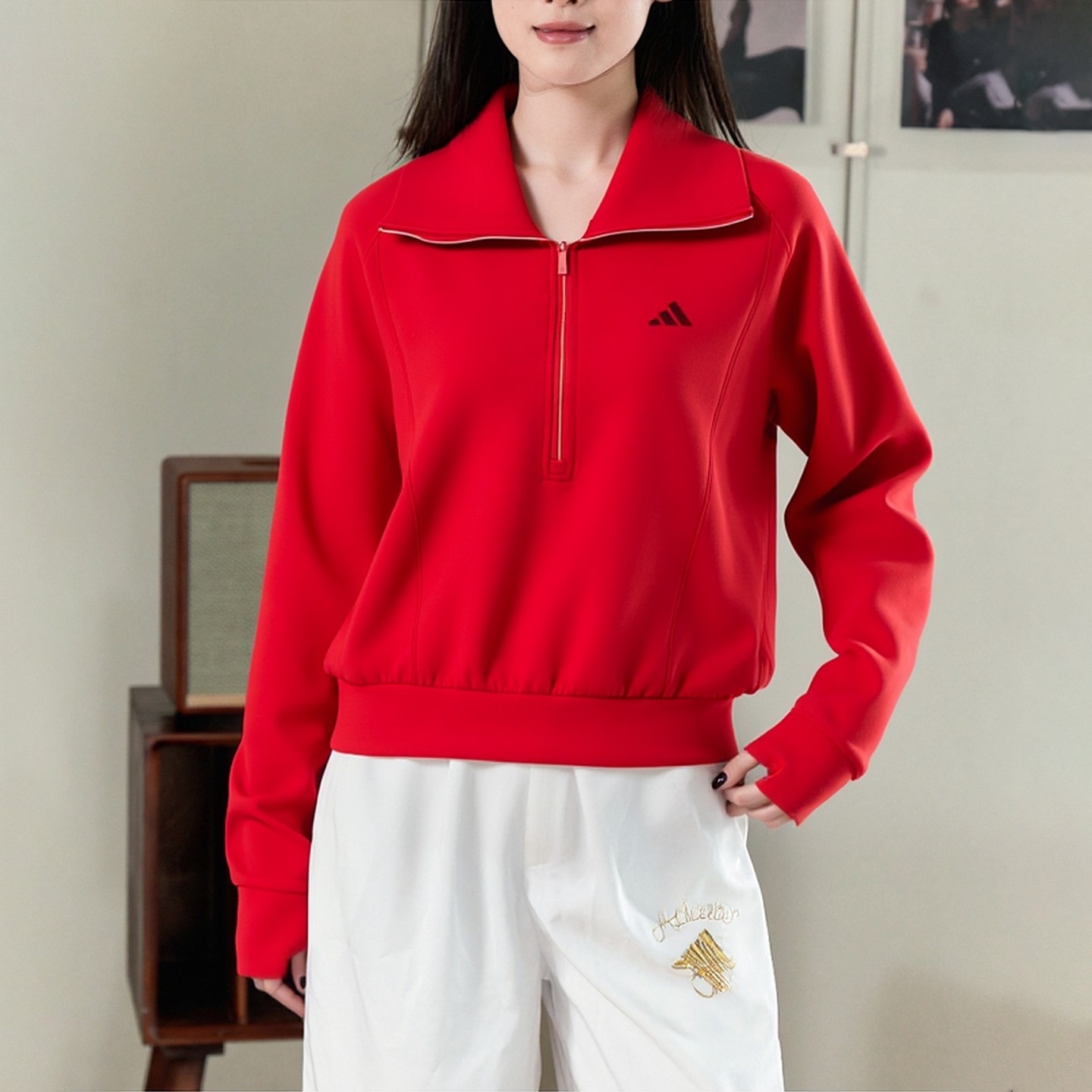 阿迪达斯女装新年款红色套装半拉链卫衣直筒长裤子26春运动两件套