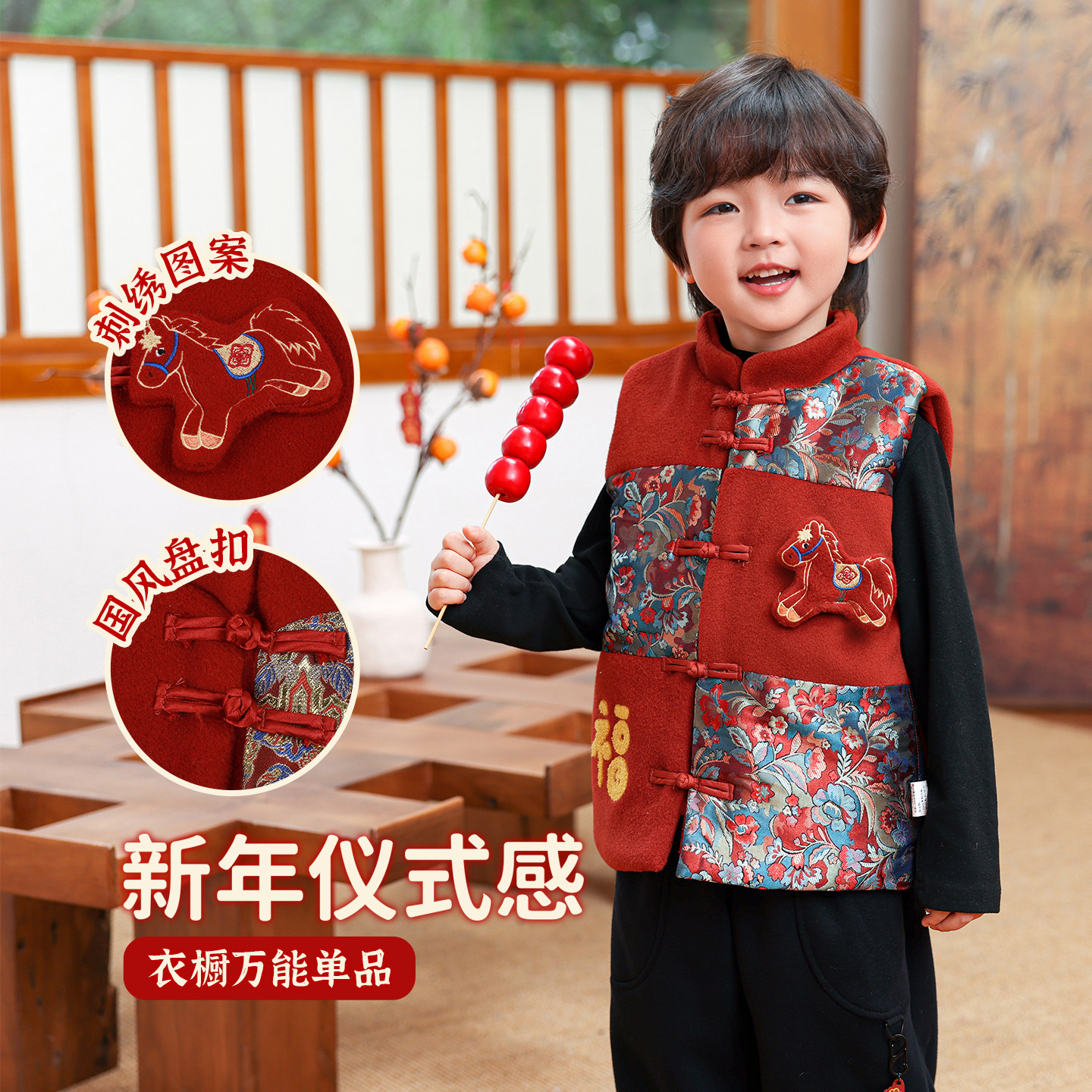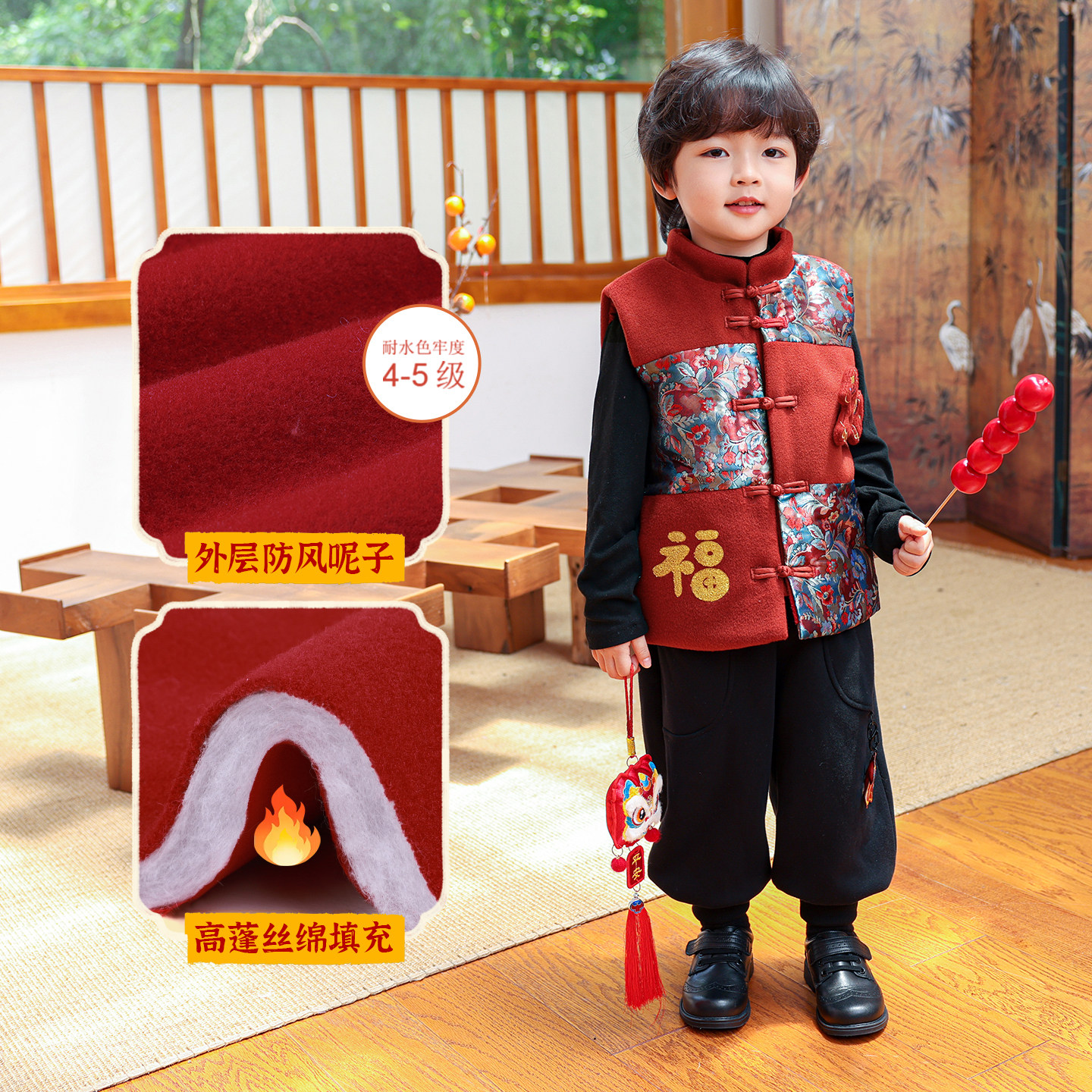 儿童拜年服冬男童过年衣服红色马甲中式国风男孩马年新年冬装年服