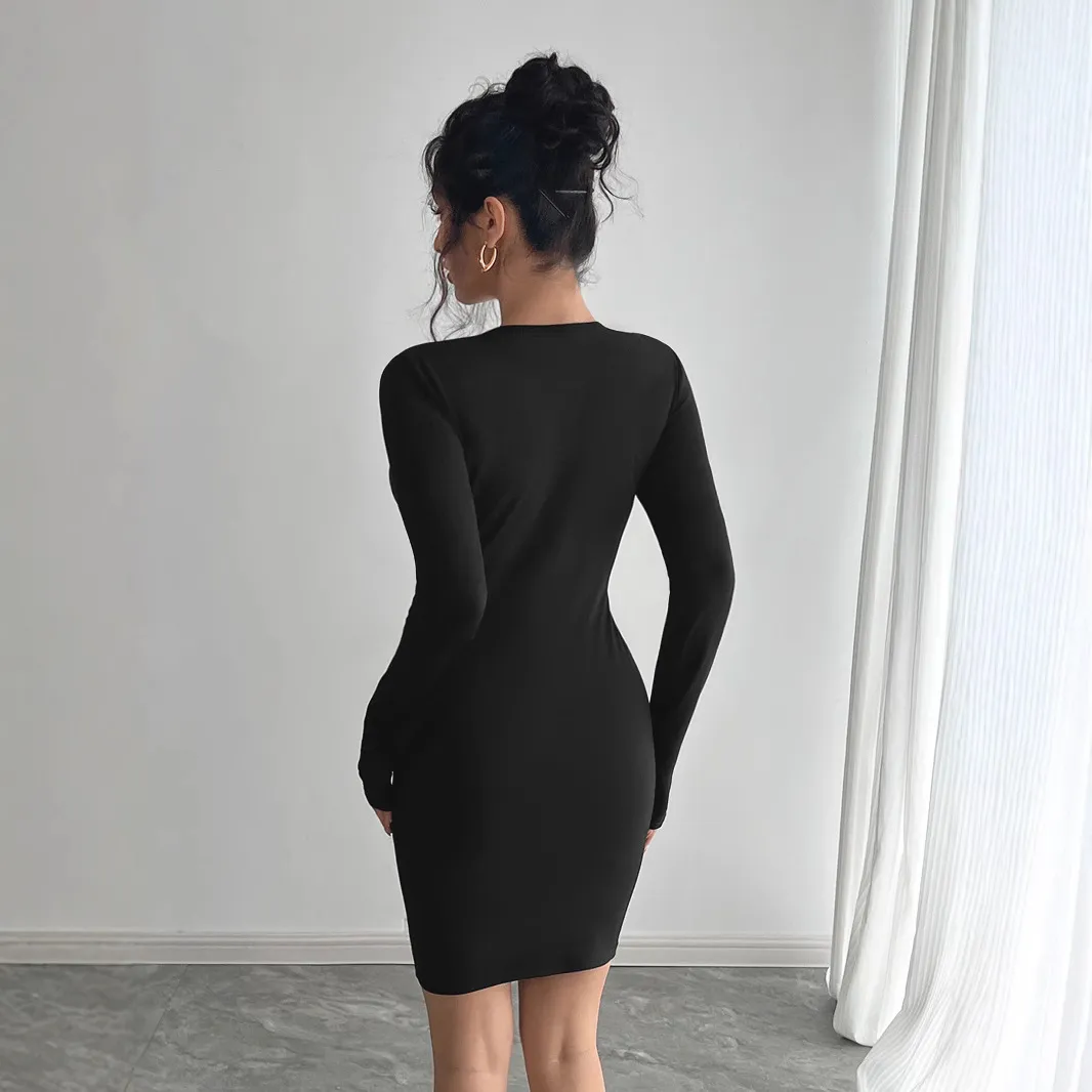 欧美跨境2026春秋新款女士纯色网纱拼接胸部设计长袖修身连衣裙