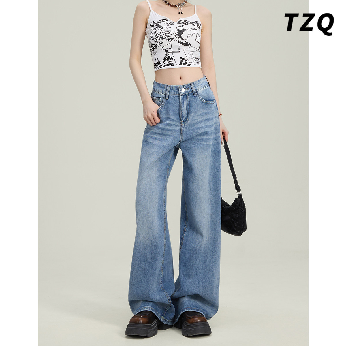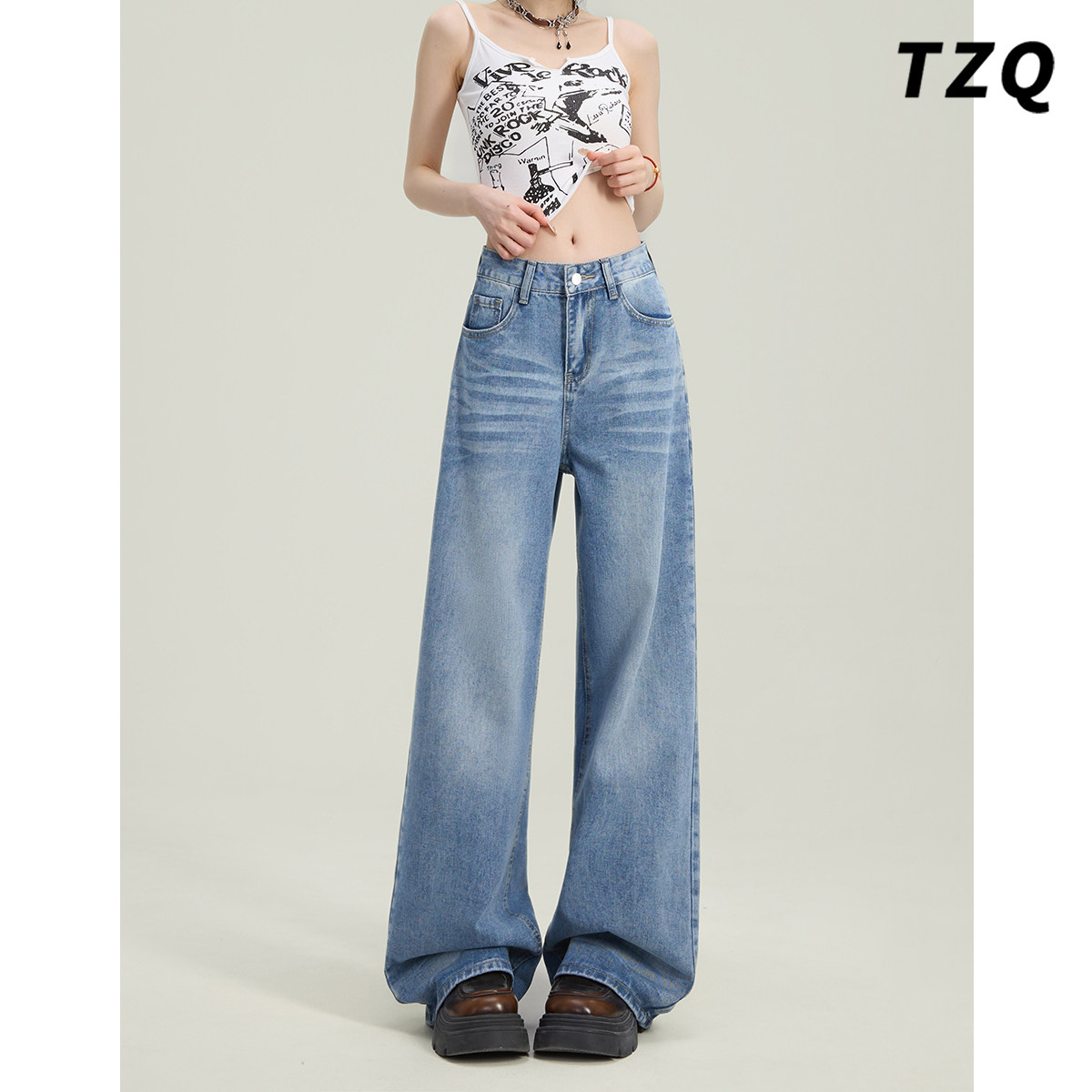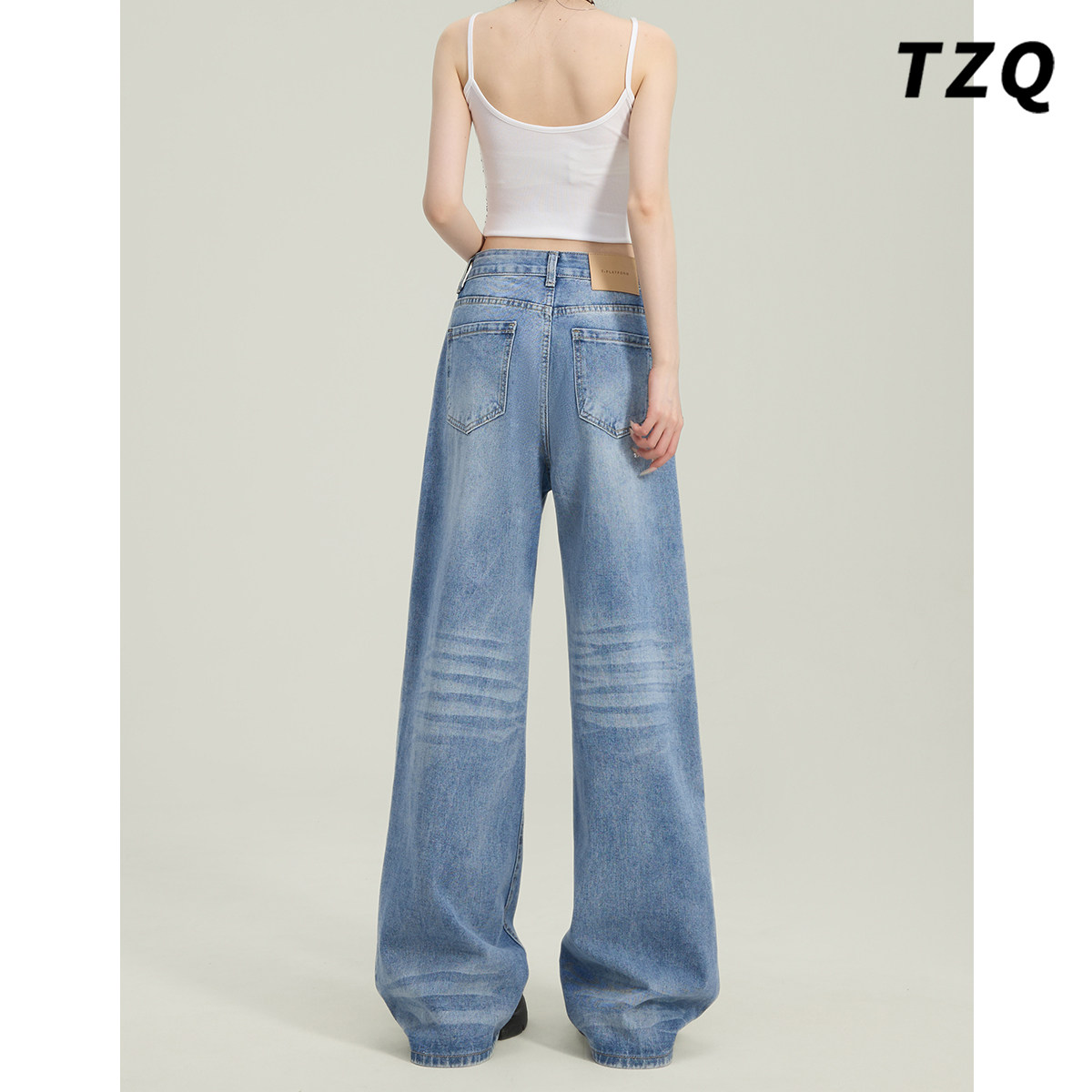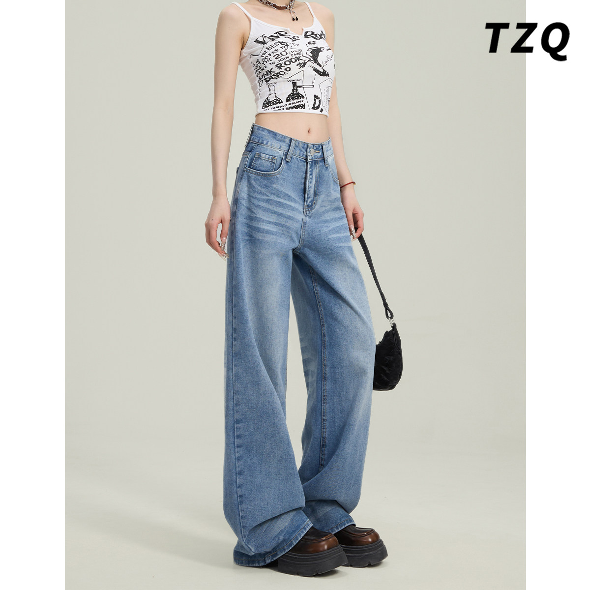 水洗浅蓝色高腰阔腿牛仔裤女2026春季新款宽松显瘦直筒垂感拖地裤