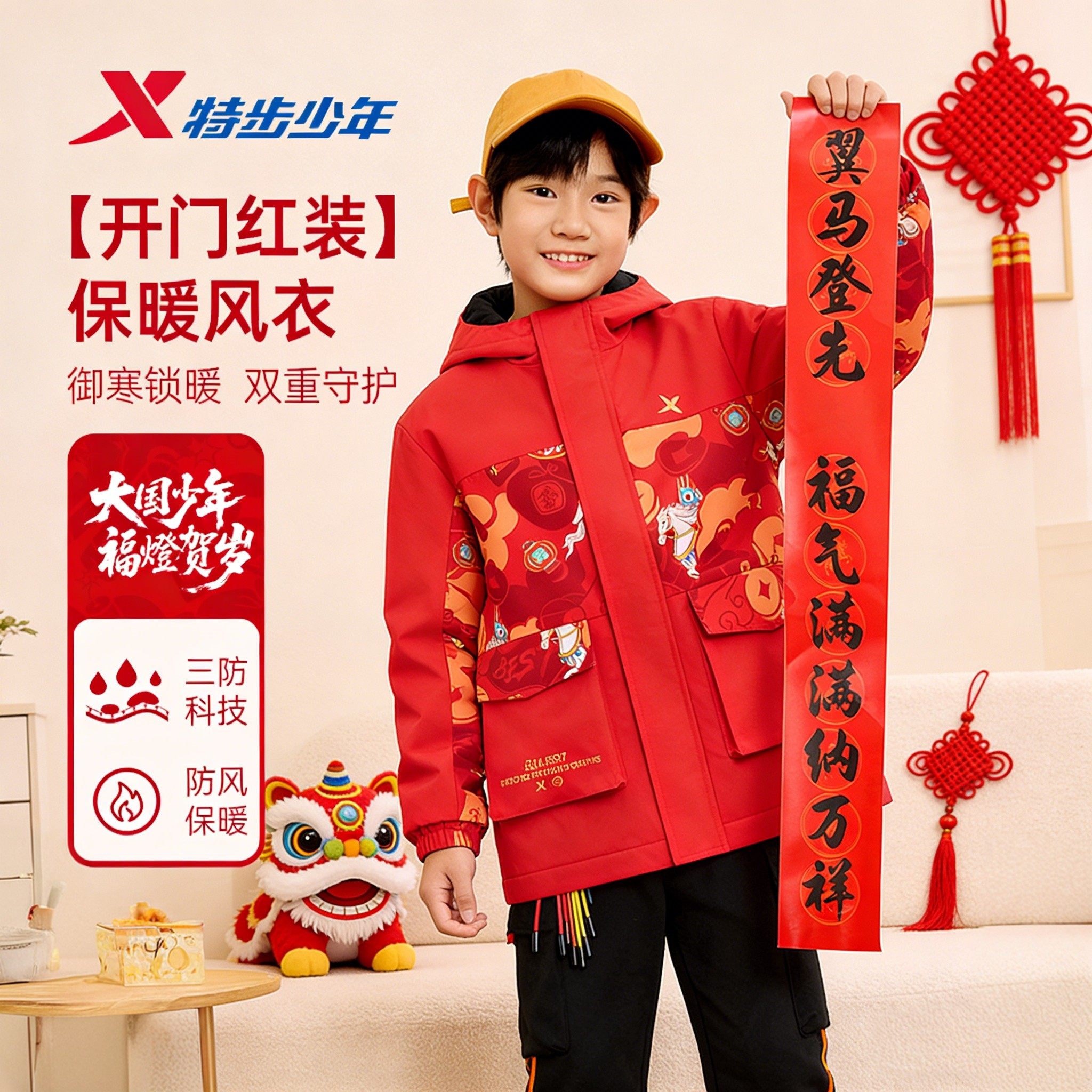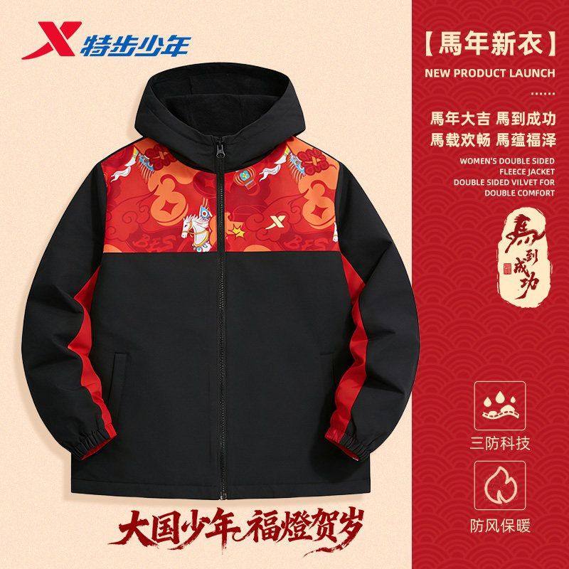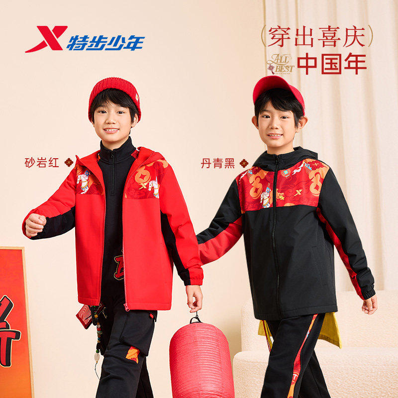 特步童装男童女童年服儿童拜冬年服喜庆风6冬季加绒防风外套