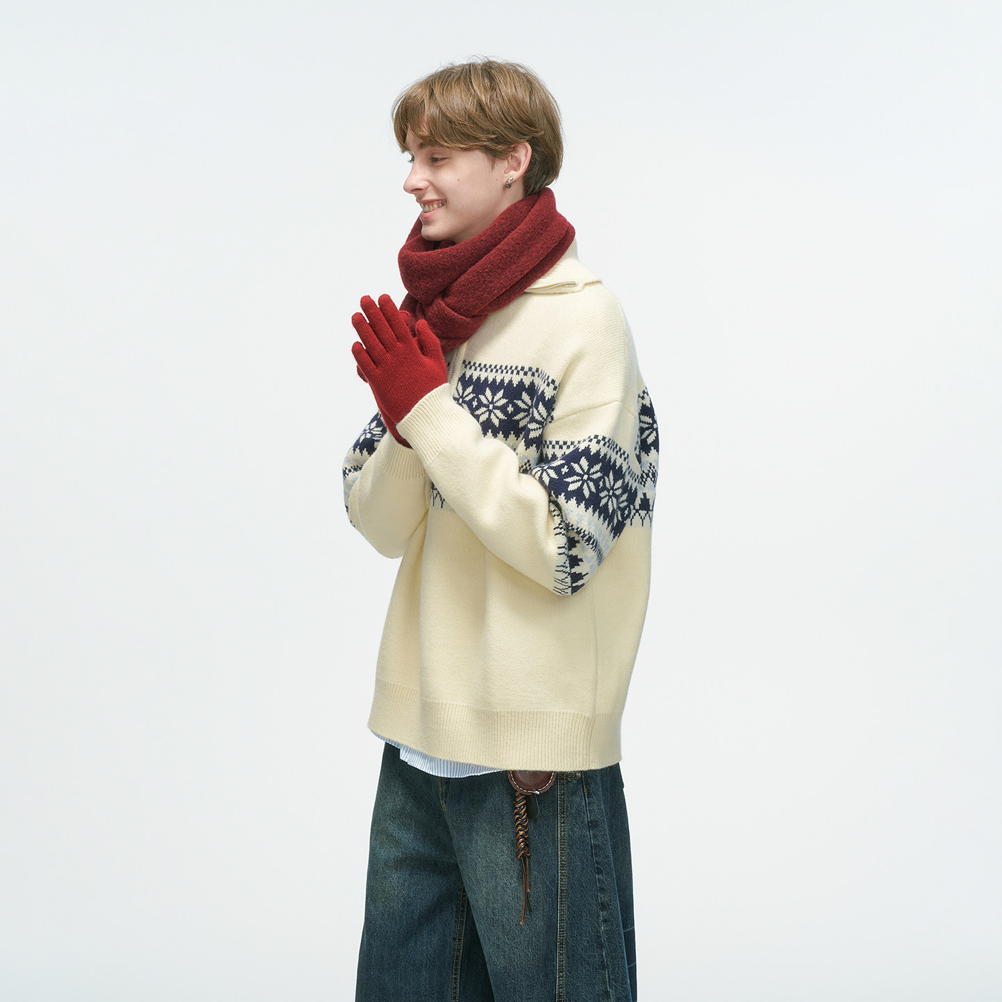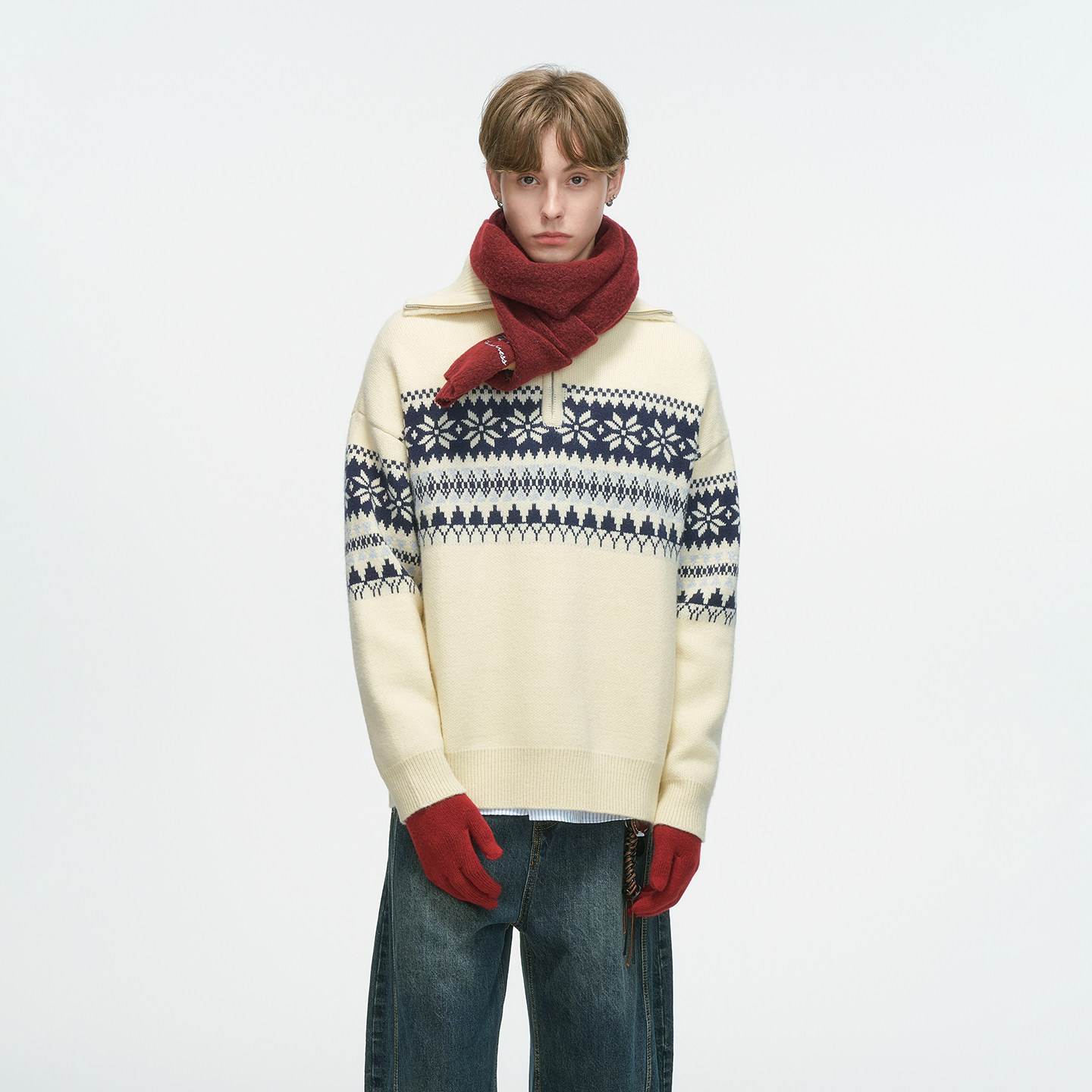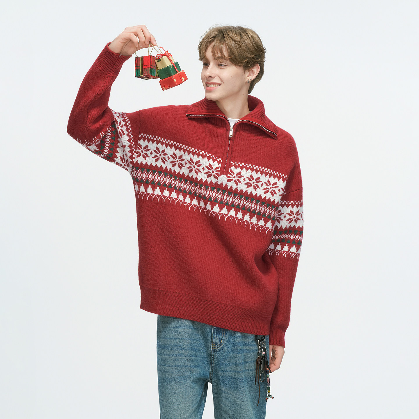 Dream made费尔岛红色半拉链毛衣男款秋冬季本命年高领情侣针织衫