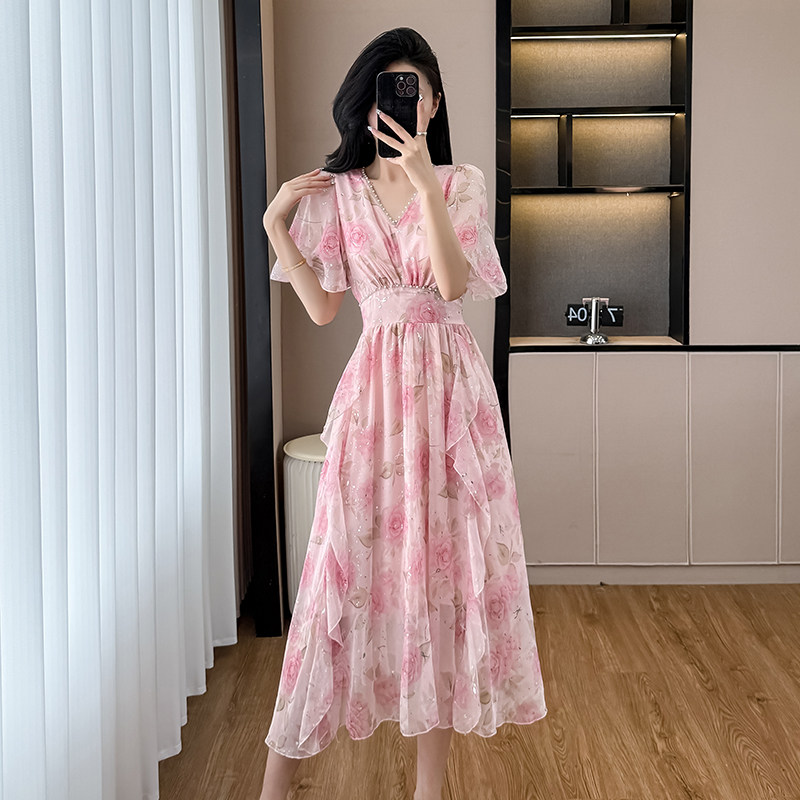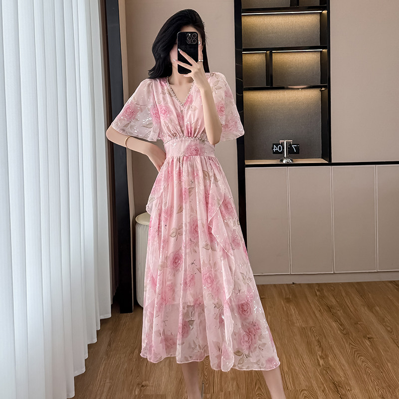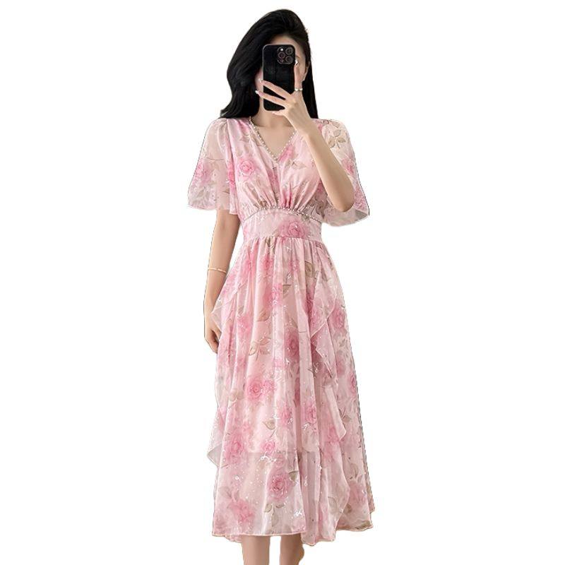 法式轻奢V领连衣裙夏季新款高级感收腰显瘦碎花雪纺时尚气质长裙