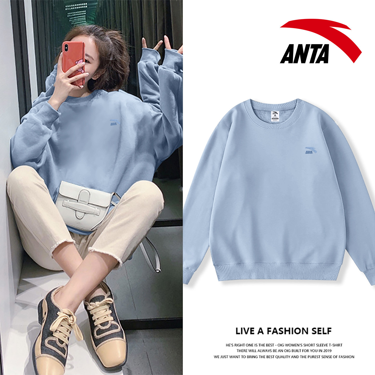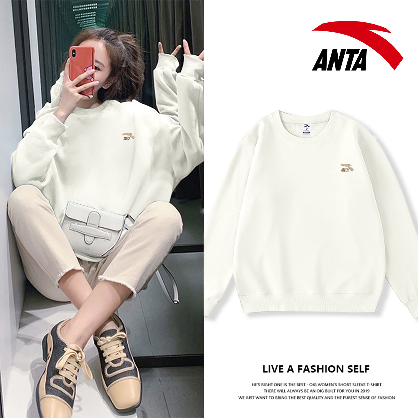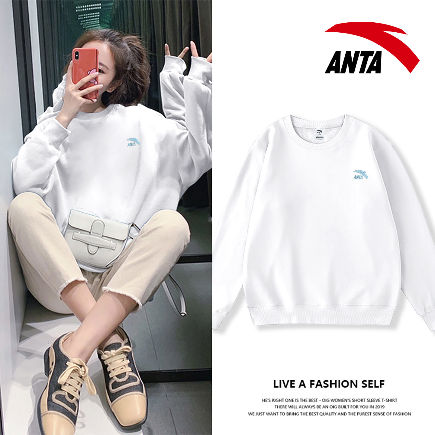 安踏卫衣女款2026秋冬季新款红色简约宽松长袖上衣圆领无帽套头衫