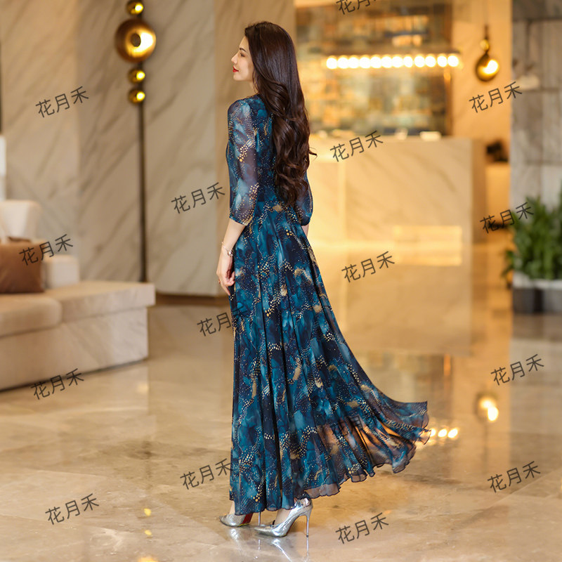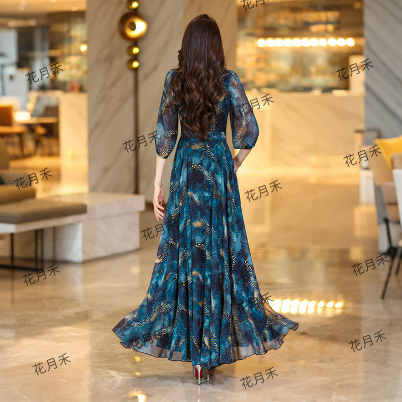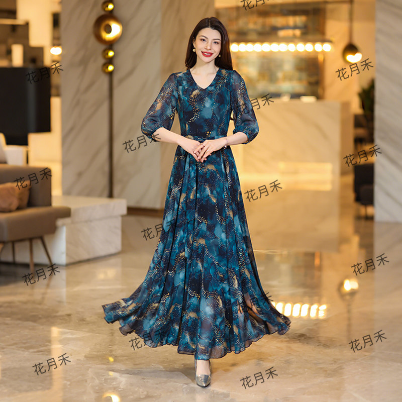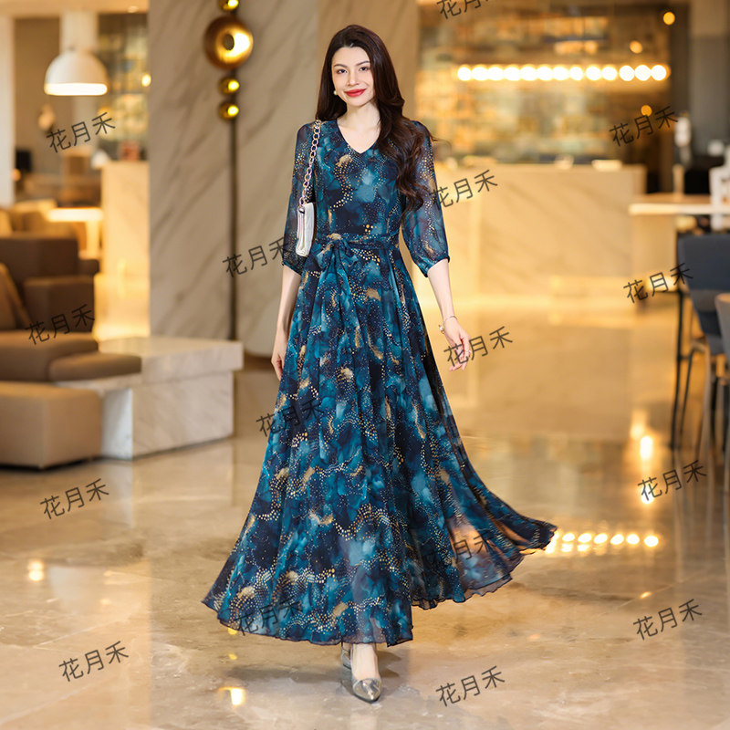 2025年春秋冬V领印花连衣裙收腰显瘦长裙妈妈款短款小个子沙滩裙