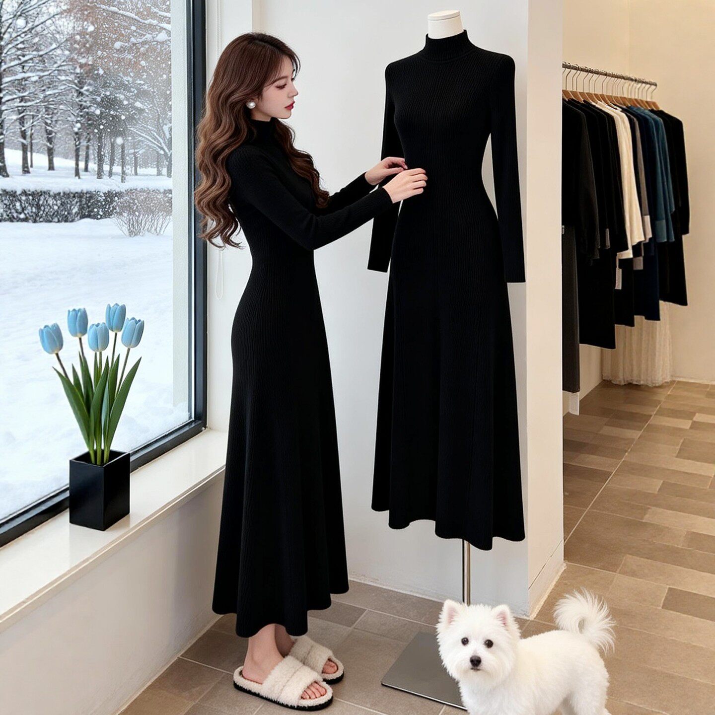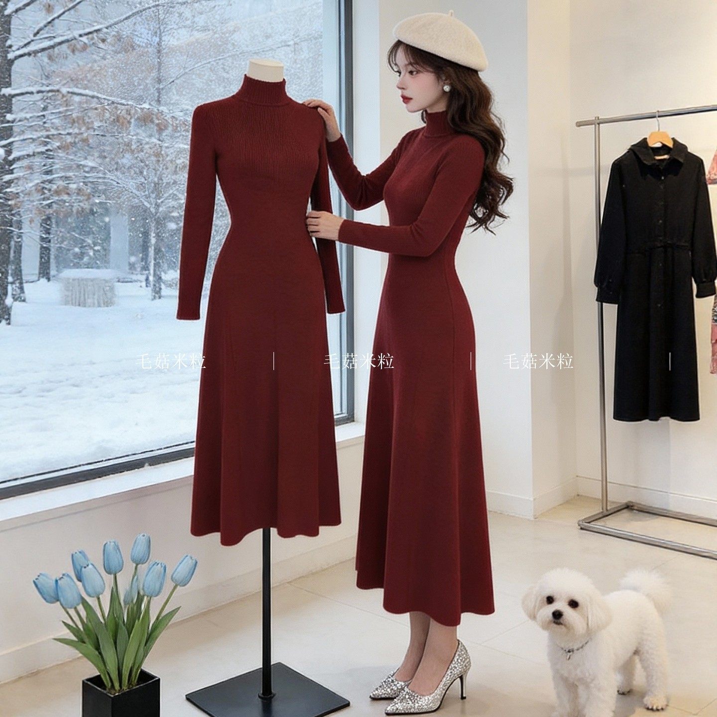 长款针织连衣裙女秋冬高级感法式半高领气质收腰显瘦内搭打底裙子