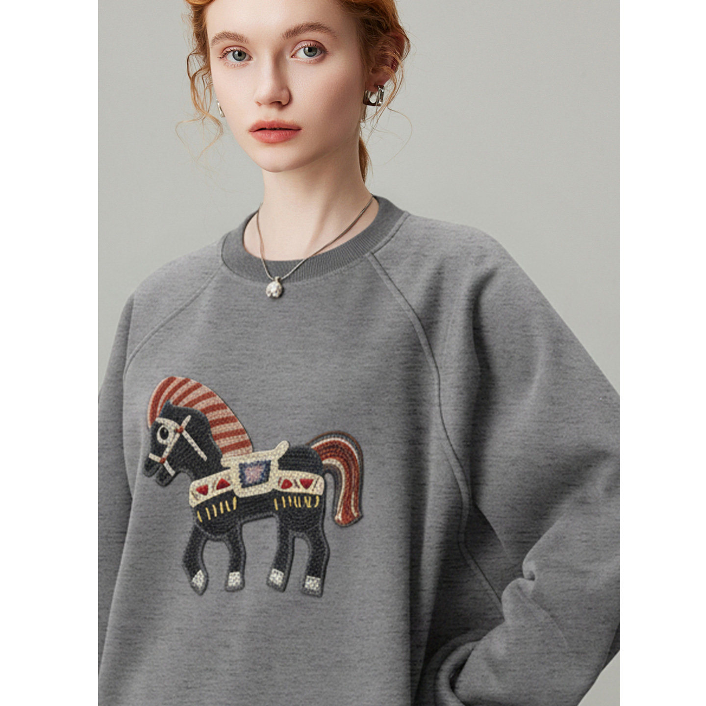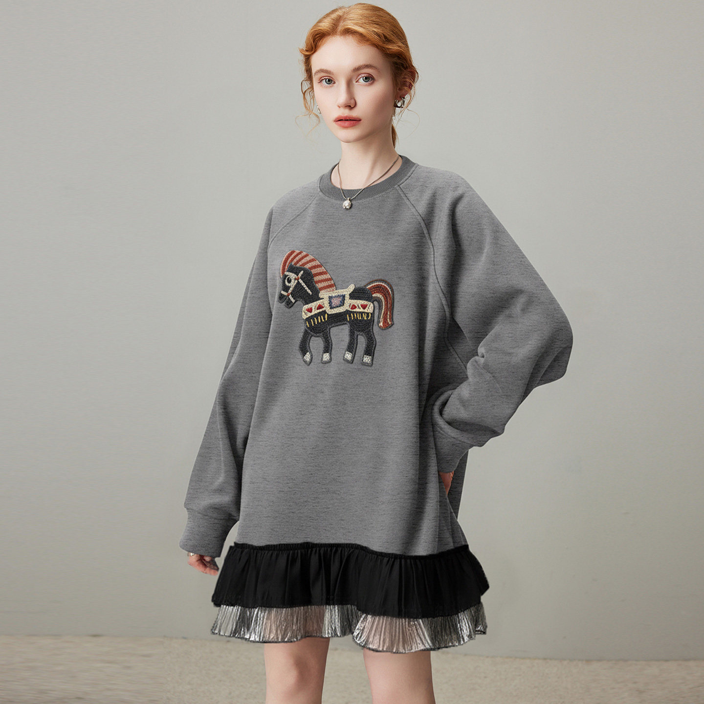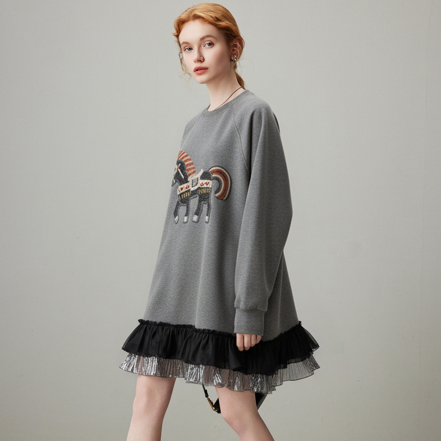 dfvc灰色休闲圆领卫衣裙女2026年春季新款小马刺绣宽松春装连衣裙