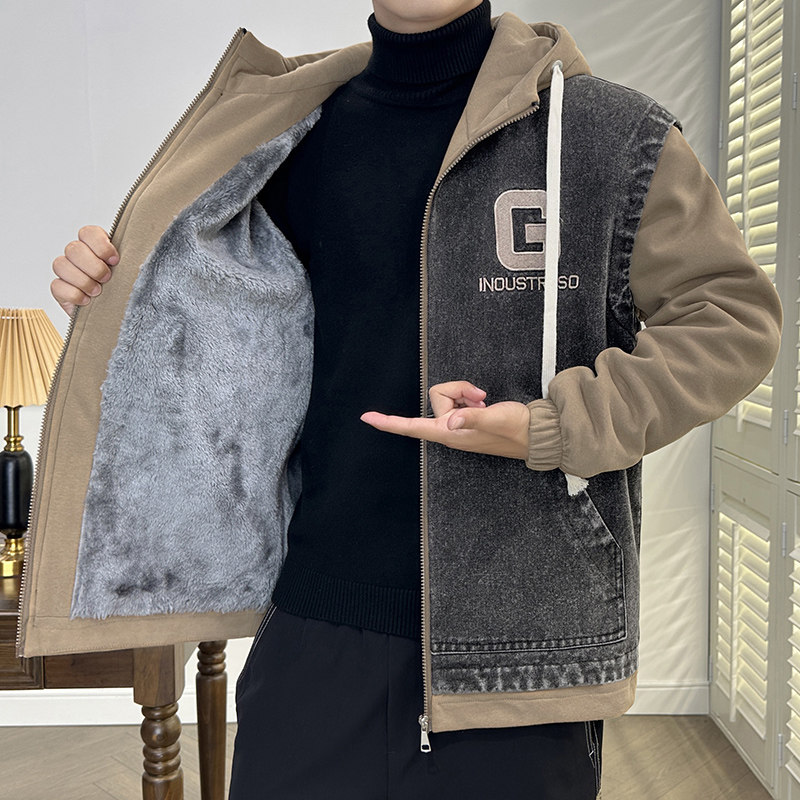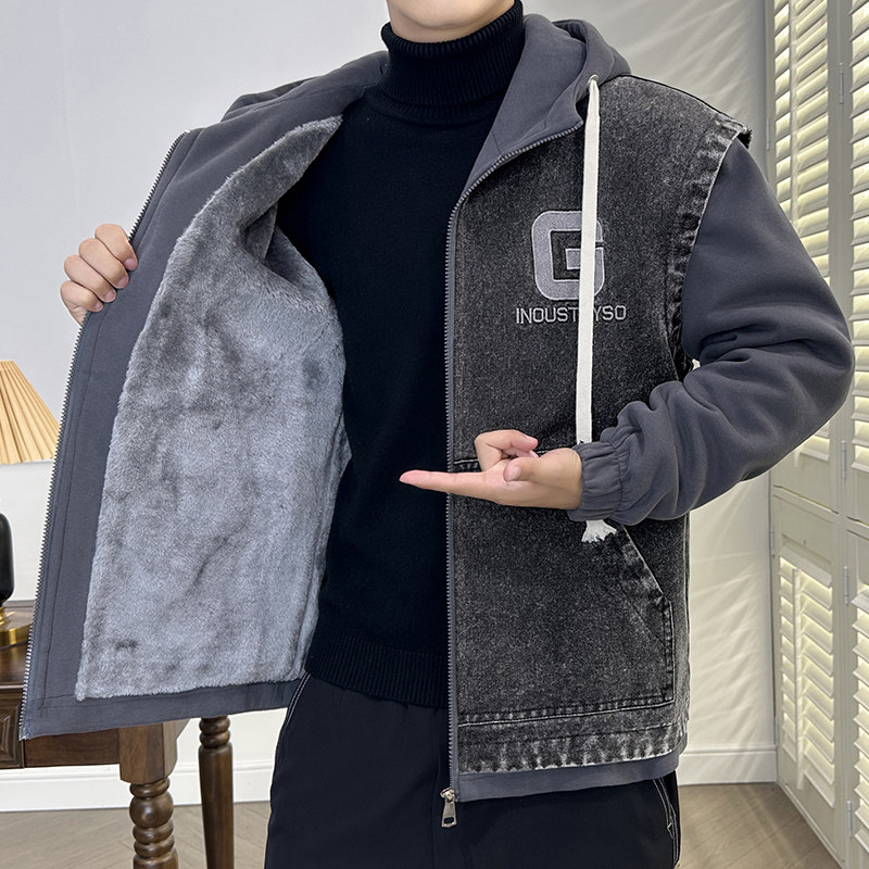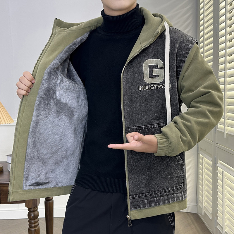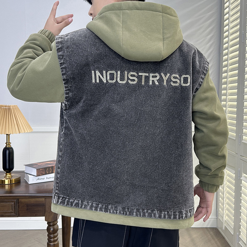 秋冬季13青少年加绒牛仔外套15岁男孩初高中学生14胖大童羽绒服潮