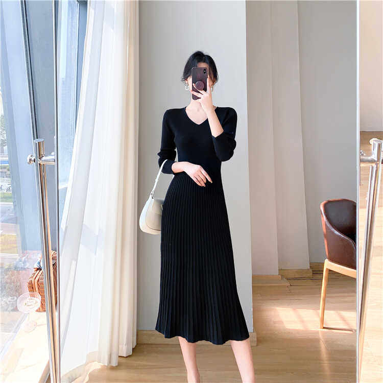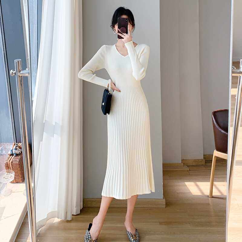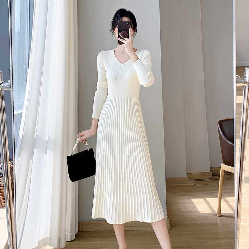 配大衣的白色针织连衣裙女秋冬气质名媛高级感内搭a字毛衣裙长裙