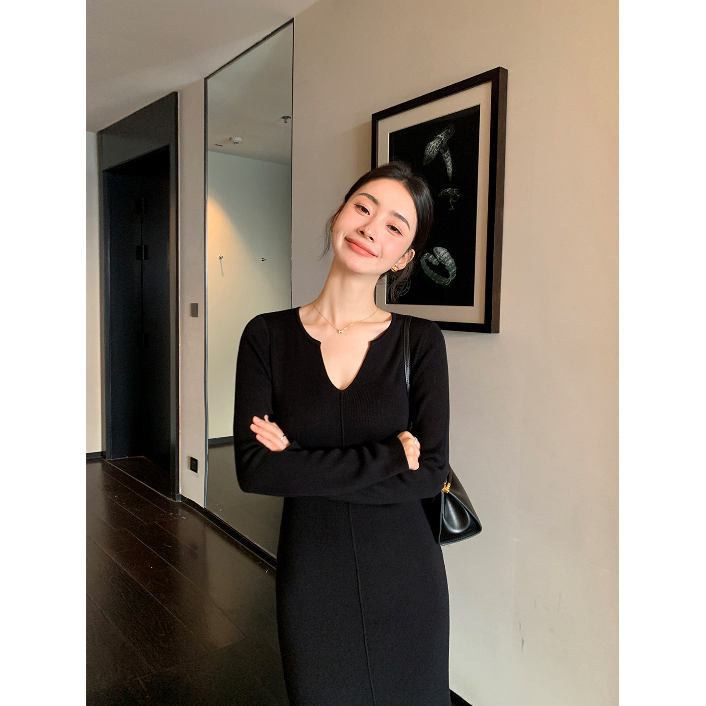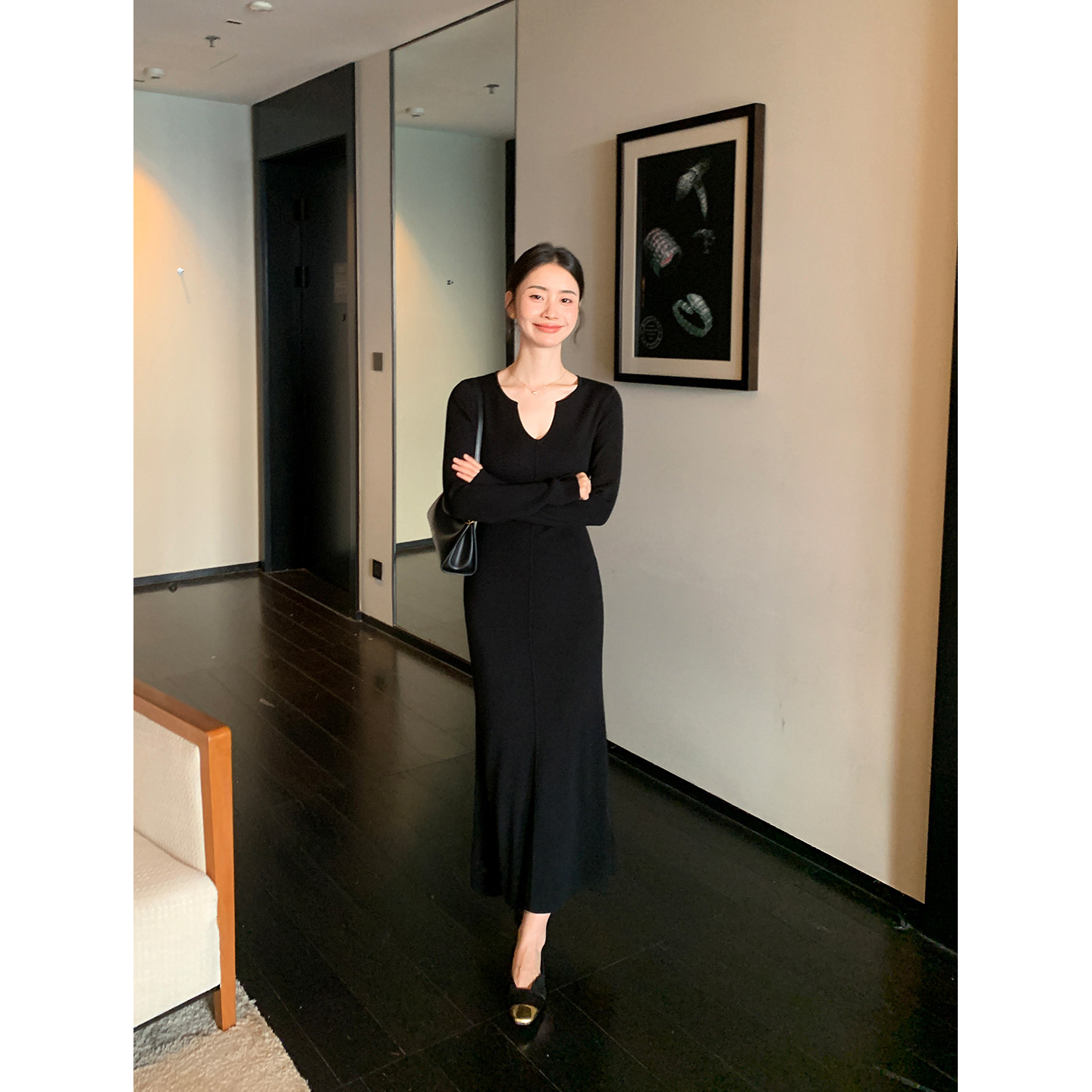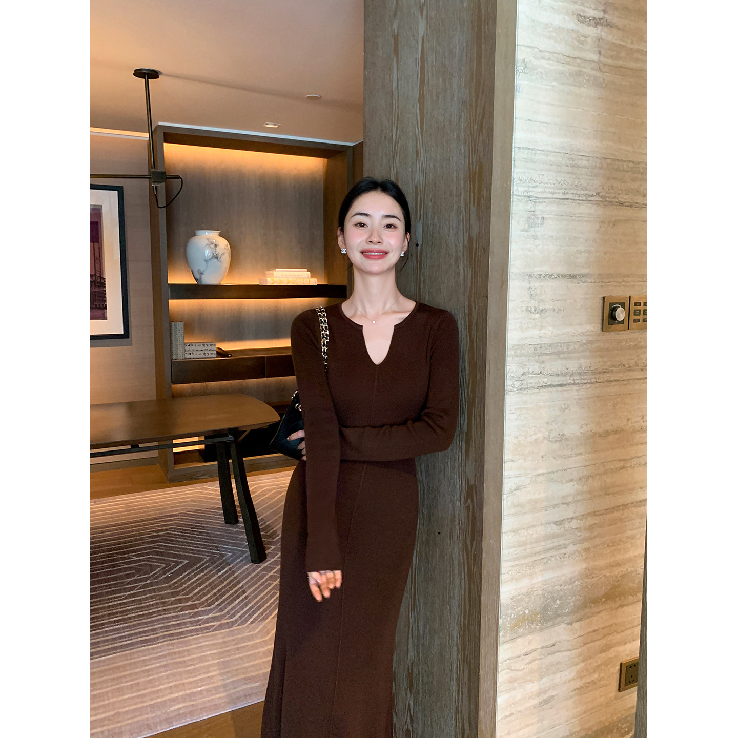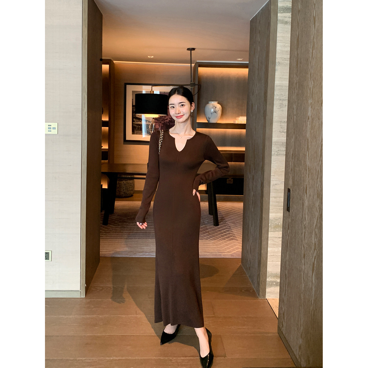 Maven Lin 时髦之选 咖色V领长袖针织连衣裙女修身优雅打底鱼尾裙