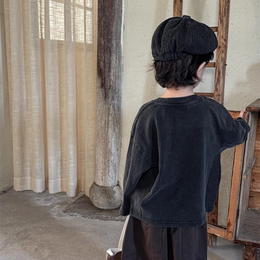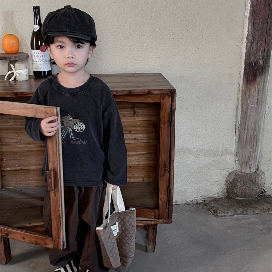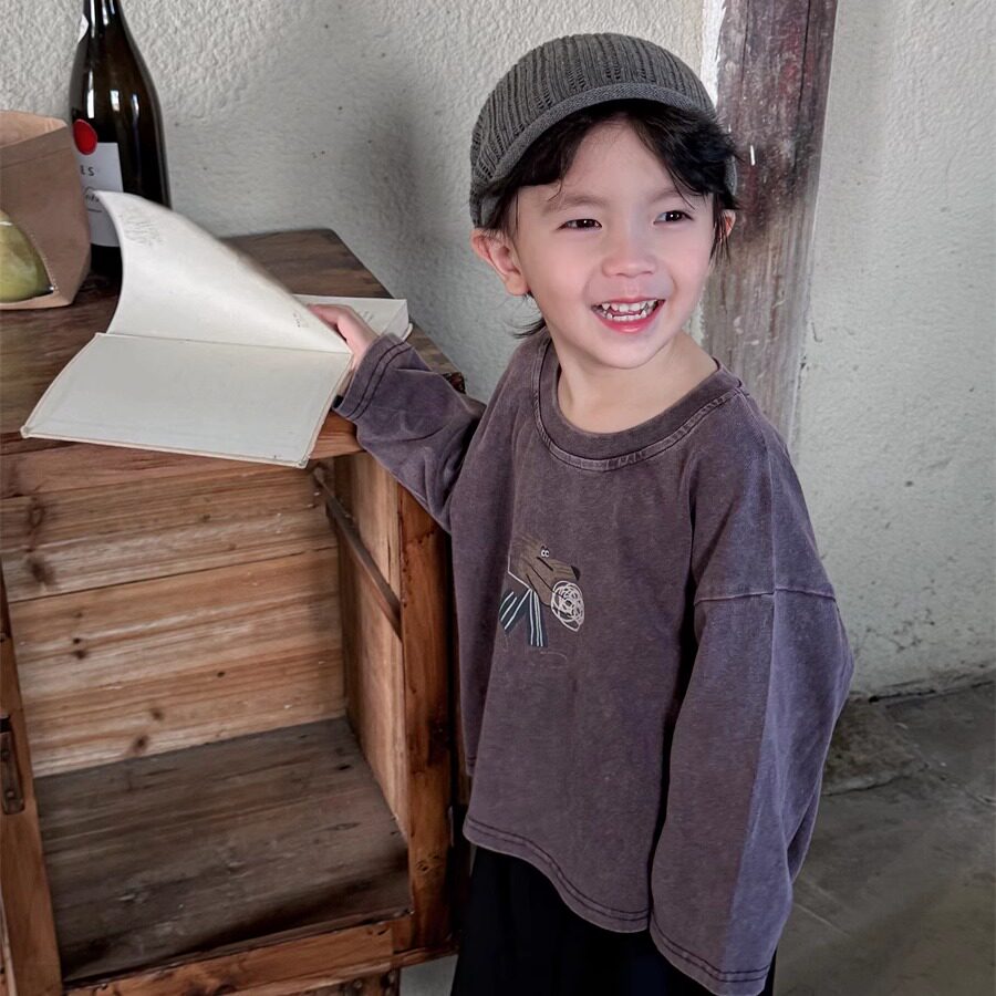 暮晨家新款春装2026男童卡通印花长袖T恤中小童做旧磨白圆领上衣