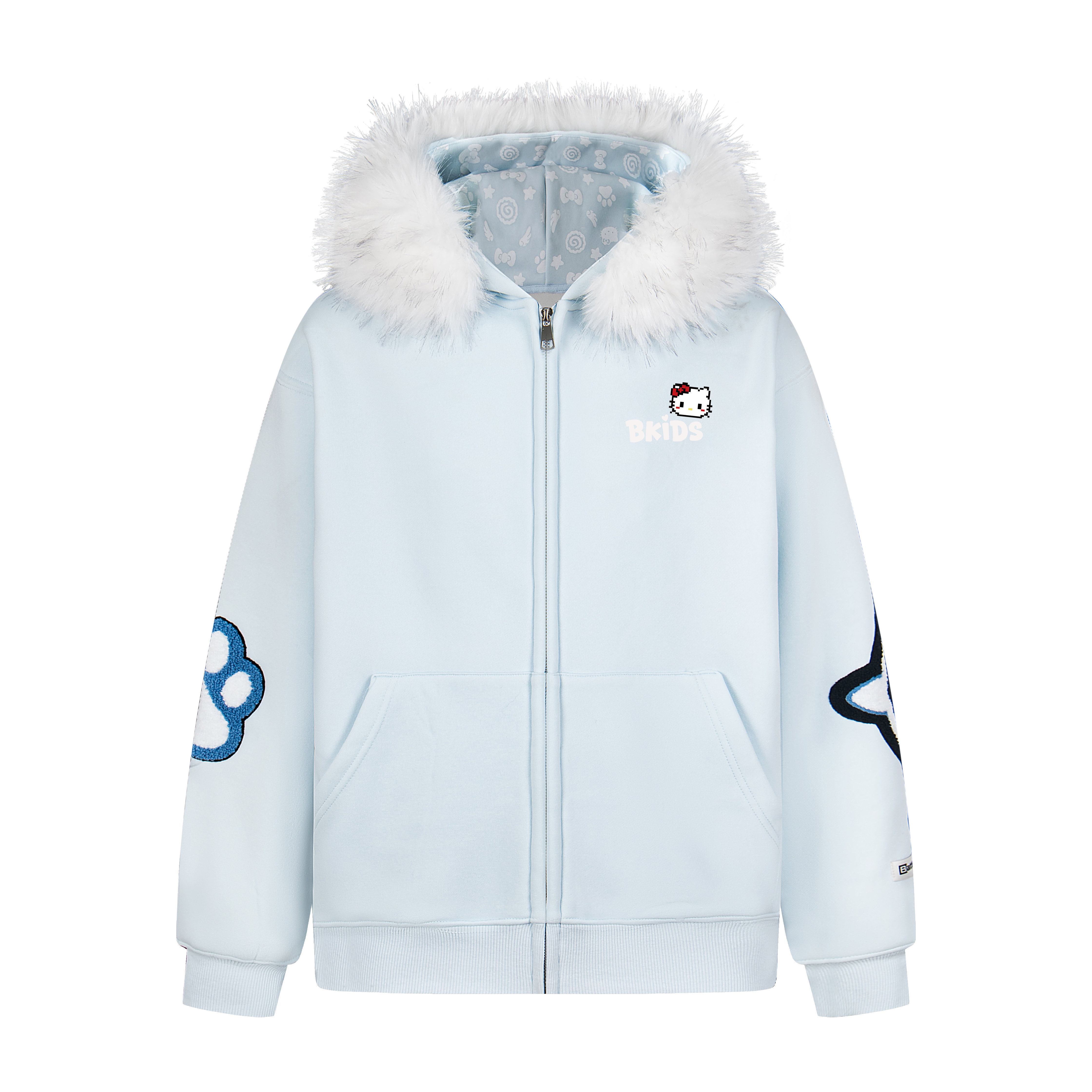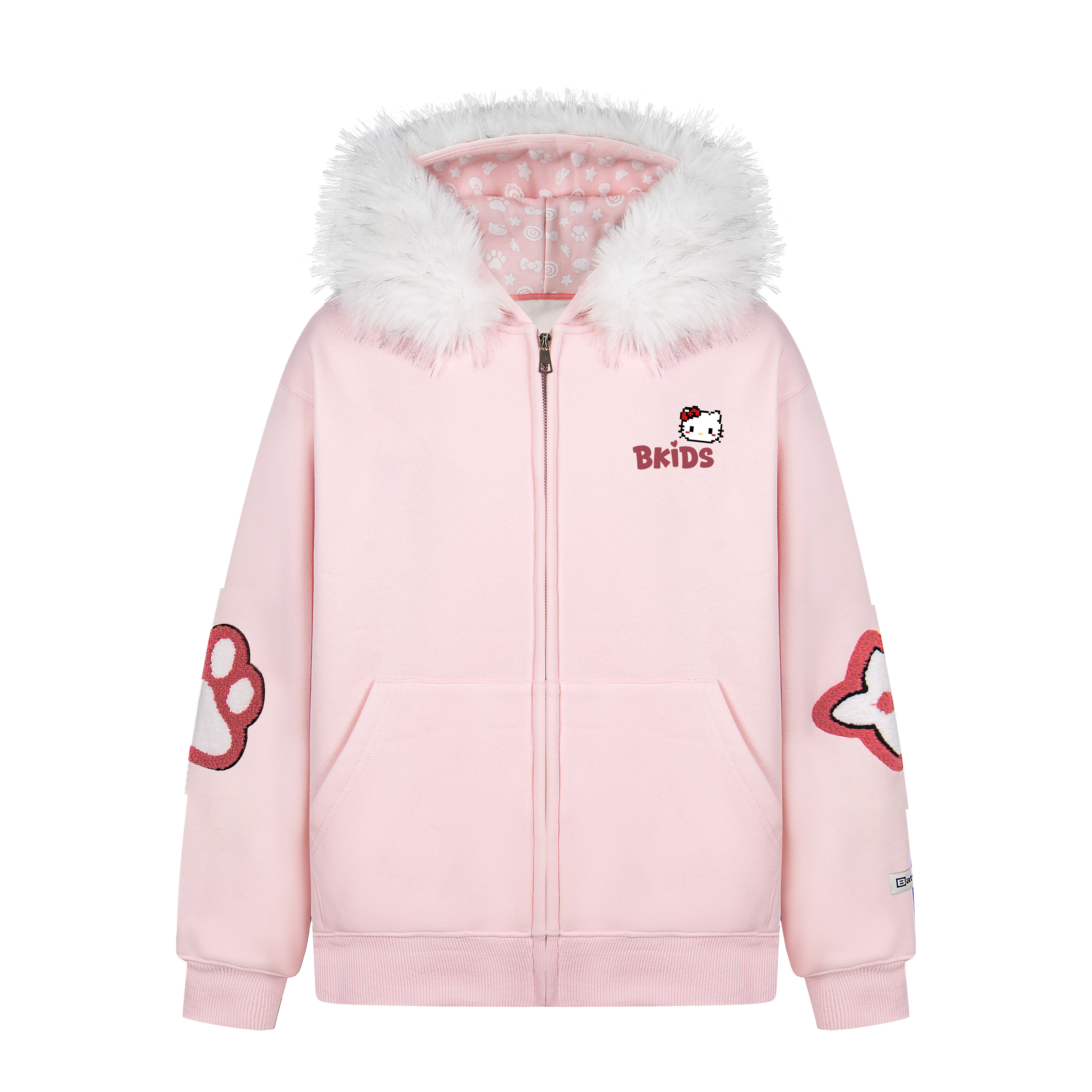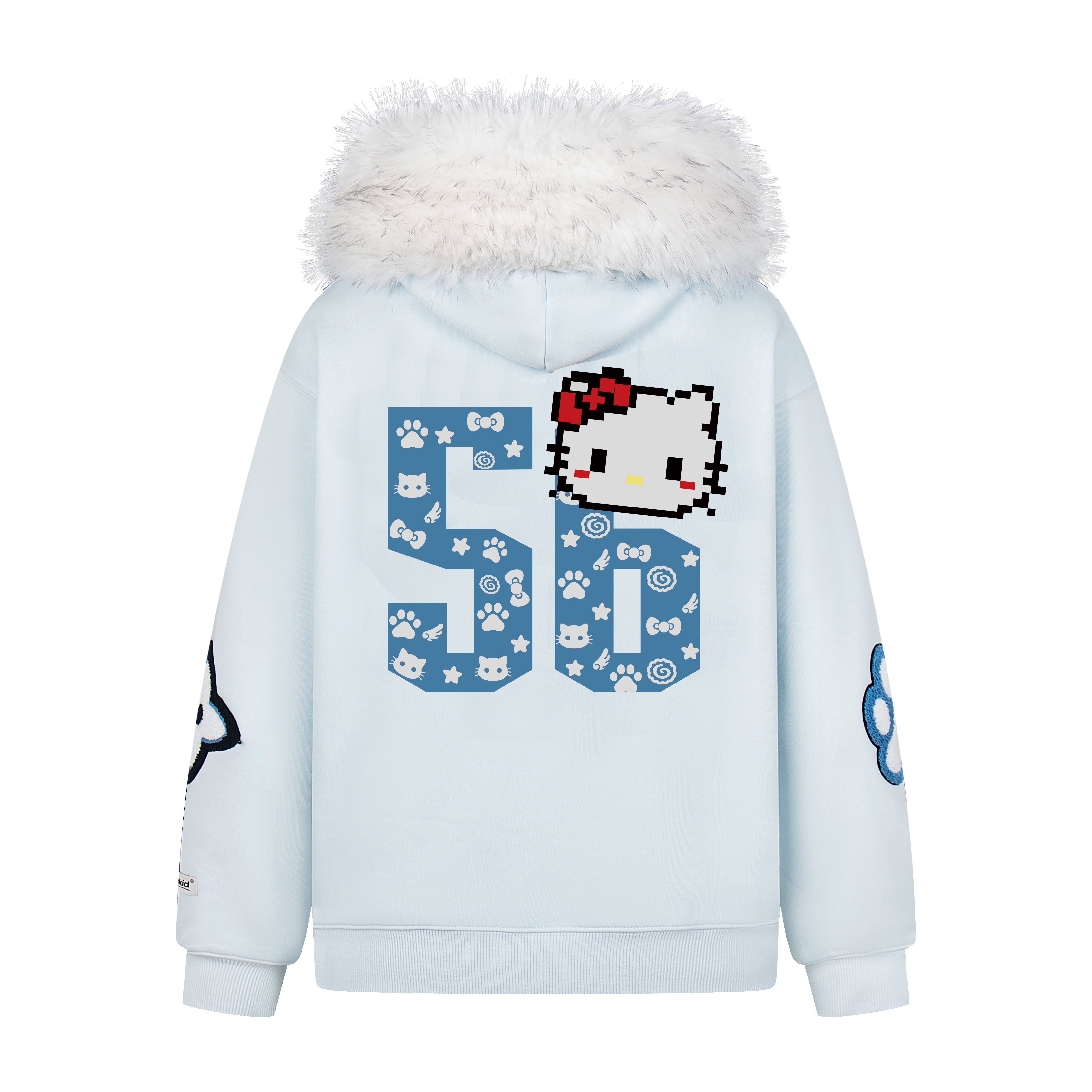 亿万少年BUFU原创美式复古凯蒂猫毛领连帽卫衣加绒加厚外套男女款