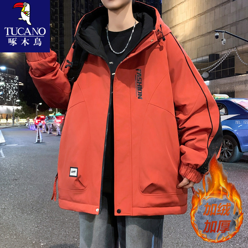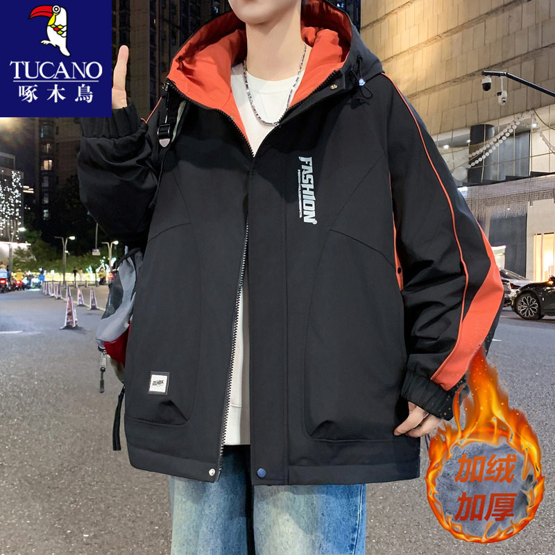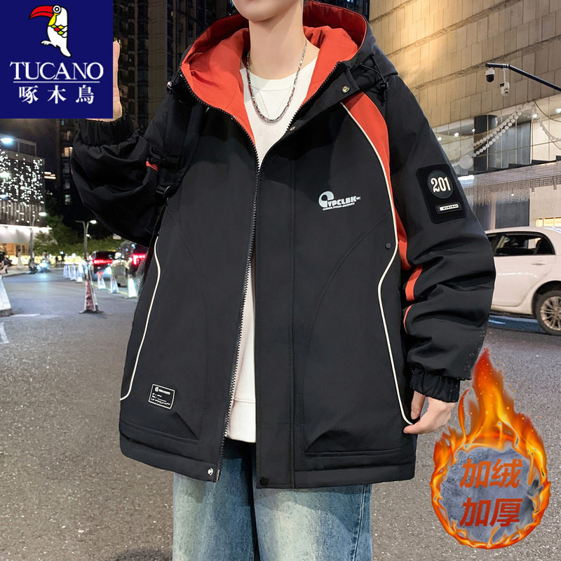 啄木鸟加绒加厚冲锋衣男款秋冬季工装夹克冬装青少年男生保暖外套