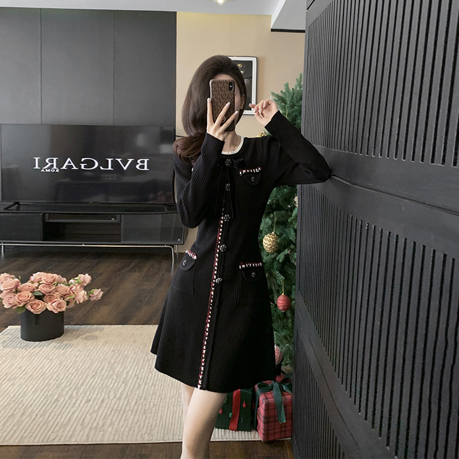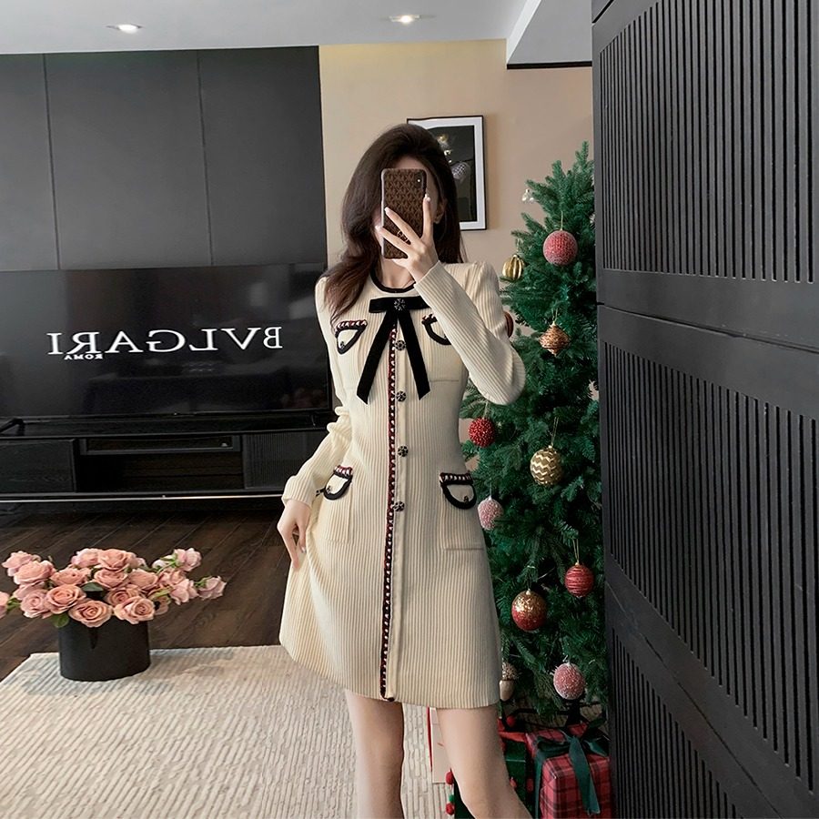 高级感蝴蝶结撞色针织红色连衣裙修身圣诞新年气质轻奢圆领小个子