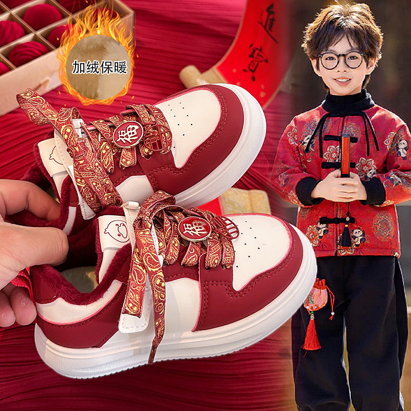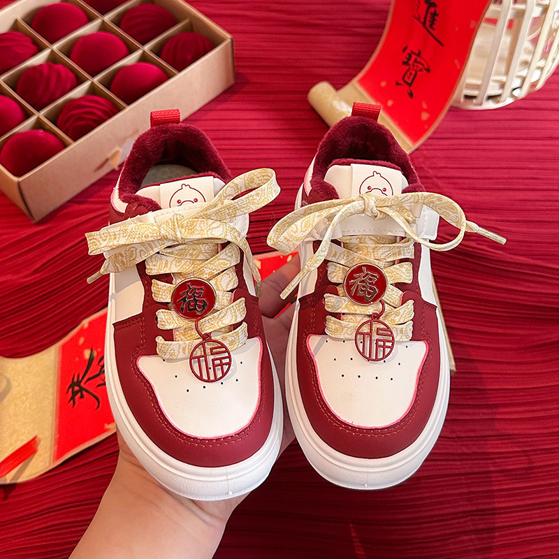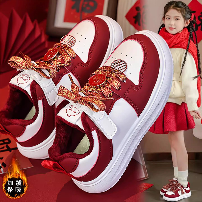 女童板鞋冬季2025新款加绒中大童运动二棉鞋女孩红色本命年鞋子女