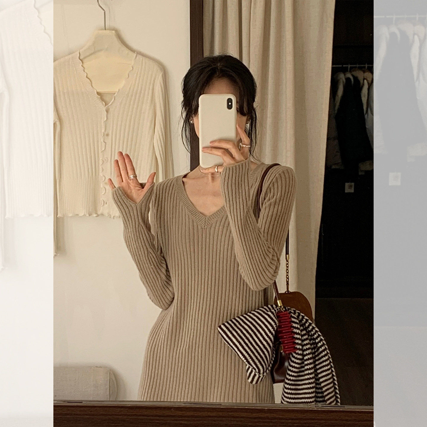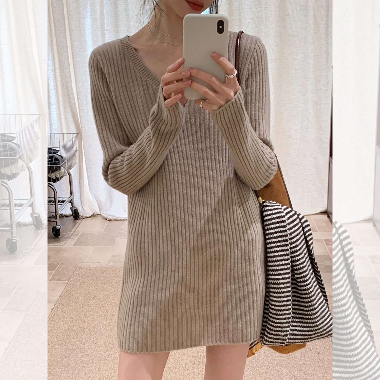 311线报网描述:慵懒v领中长款毛衣遮屁股针织连衣裙打底衫