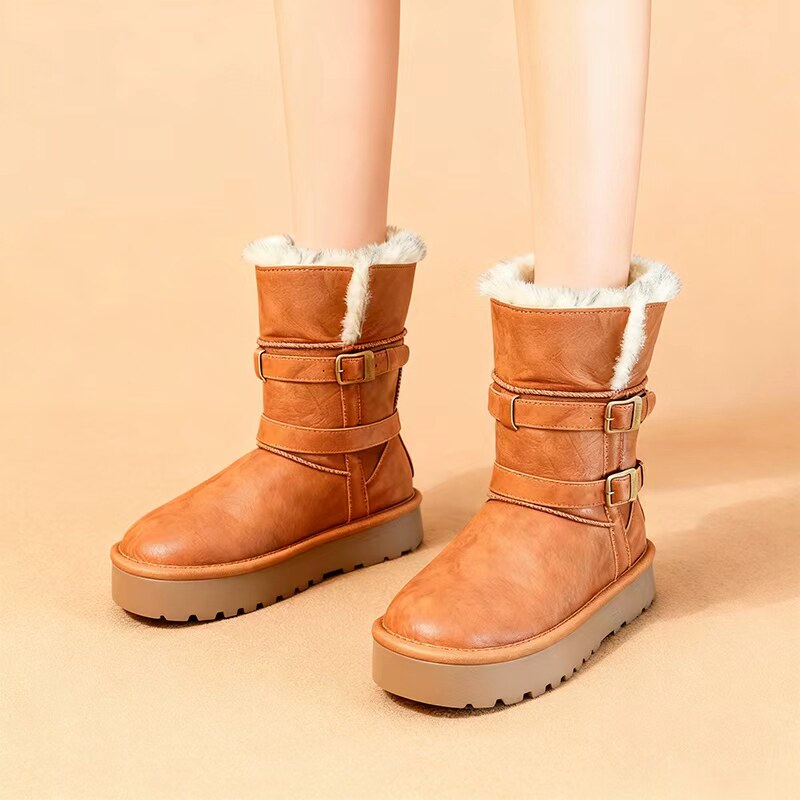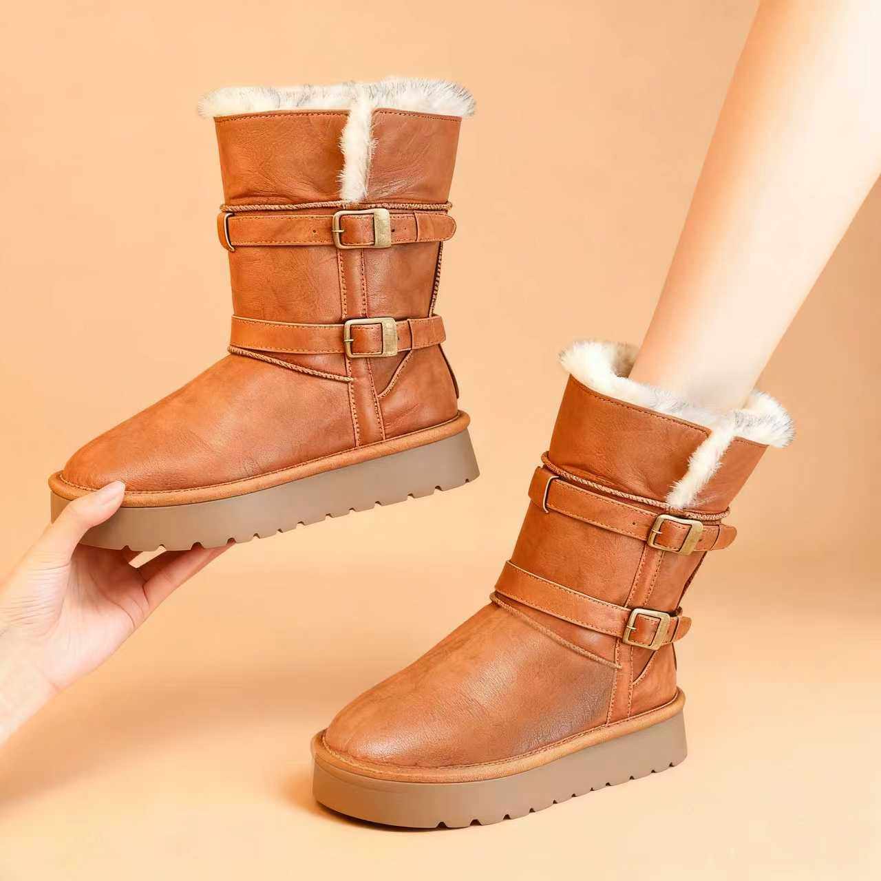 品牌真皮中筒棕色骑士雪地靴女2025新款冬季加绒保暖防水厚底棉鞋