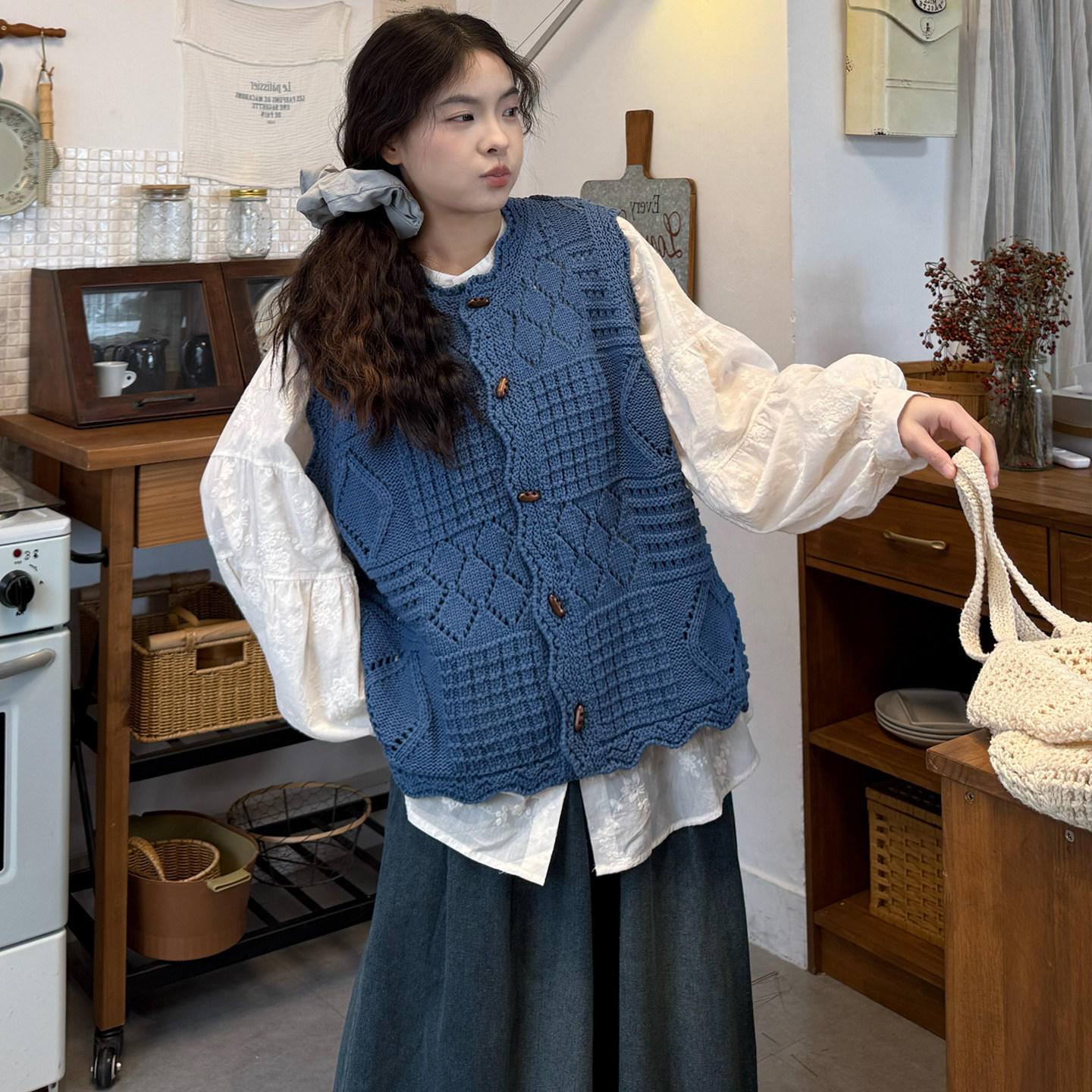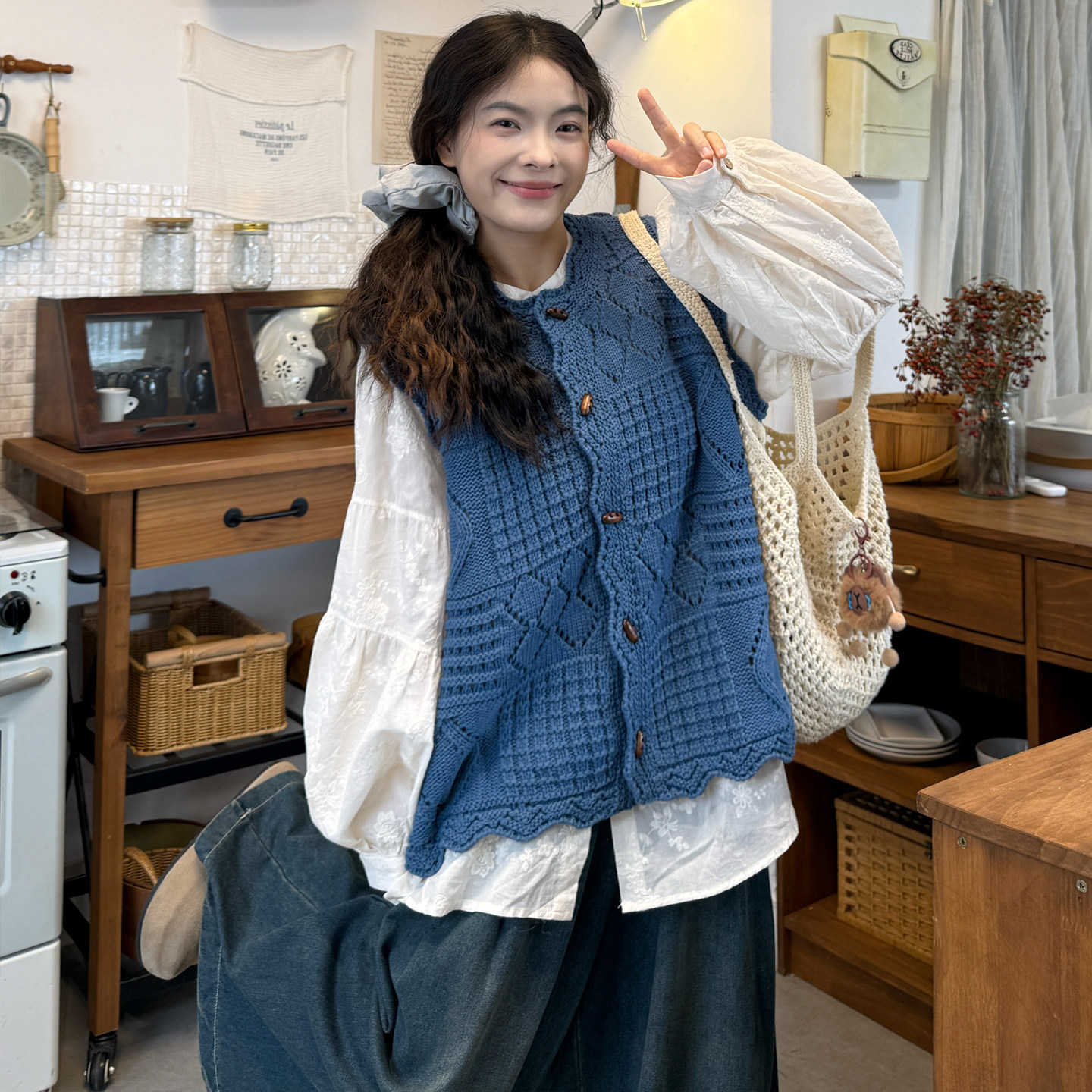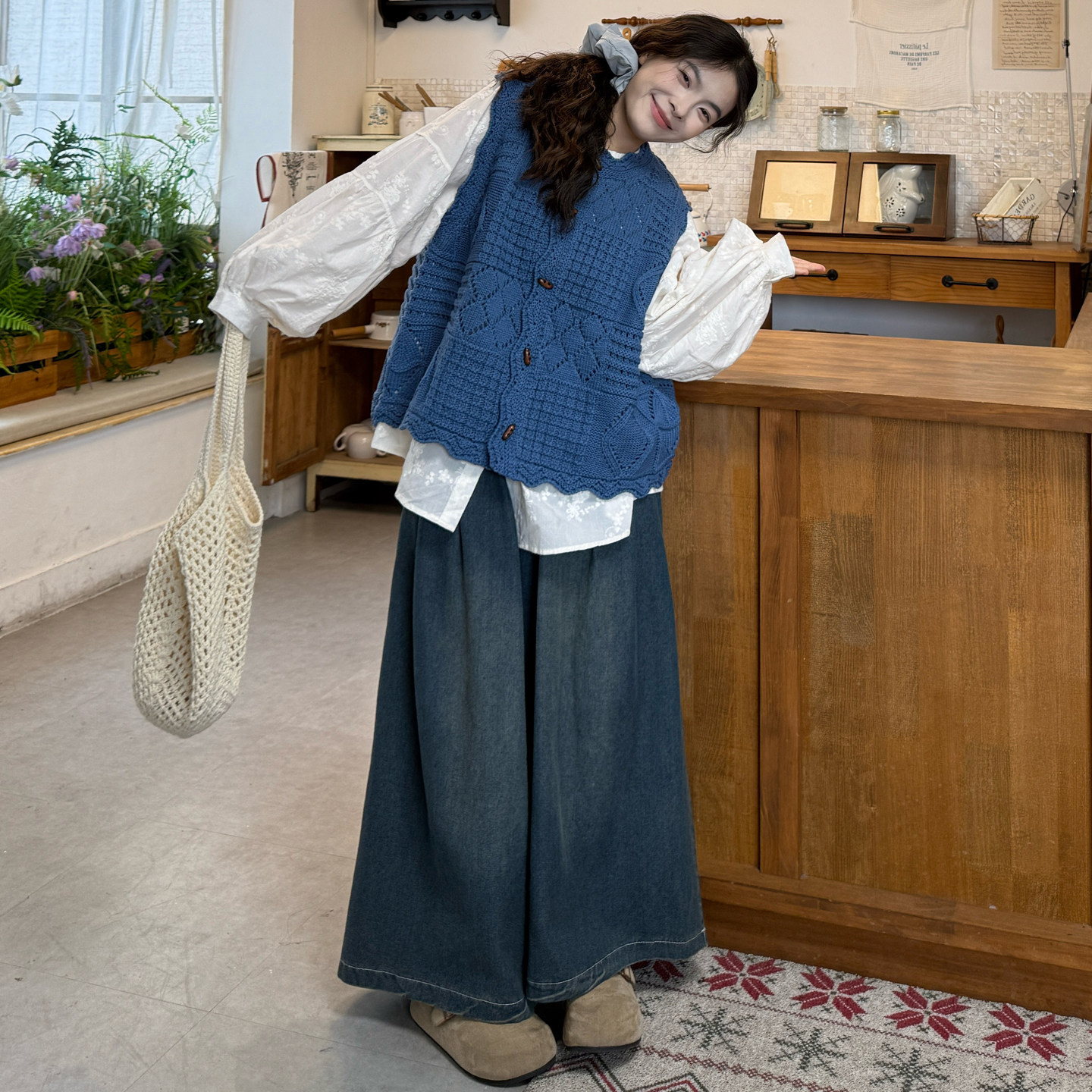 大码女装2026早春新款胖mm复古钩花针织马甲+刺绣衬衫+牛仔裤套装