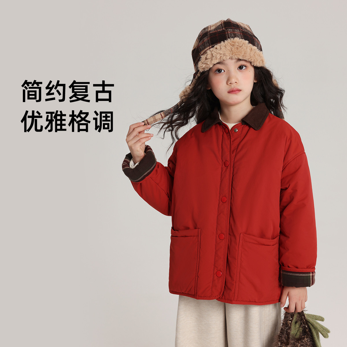 布丁哈鲁冬装童装女童复古棉衣2026秋冬儿童撞色翻领棉服外套加厚