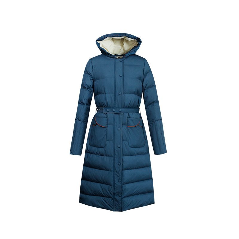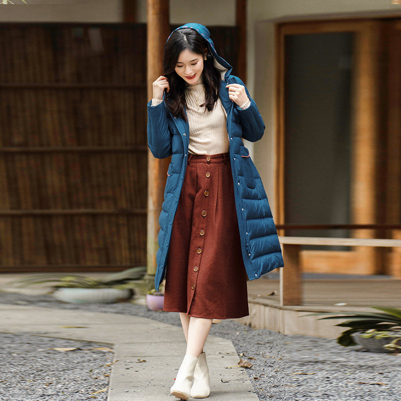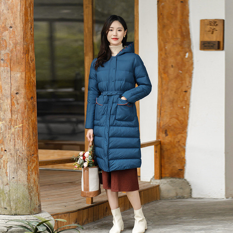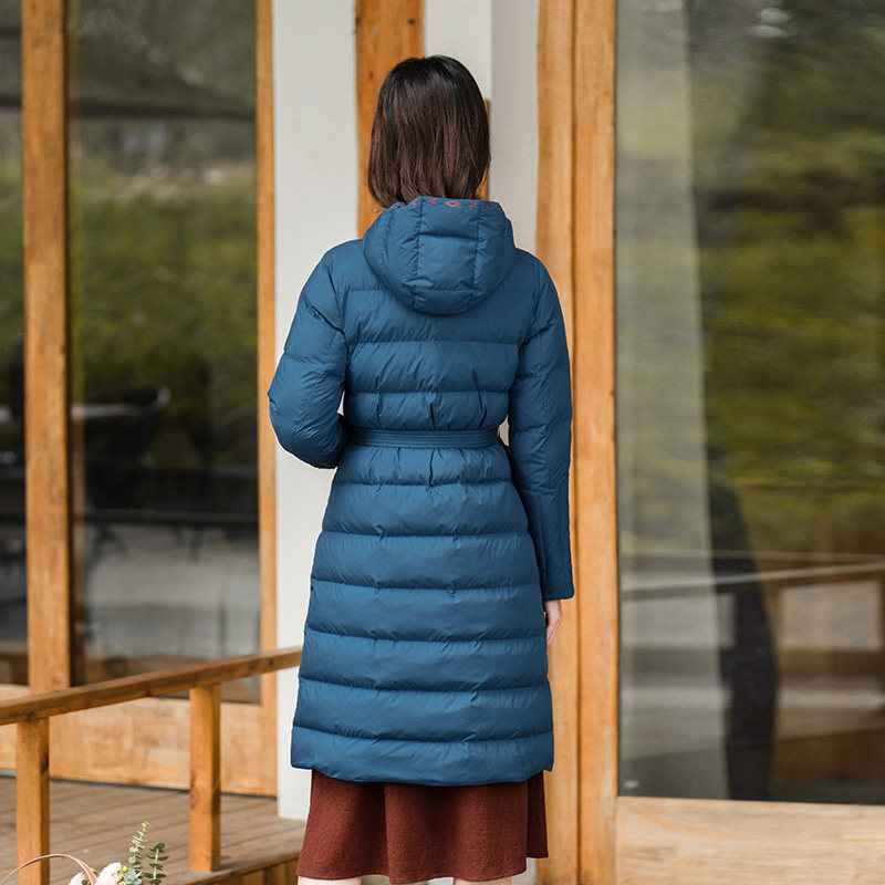 纻衣蓝色连帽羽绒棉服女新款2026冬装文艺绣花收腰显瘦中长款外套
