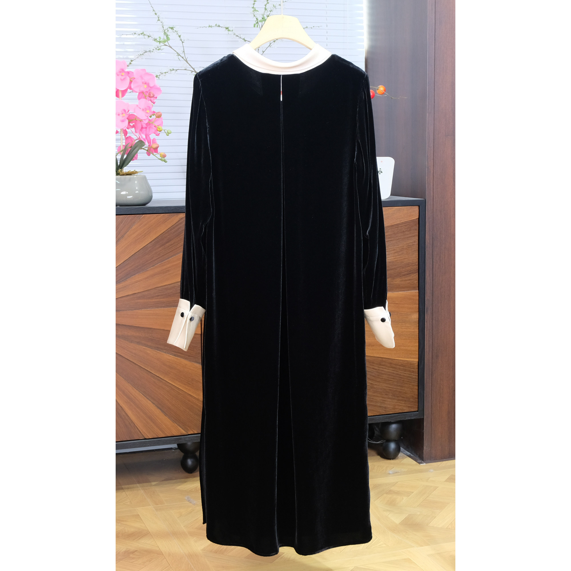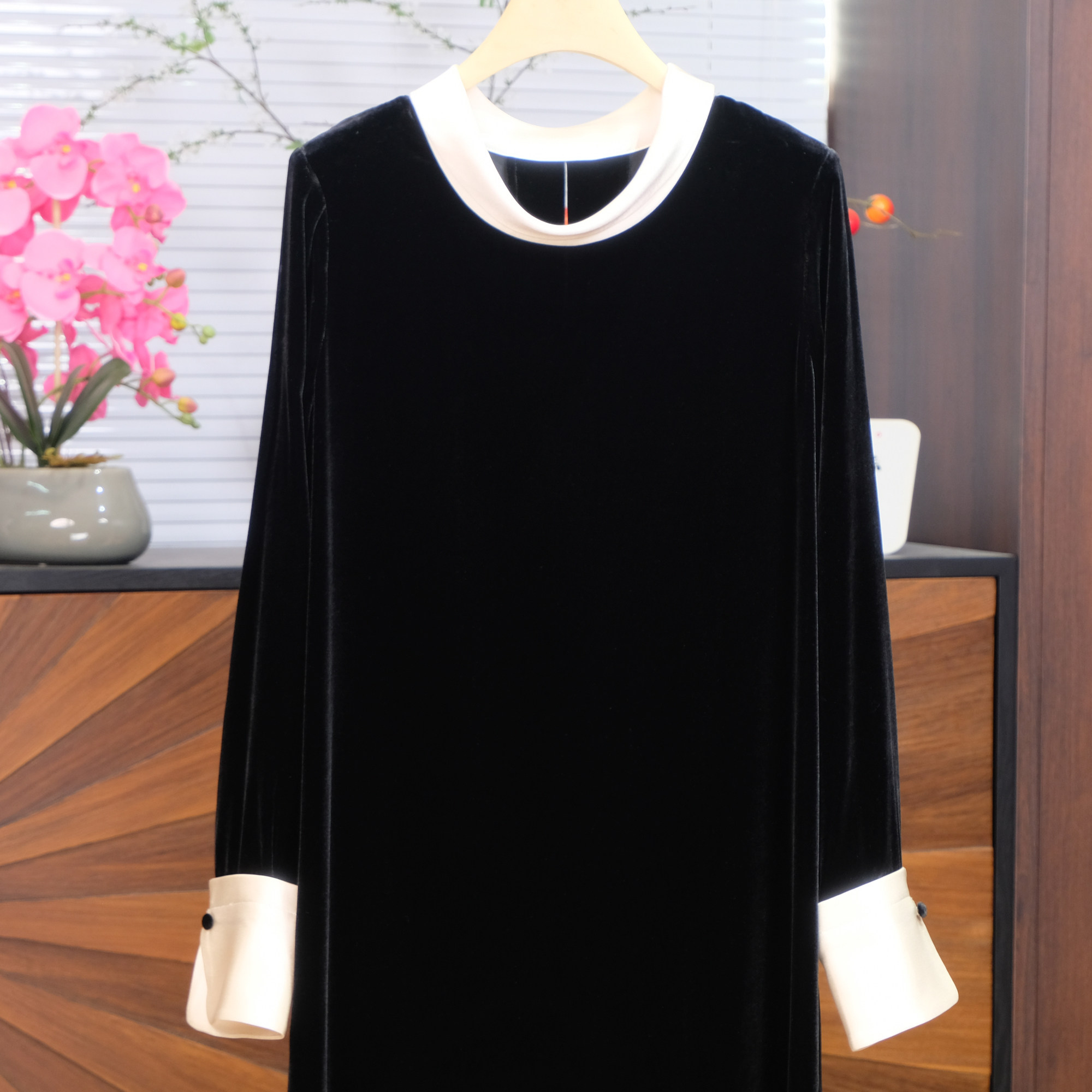 轻熟风黑色丝绒连衣裙女圆领长袖中长款高级感显瘦气质裙