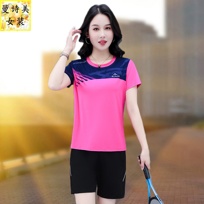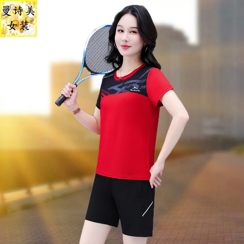冰丝运动服套装女夏季2025年新妈妈宽松透气羽毛球短袖短裤两件套