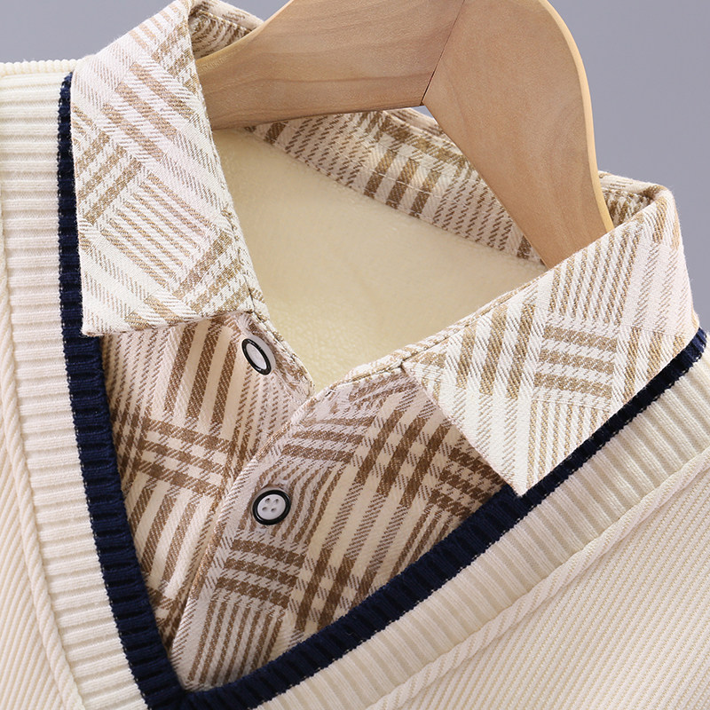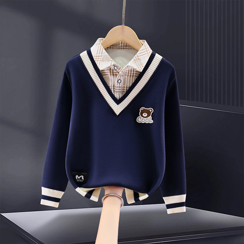 男童卫衣假两件秋冬款2025新款中大童加绒加厚儿童男孩学院风保暖