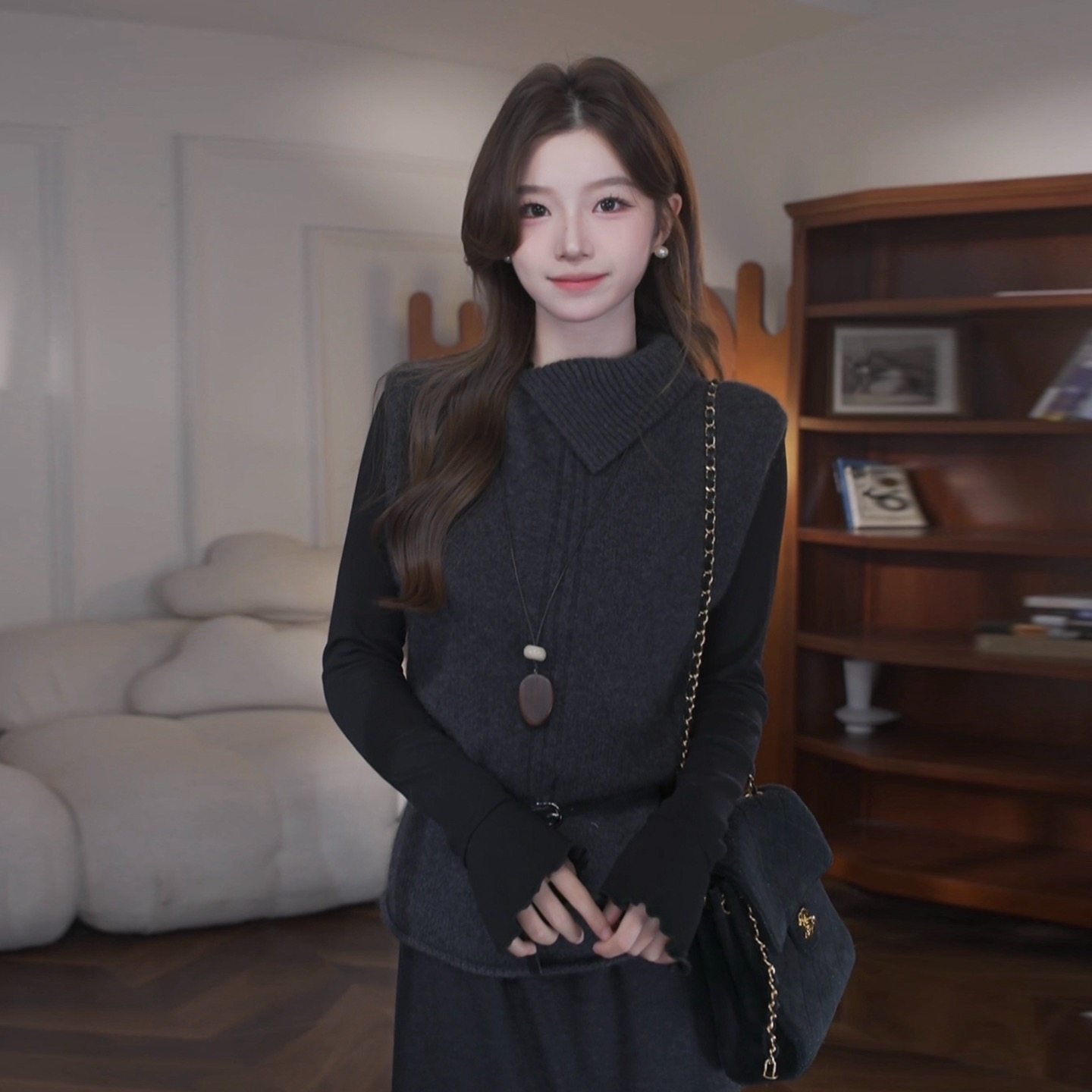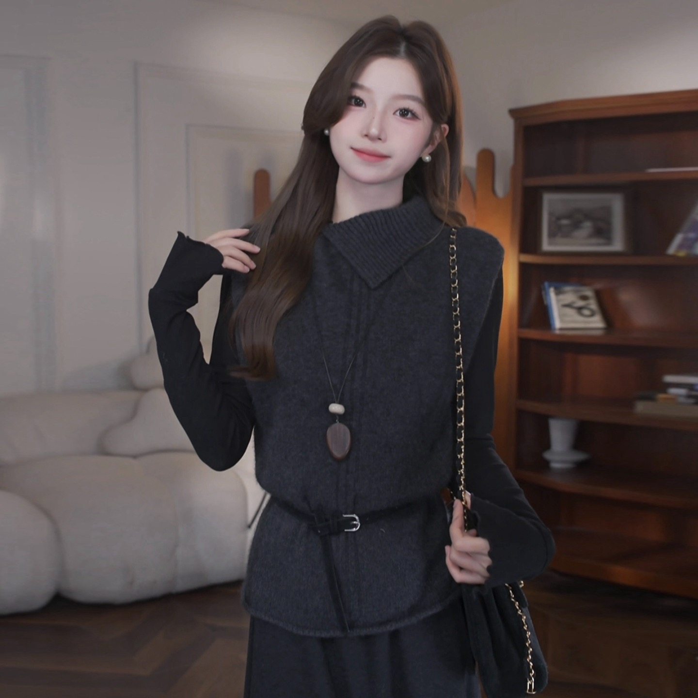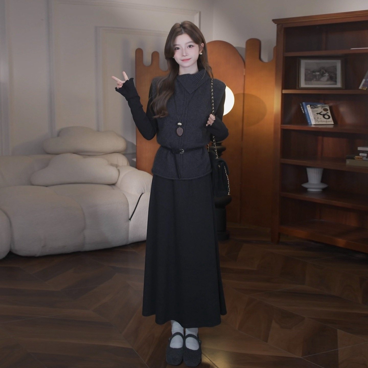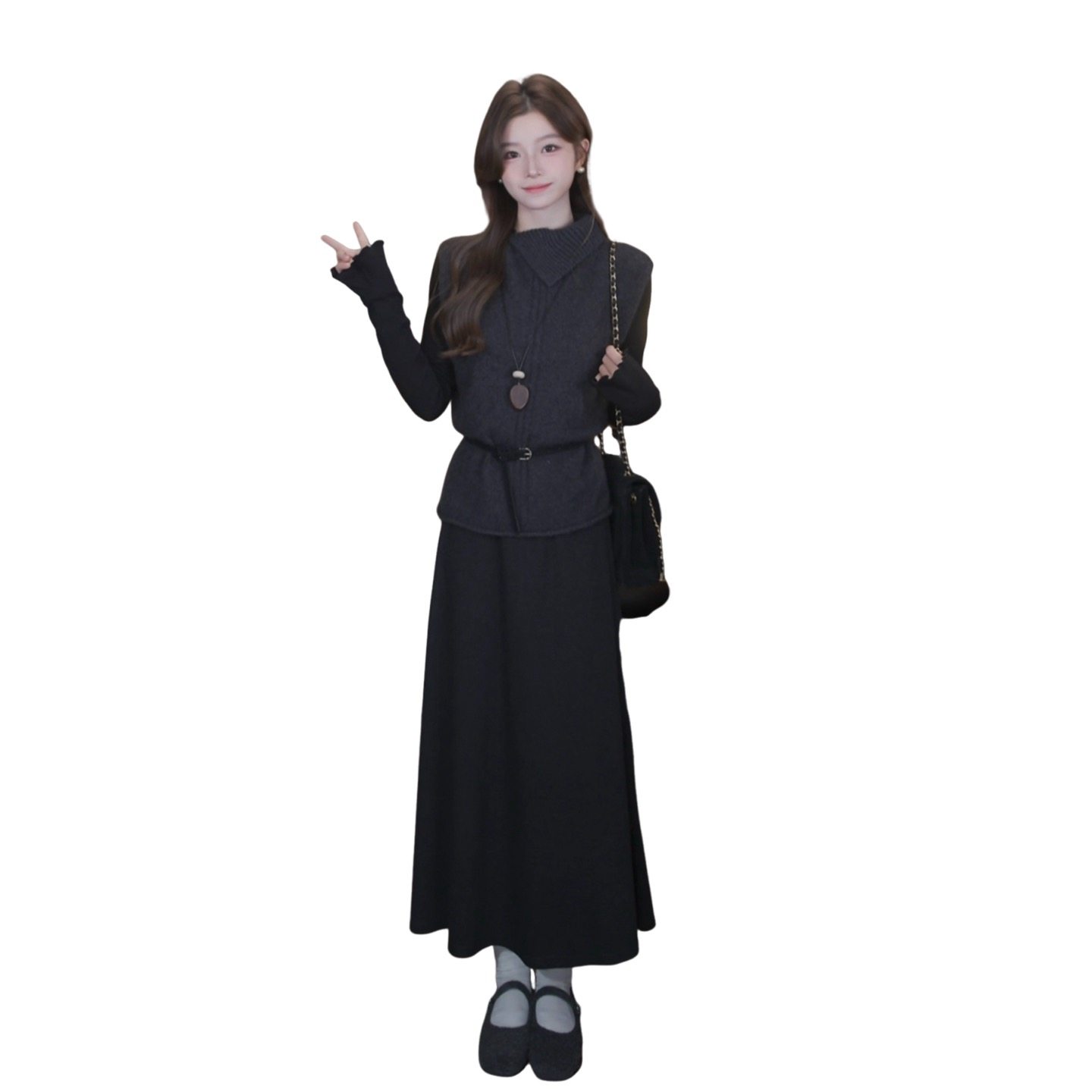 黑色内搭长袖连衣裙子女2026新款秋冬季韩系收腰针织毛衣套装长裙
