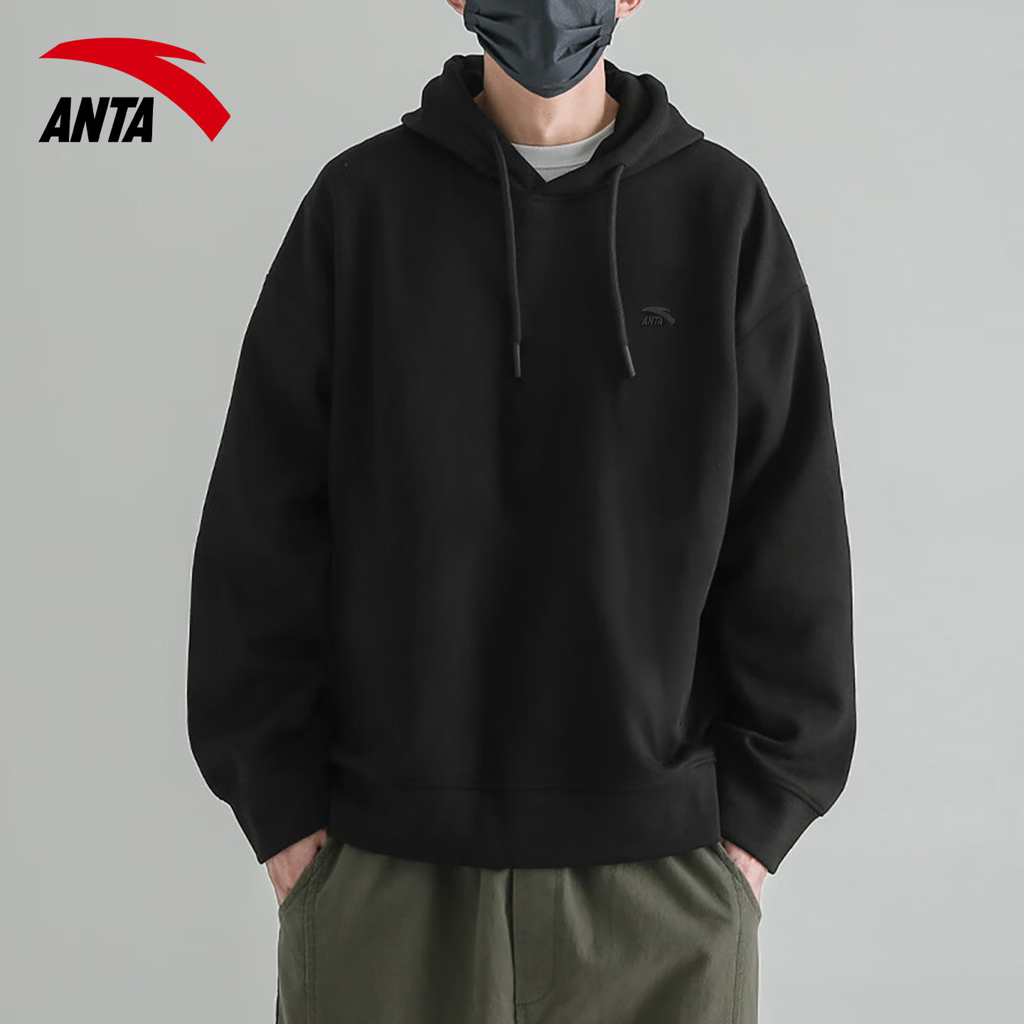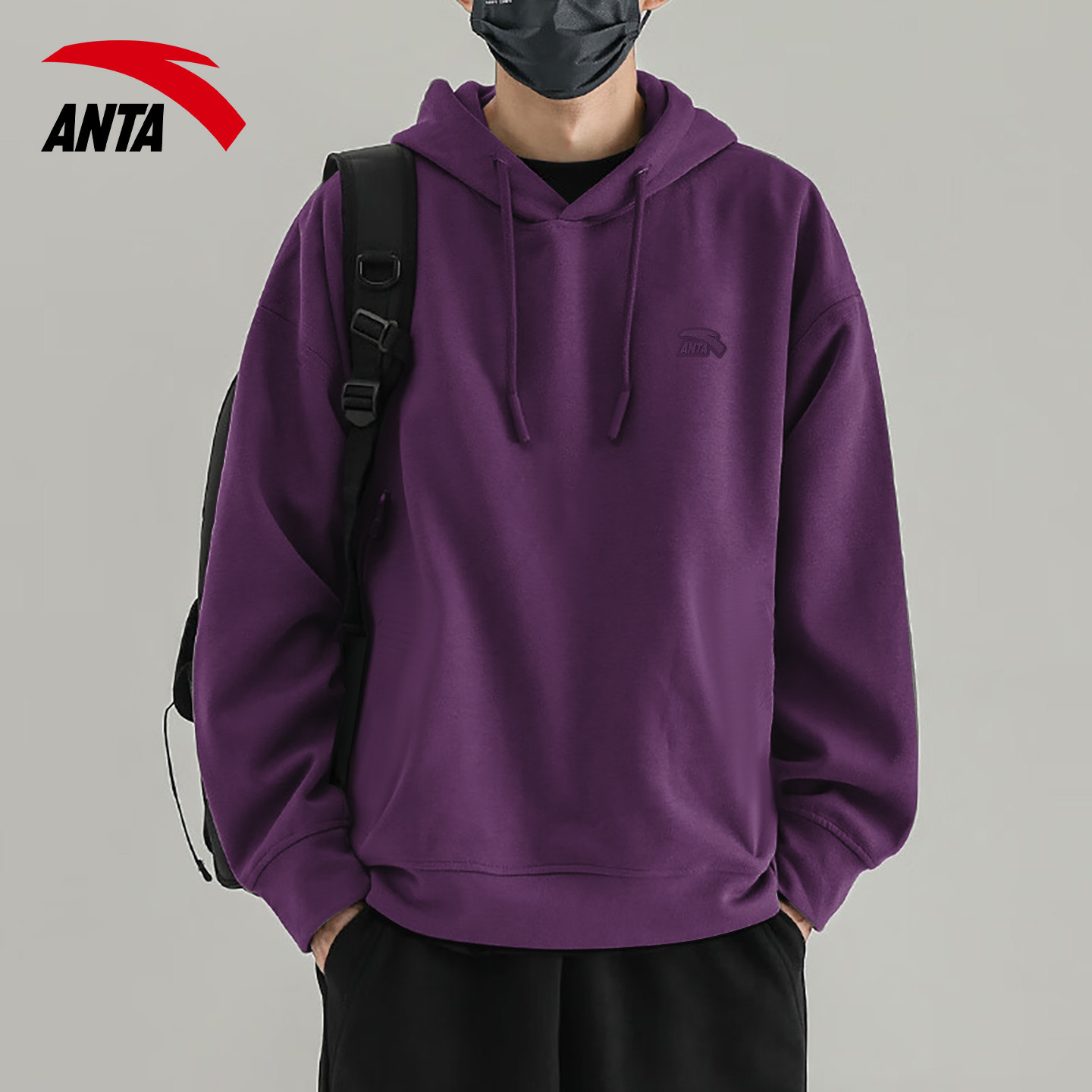 安踏连帽卫衣男款酒红色上衣春秋季新款套头衫宽松秋冬款加绒外套