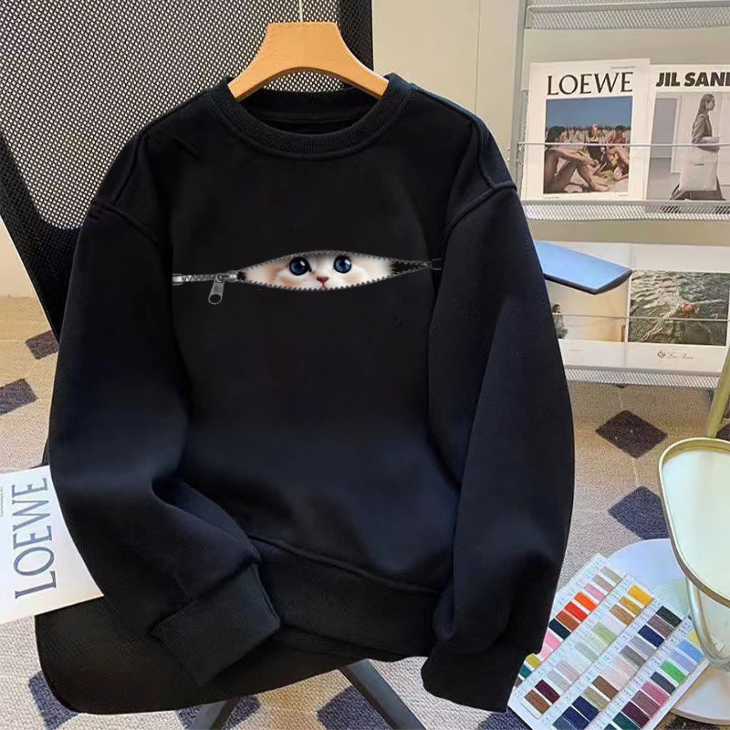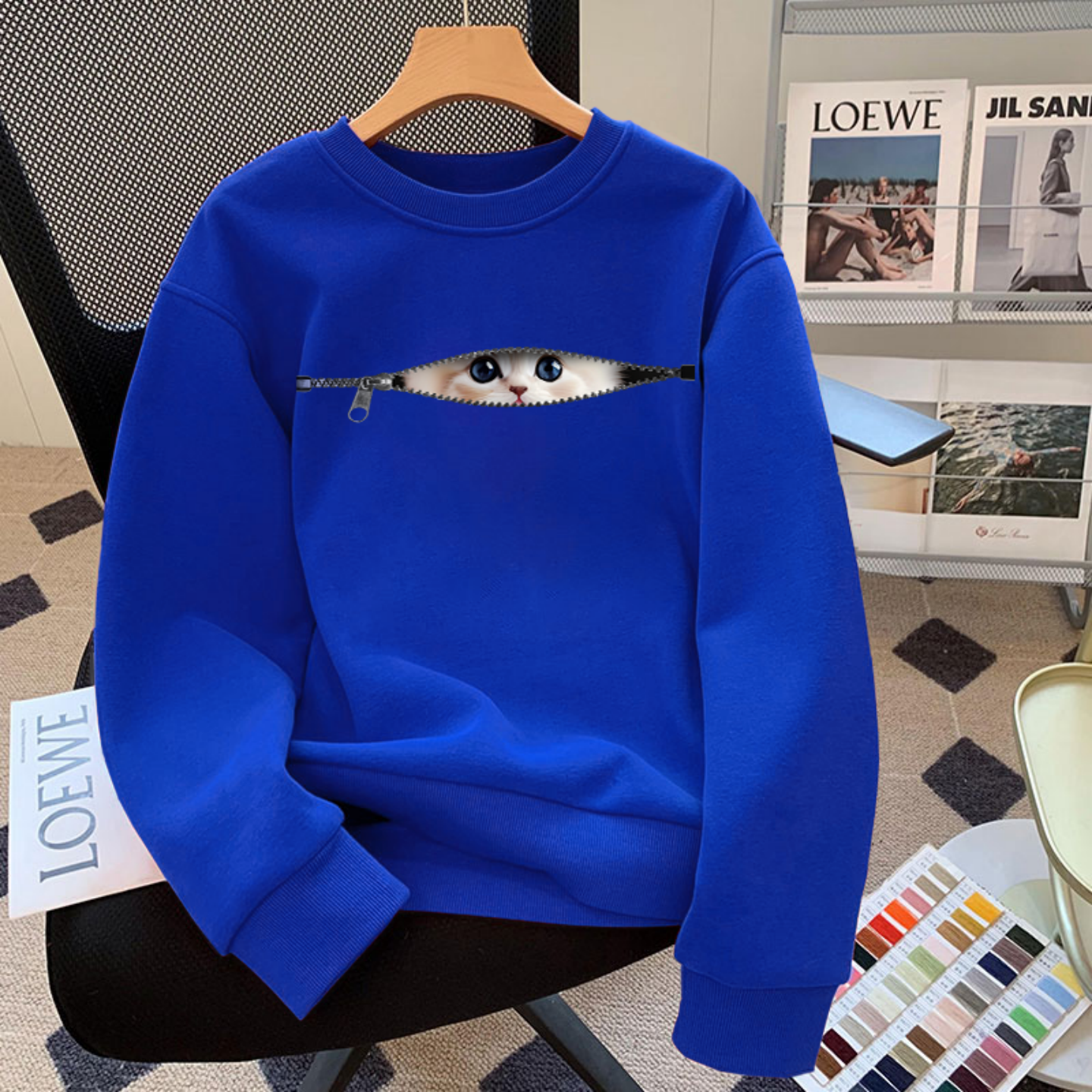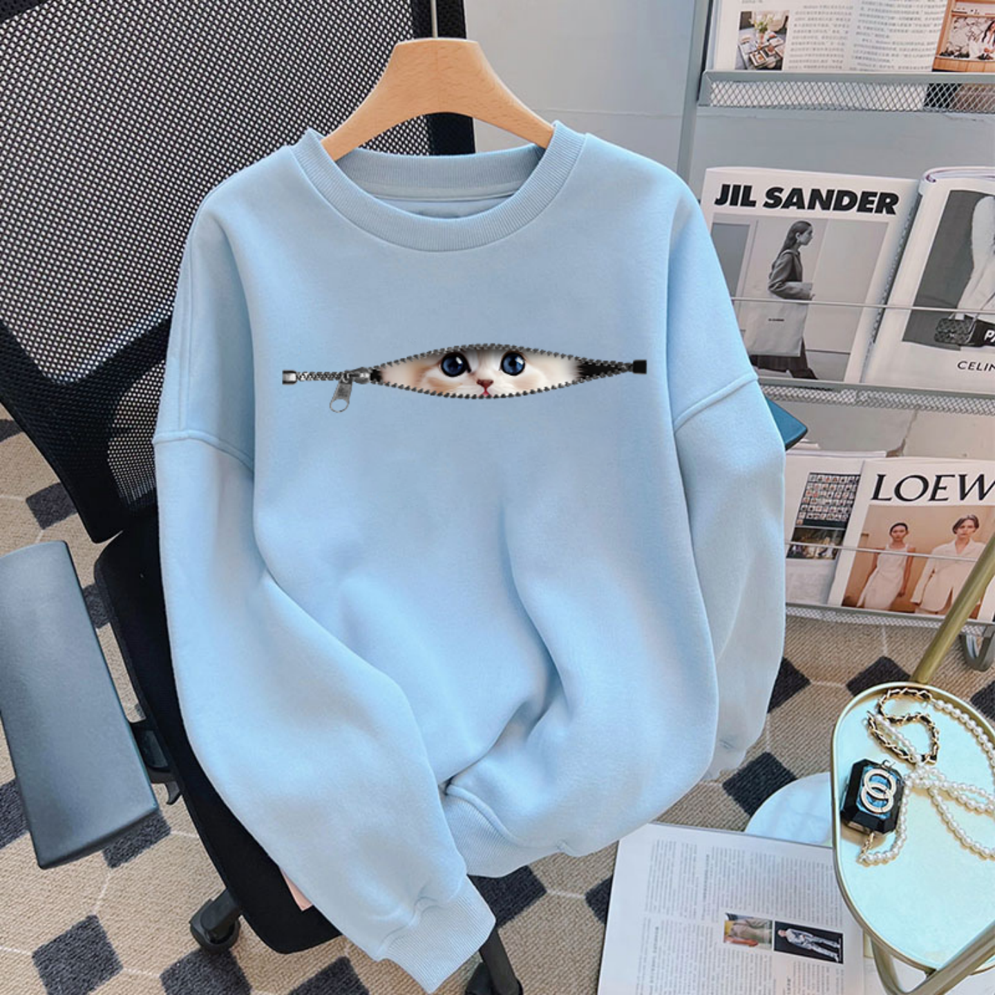 猫咪圆领卫衣女款2026秋冬新款加绒加厚白灰色外套减龄中长款上衣