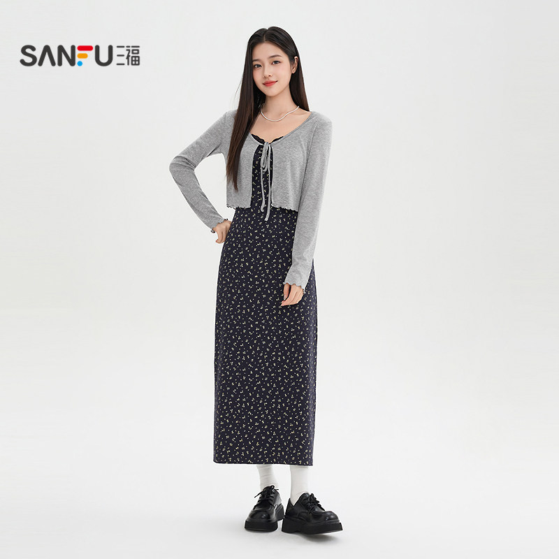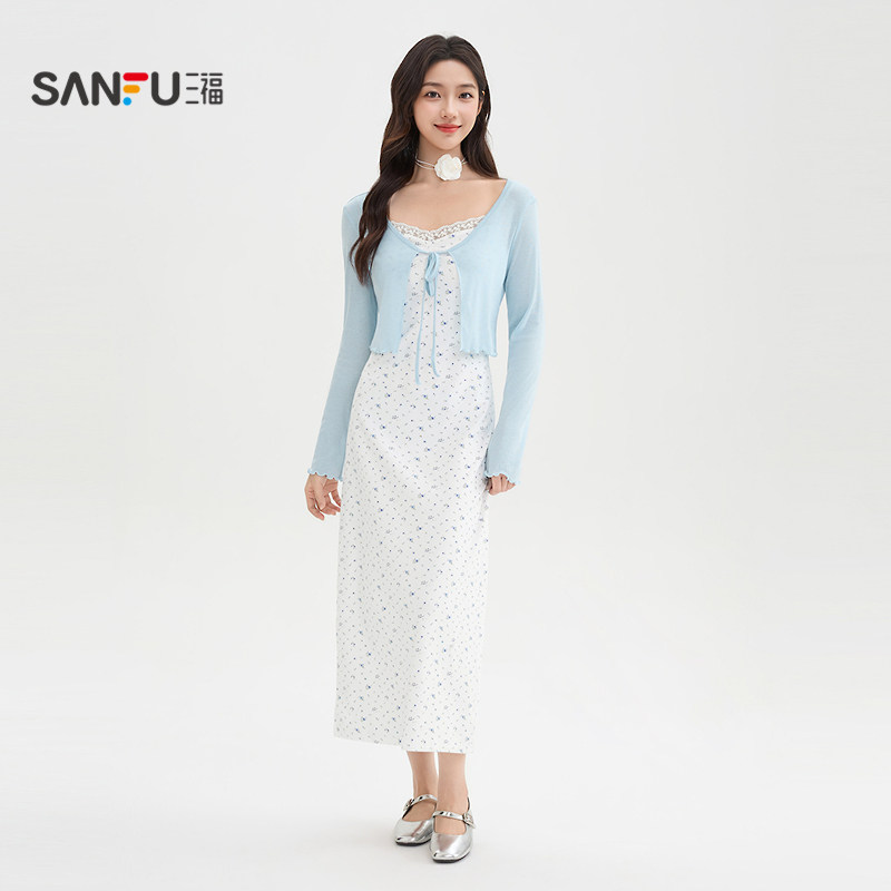 三福连衣裙套装2026新款春季气质碎花绑带吊带长裙披肩两件套女装