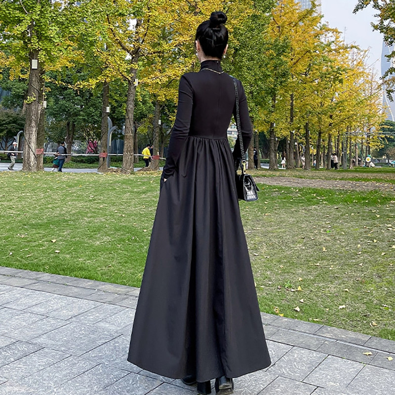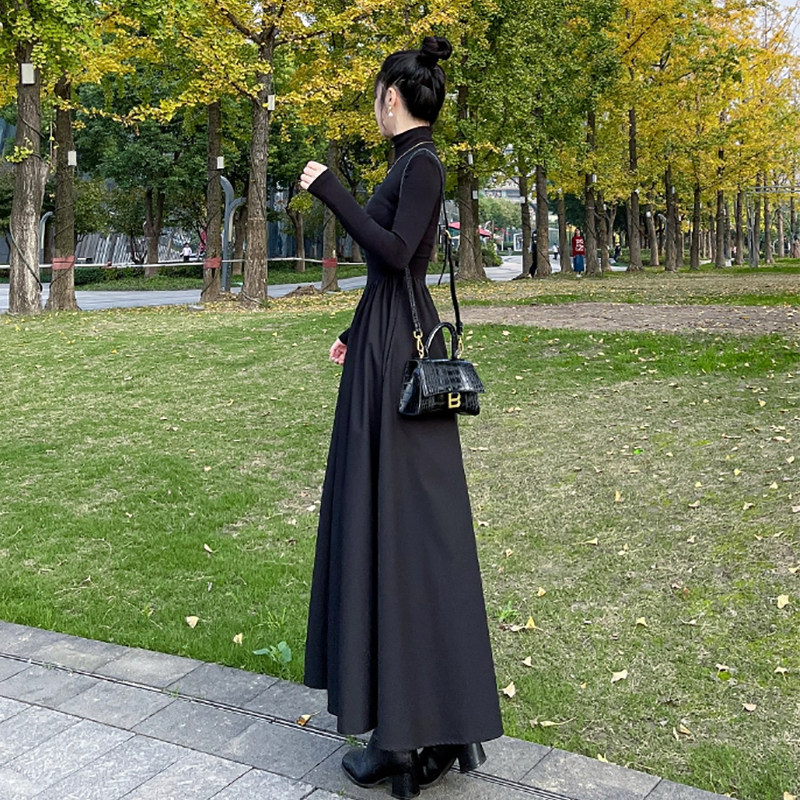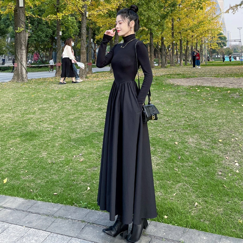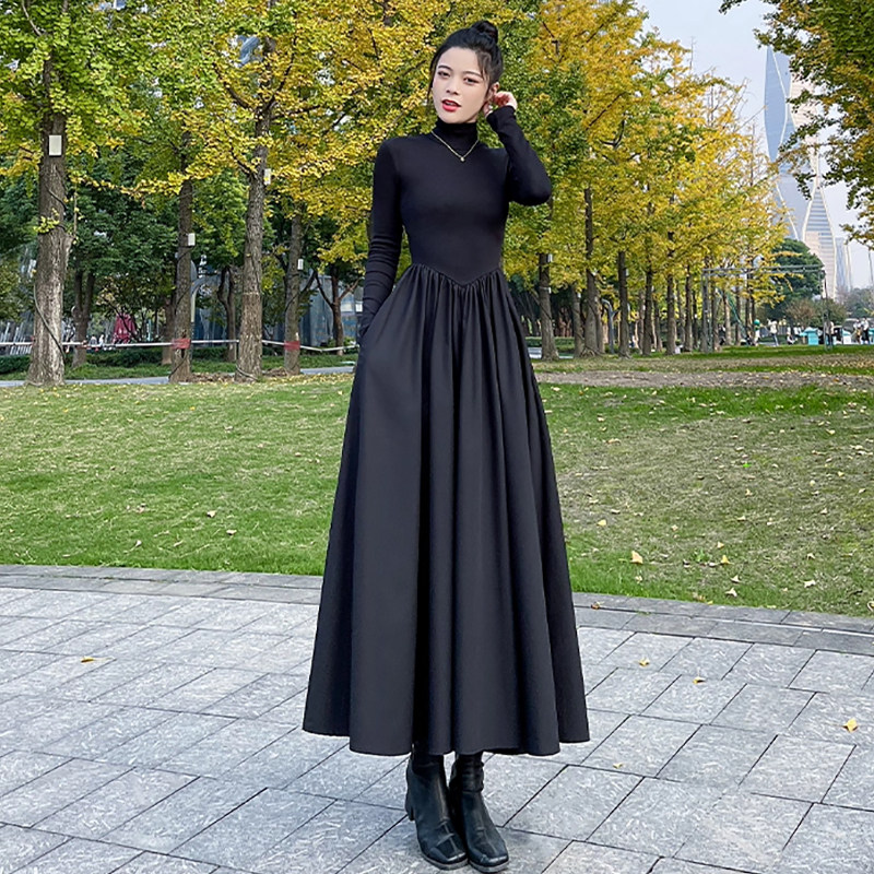 黑色赫本风半高领连衣裙女2025秋冬新款收腰显瘦气质长裙大摆裙子